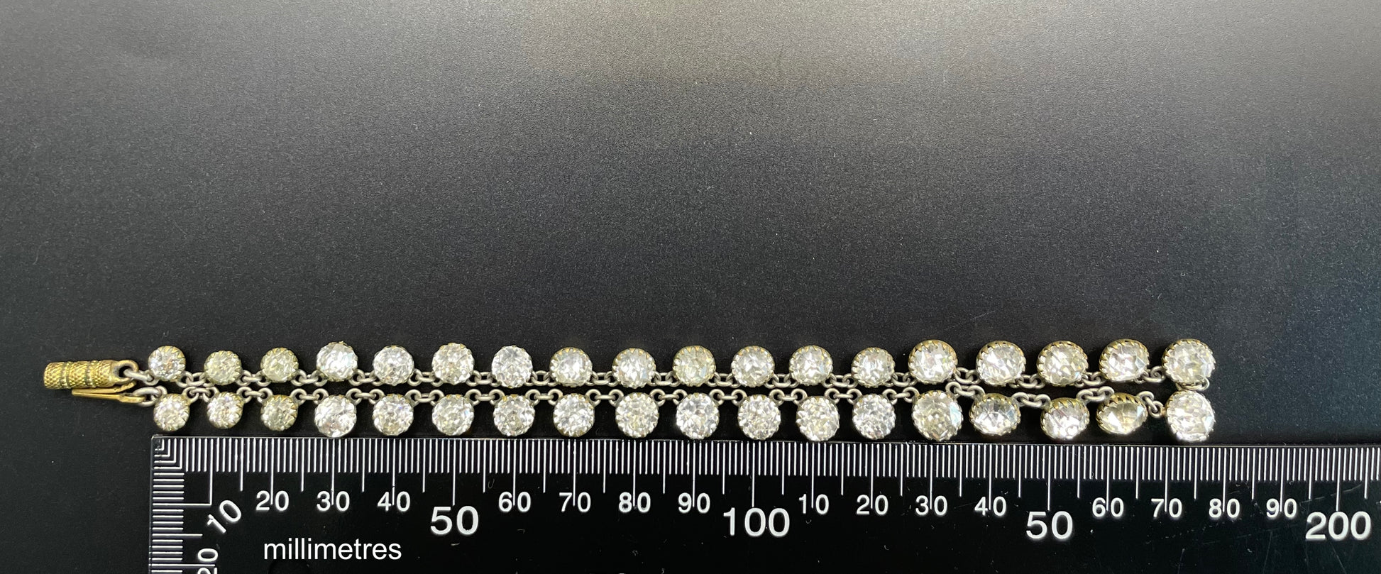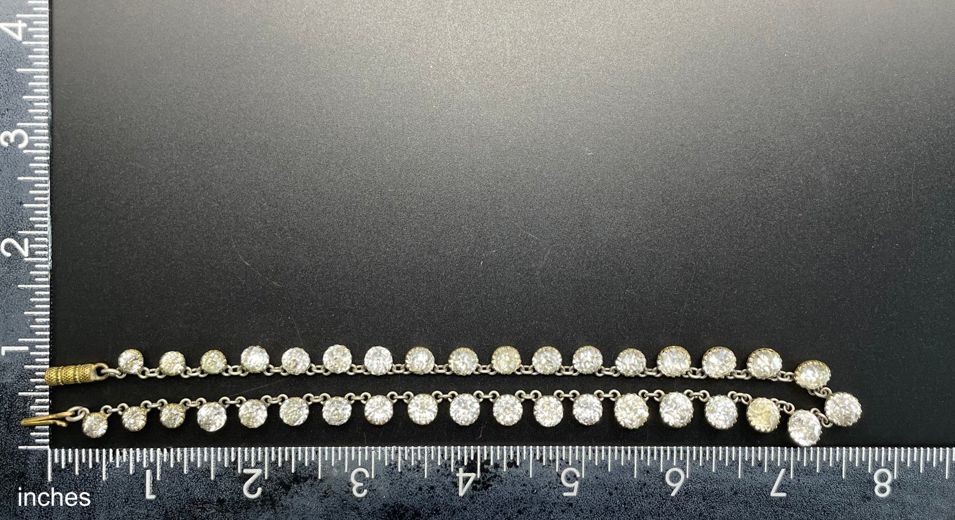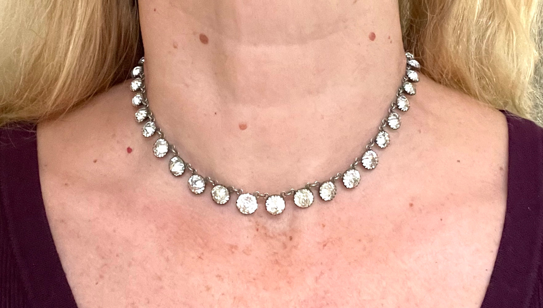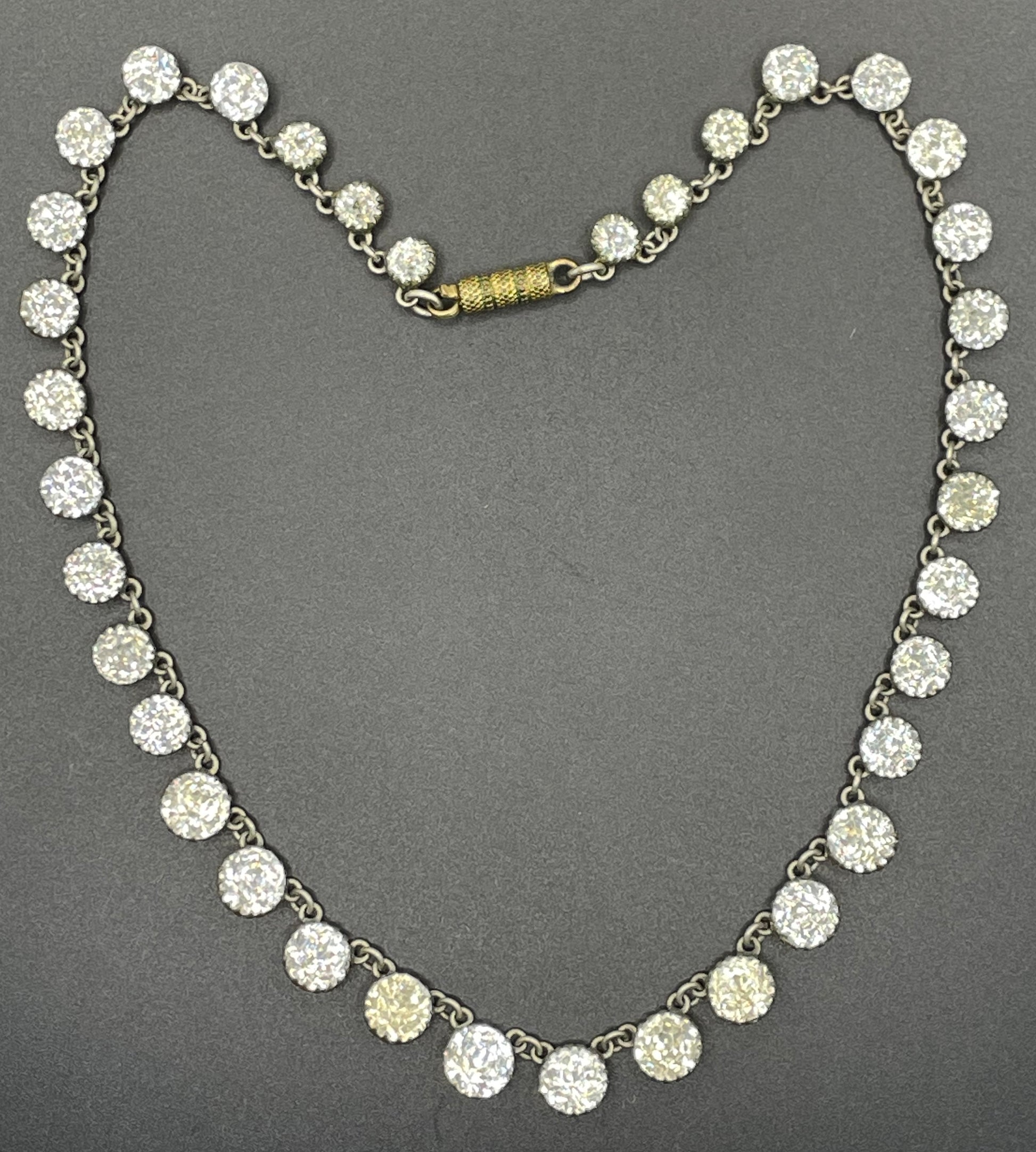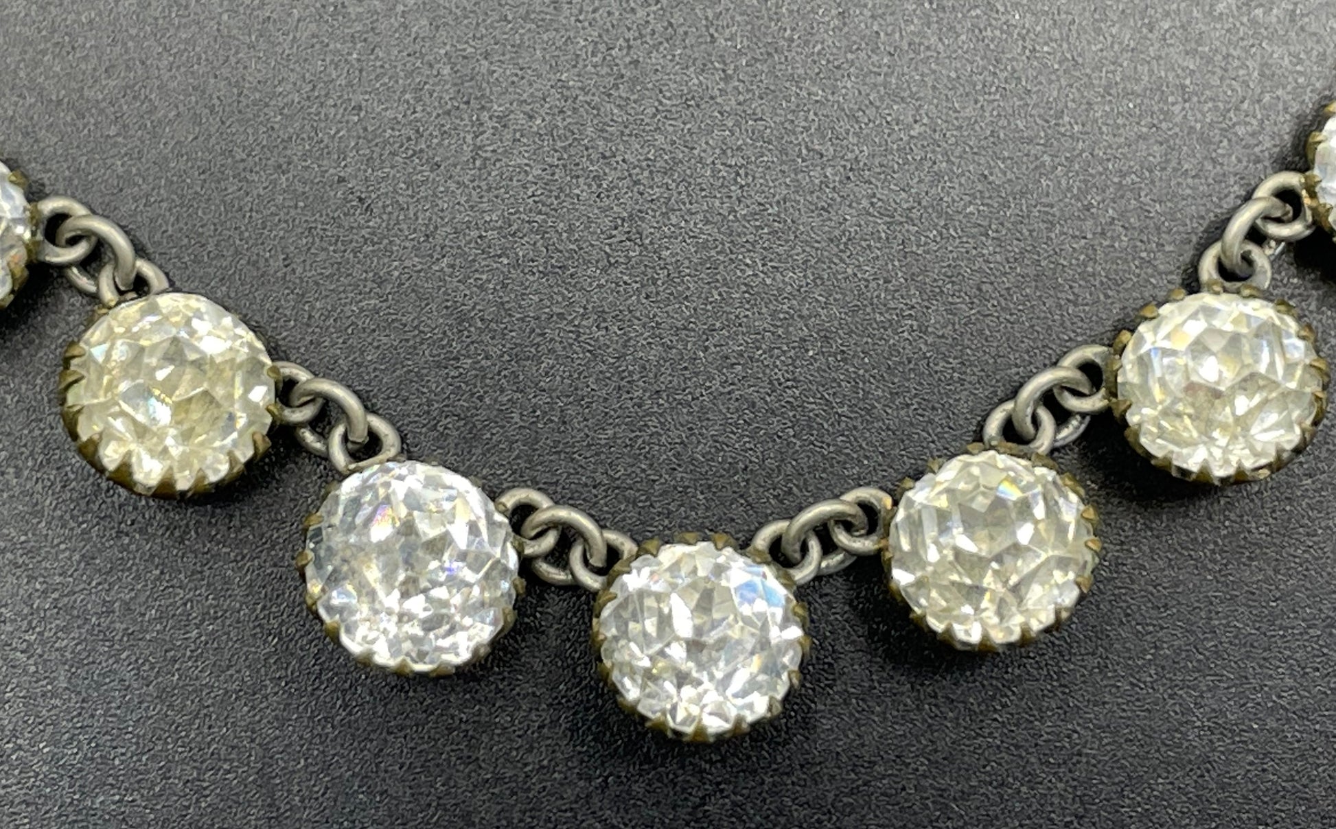 The stones are all identical in size and are remarkably bright and sparkling - these foiled settings allow the stones to stay bright. This is a beautiful piece with a slim-fitting choker length of about 15 inches. It fastens with an old Victorian push-in clasp in a gold tone metal.