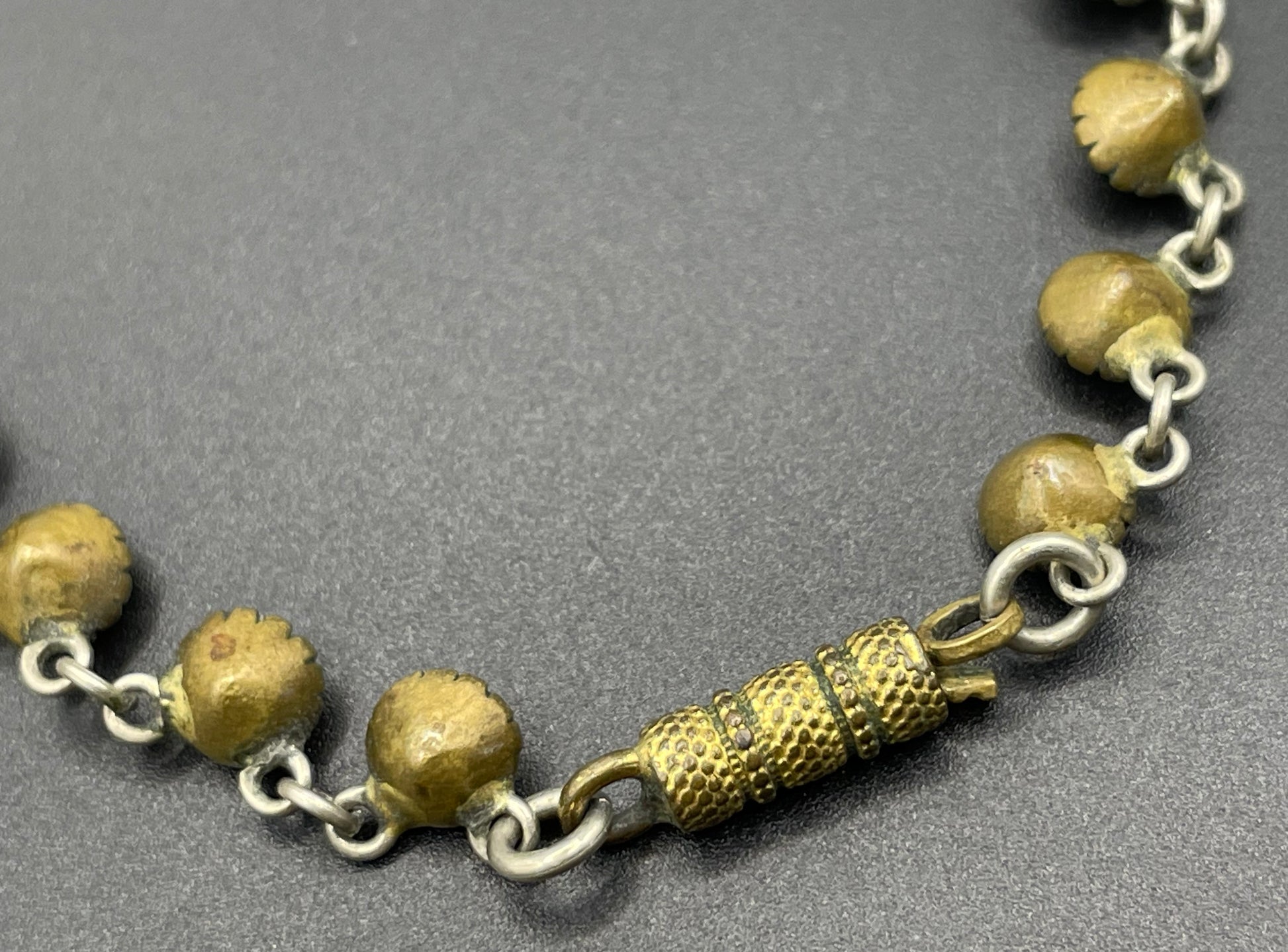 Beautiful 19th Century Victorian gilt metal and sparkling paste riviere necklace. The necklace consists of linked individual panels each containing a large, faceted clear paste rhinestone claw set in a cup back setting with a smooth closed mushroom back. I was surprised to find the metal did not test positive for sterling silver - I had thought it was a gilded silver. It could be a lower grade silver or even simply brass cups.