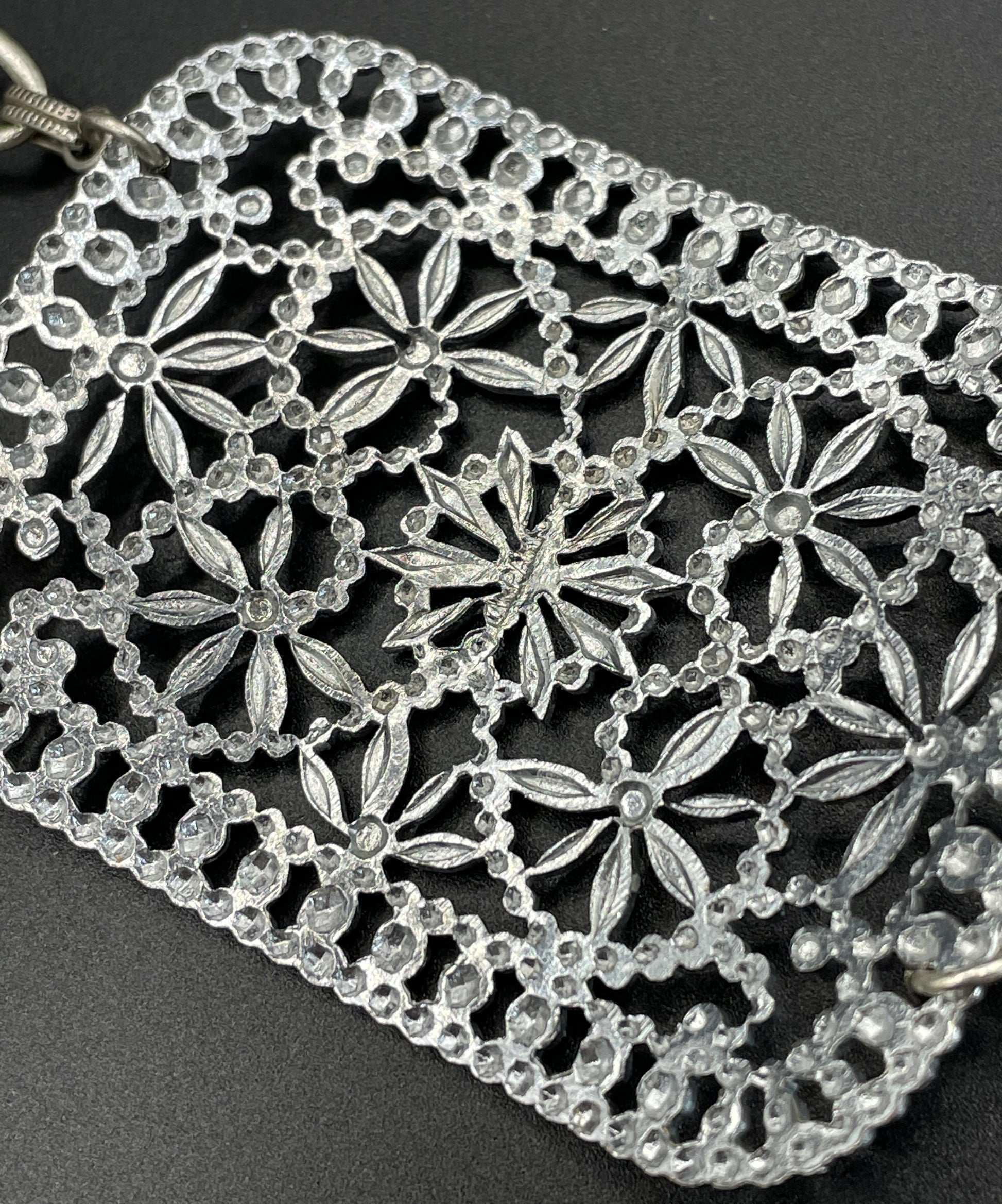 Antique cut steel double panel bracelet with lovely faceted silver tone surfaces on two large rectangular panels. Panels like these used to be used as shoe buckles/clips, but these have been incorporated into a very unusual, armour-like bracelet.