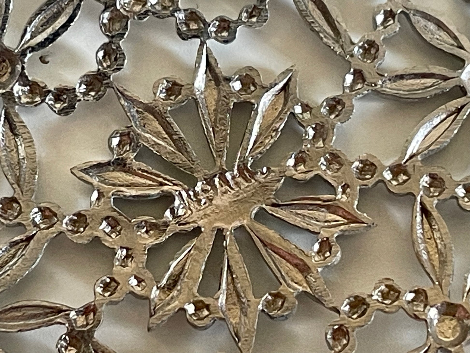 These panels are not like the usual Georgian cut steel in which polished steel cabochons were riveted onto a base plate. Each of these panels is fully moulded into its final shape. They are stamped on the reverse with a word which looks to me like 'PARIS'.