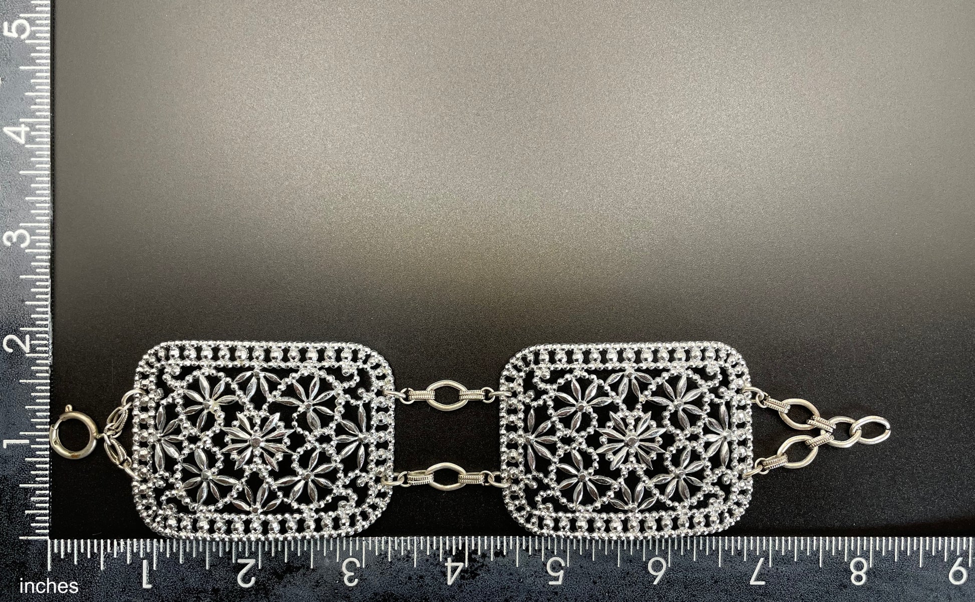 The bracelet has a length of about 8 1/4 inches, which can be slightly adjusted using the spring ring clasp and jump rings on the other side, to ensure that the panels rest comfortably on each side of the wrist.