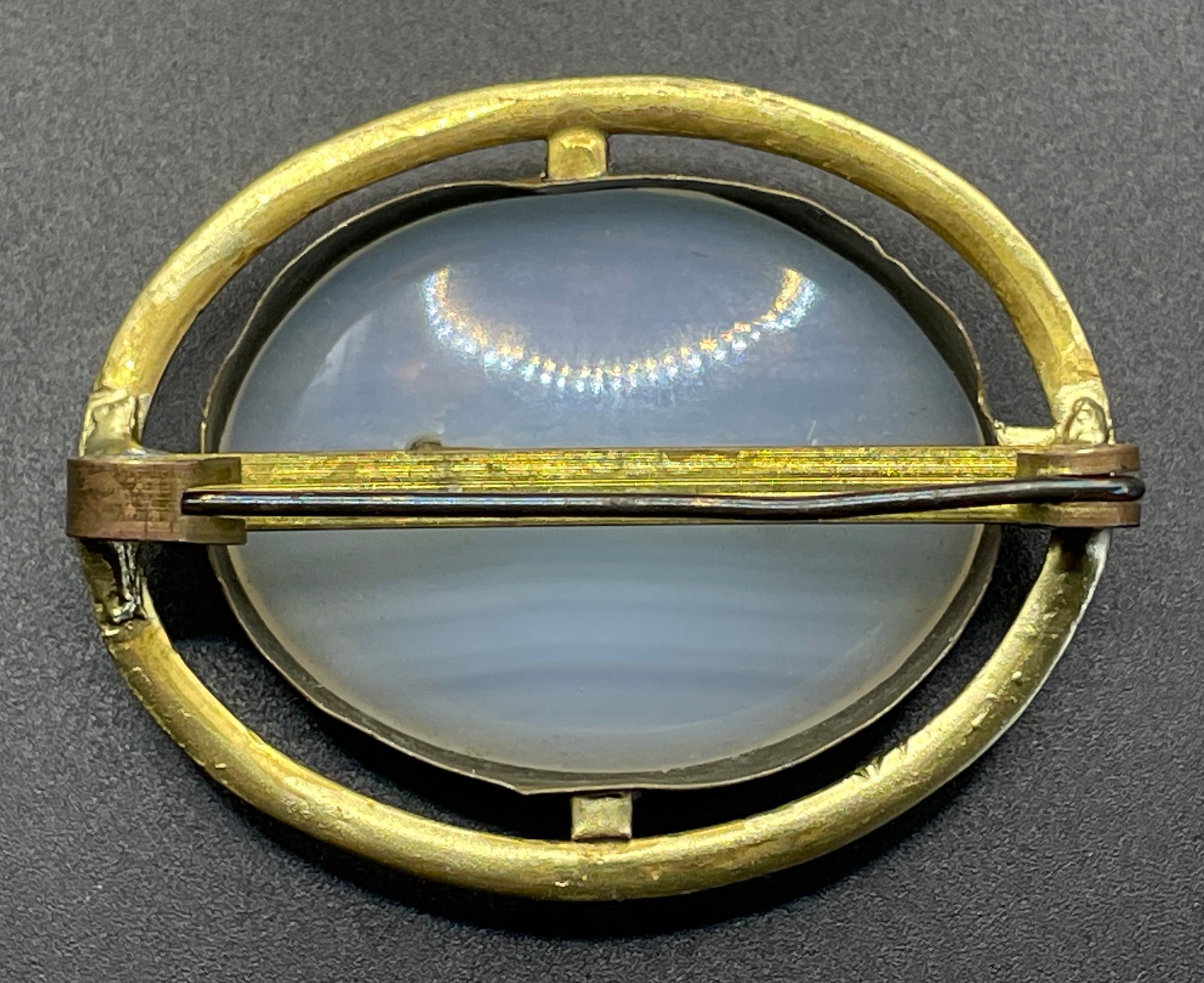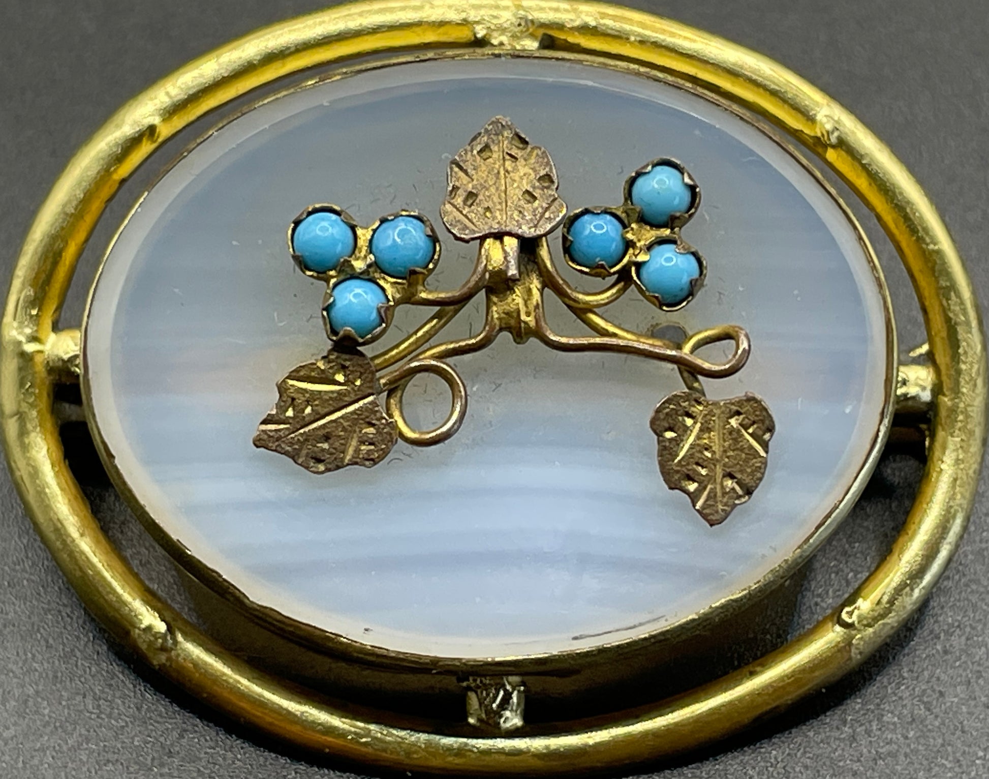 Antique Victorian pinchbeck or gilded/gold plated brooch with a large, oval chalcedony stone decorated with adorable flowers and leaves with turquoise cabochons.