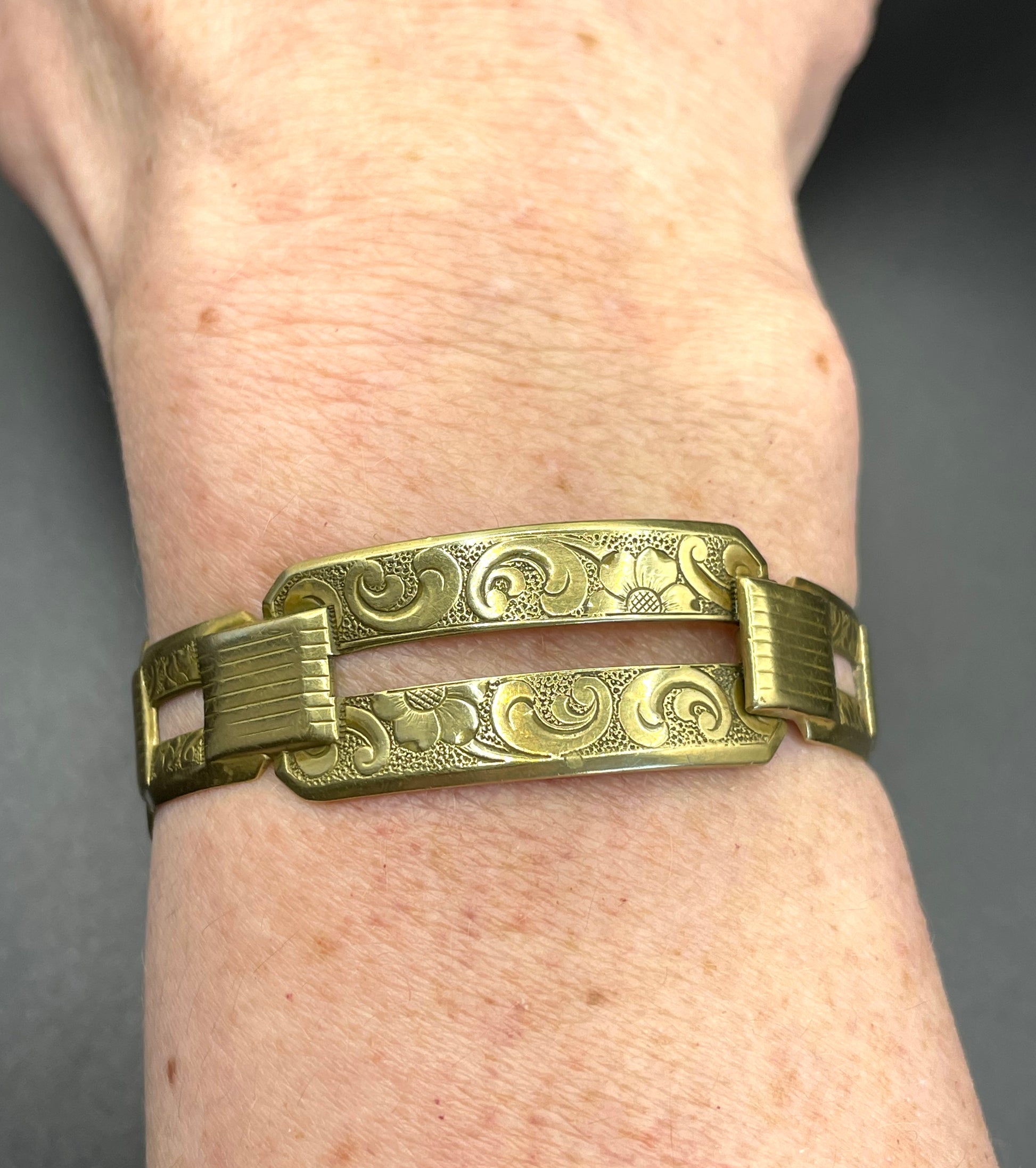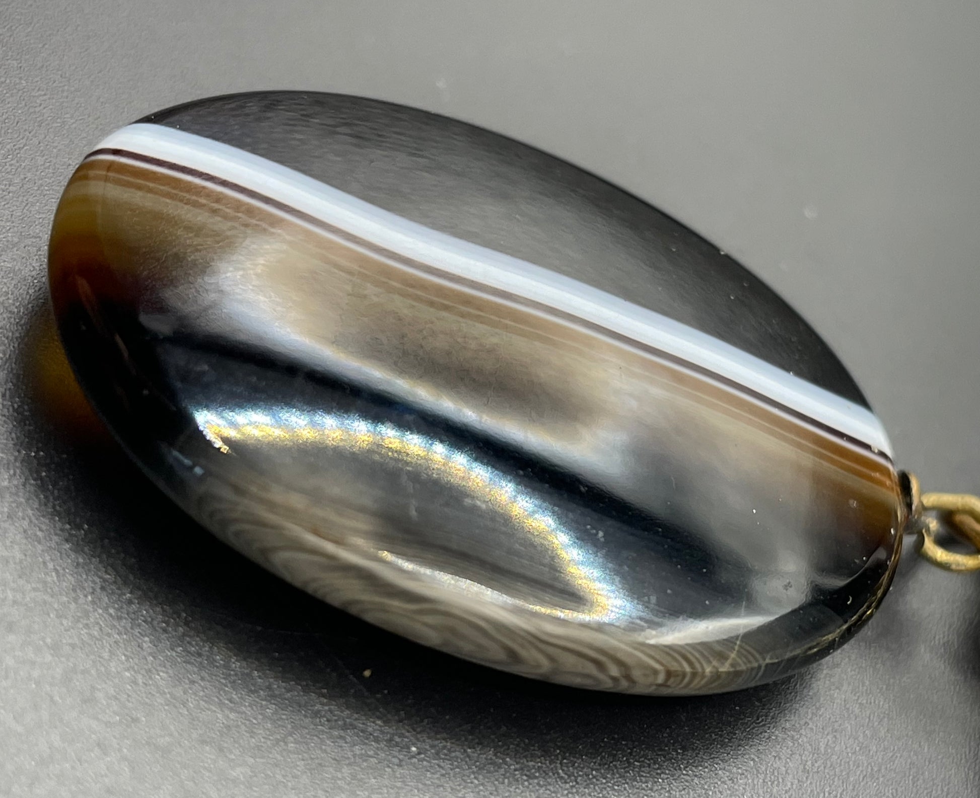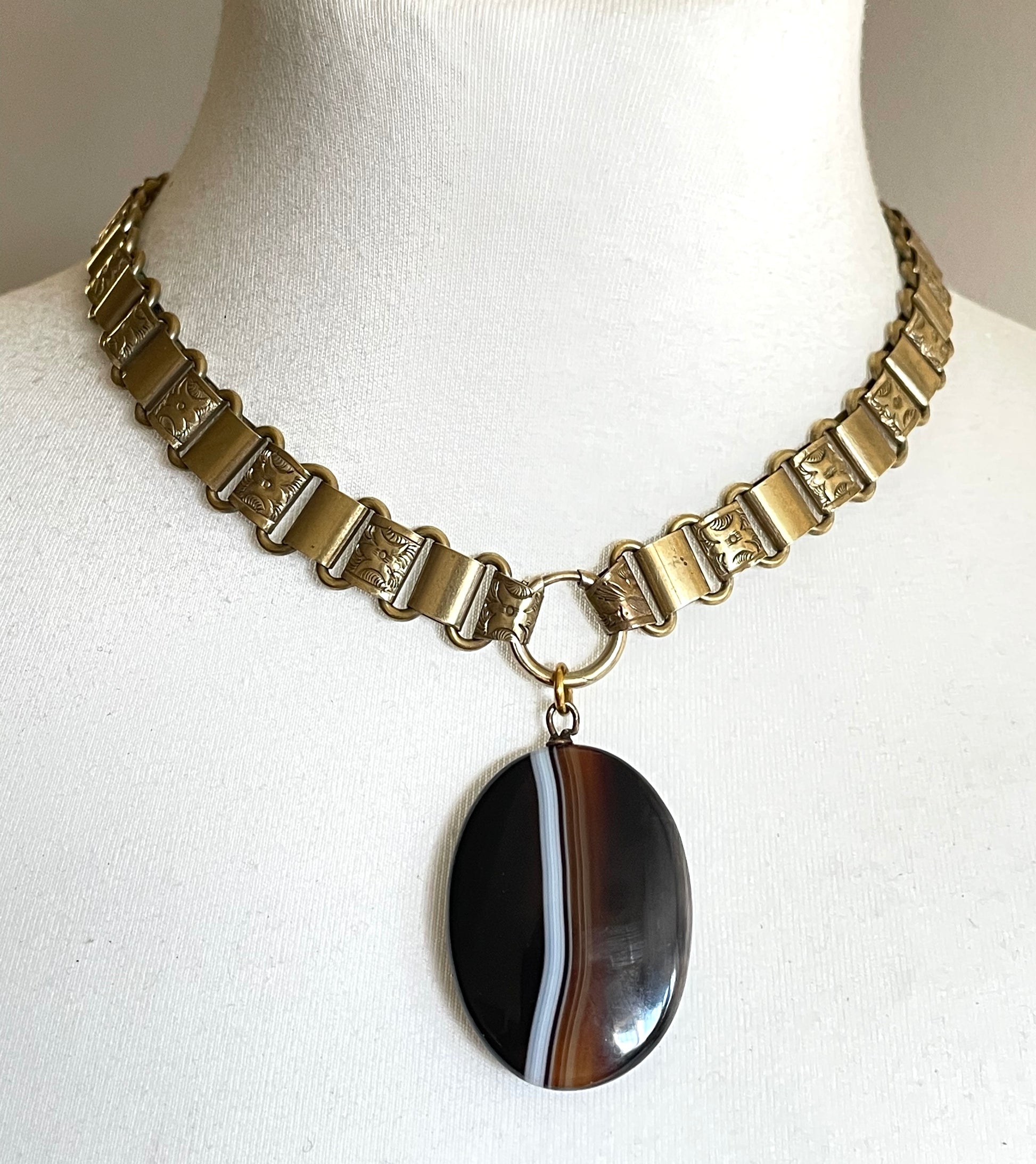 The book chain necklace itself can be worn as a classic choker. The large oval agate pendant can be attached to this choker via the oversized spring ring clasp as pictured or of course as a pendant on any other chain. The pendant has beautiful stripes and striations in the agate in rich browns with black and white tones. The bangle has gorgeous engraving, like some of the links in the bookchain choker.