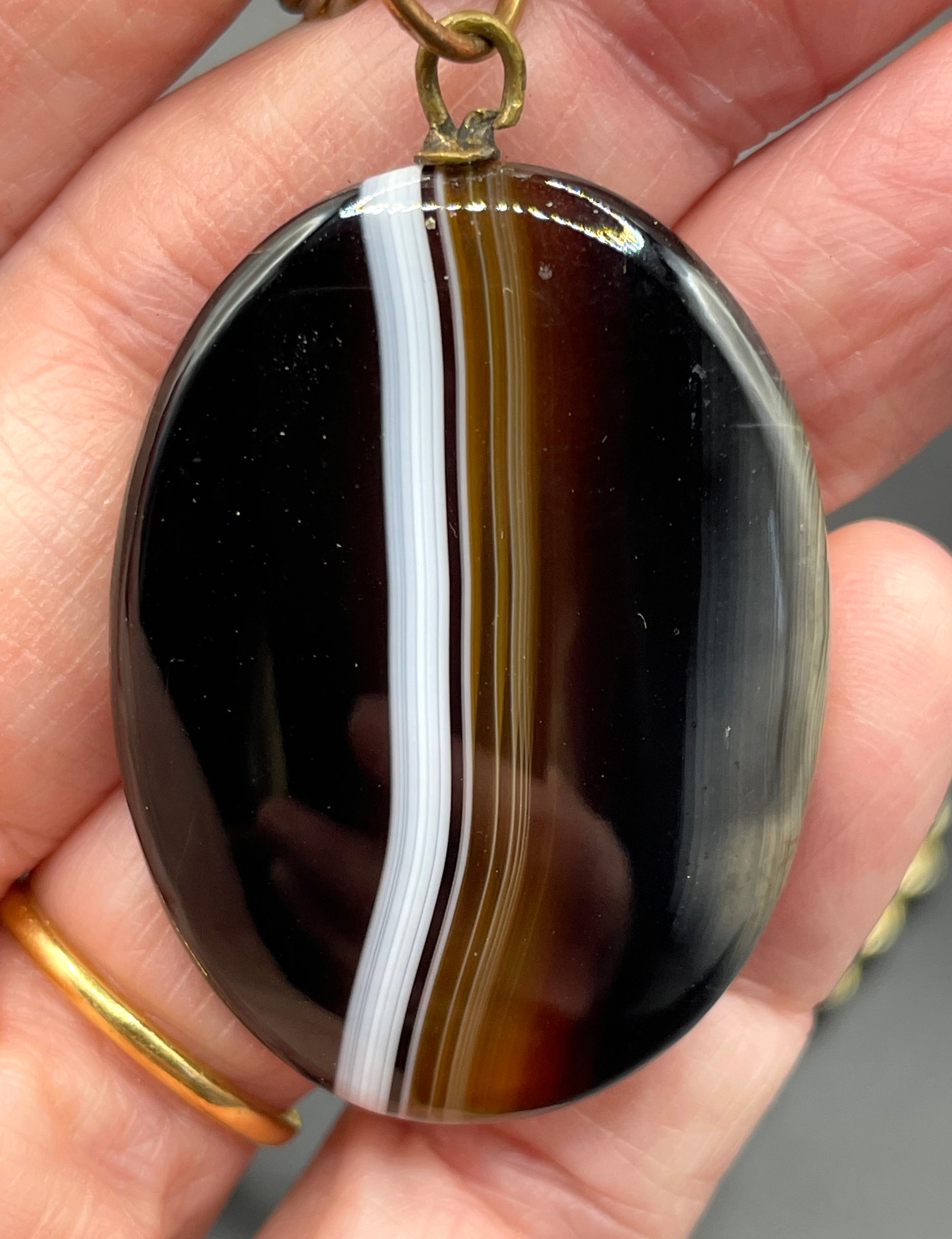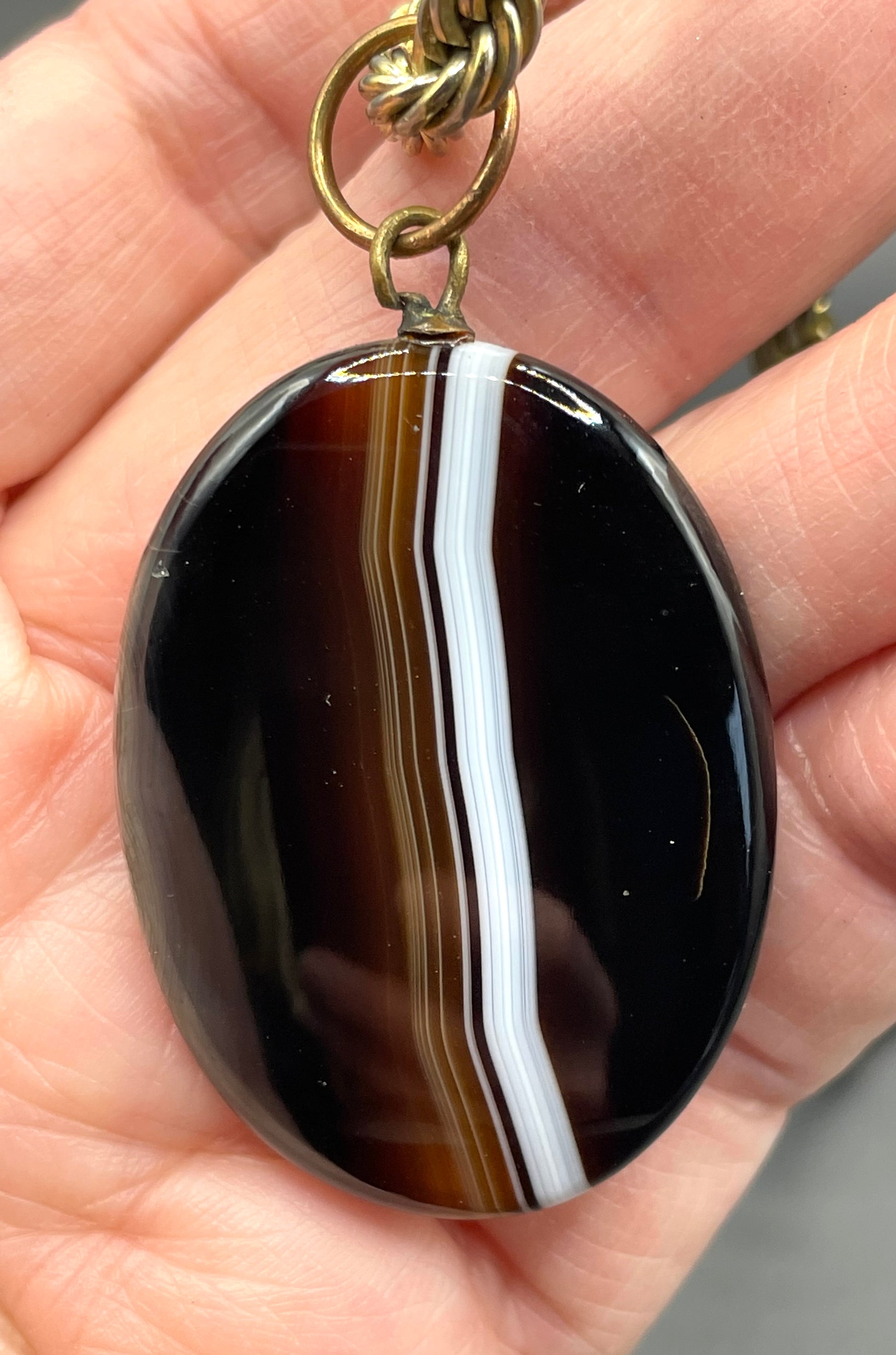 Antique Victorian gold plated or rolled gold bookchain necklace with large oval bullseye agate pendant and bangle set