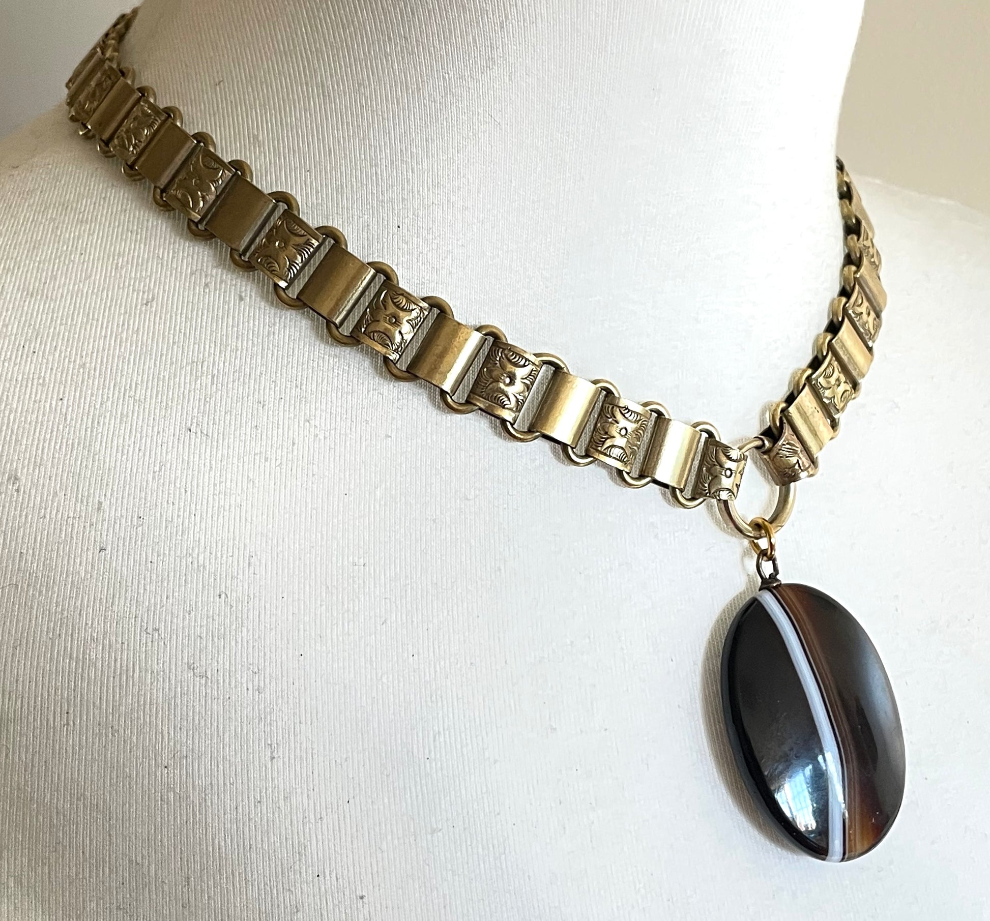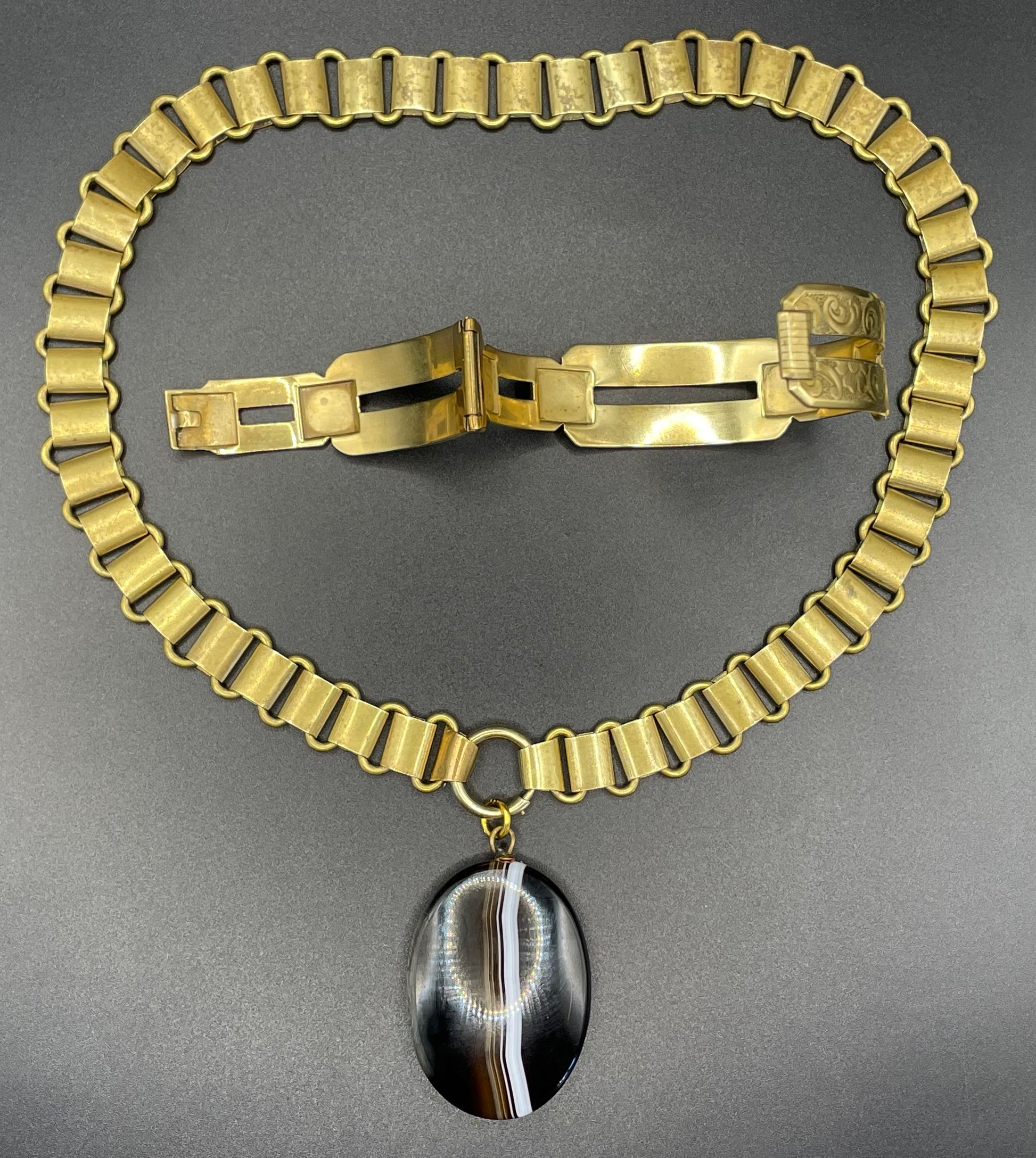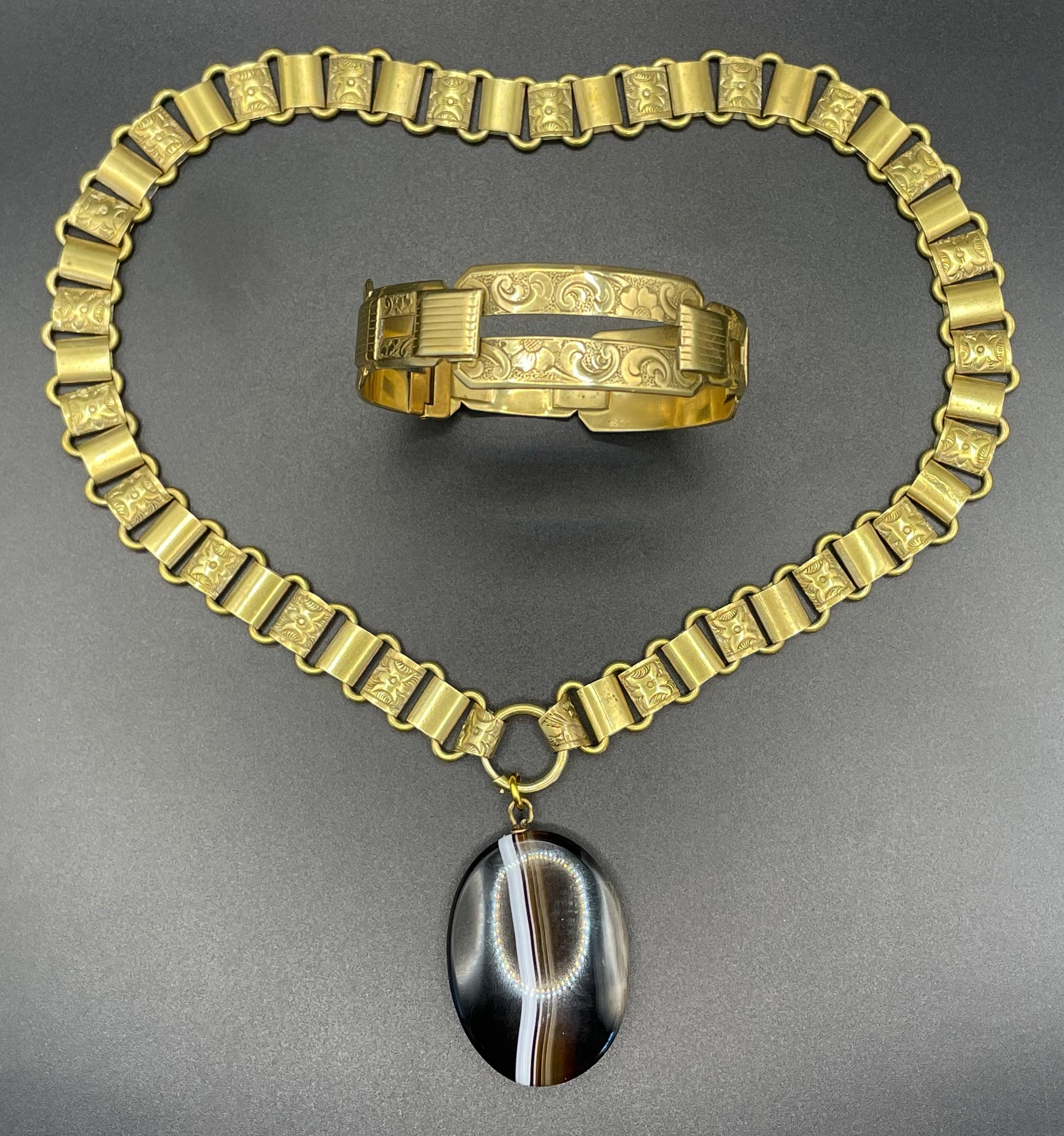 Fabulous antique Victorian yellow gold plated (or rolled gold / gold filled) book chain choker necklace and detachable bullseye/banded agate pendant, with lovely bangle with gorgeous, elaborate engraving. The book chain design emerged during the latter part of the Early Victorian Era, or Romantic Period (1837 to 1860) and was worn at that time with a large locket, cameo or pendant at the front.