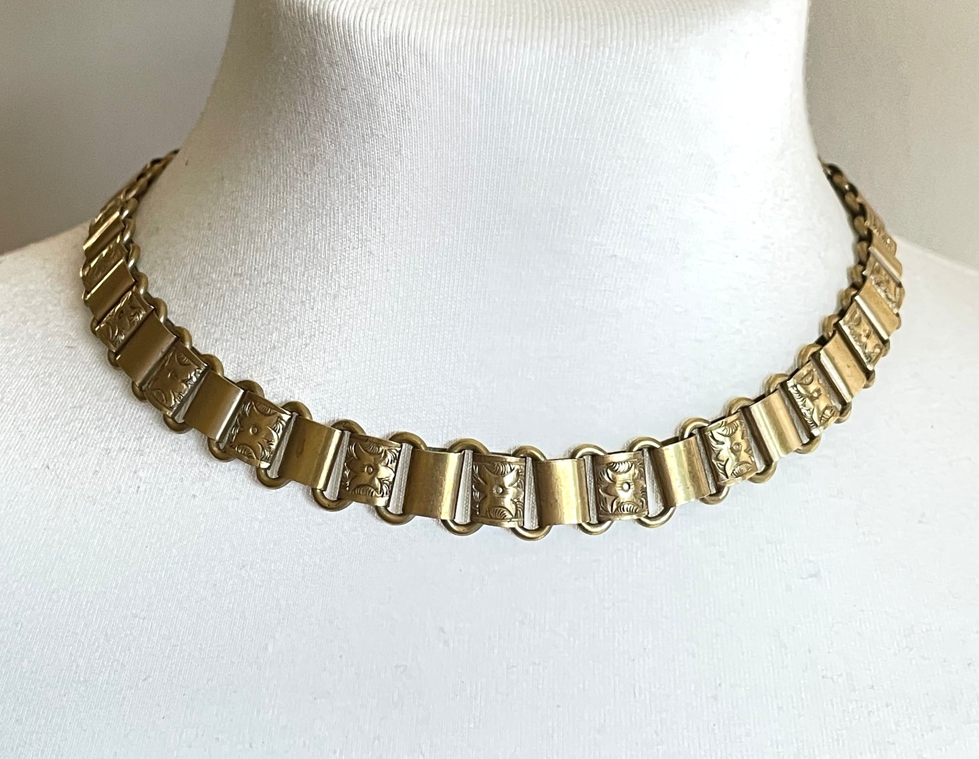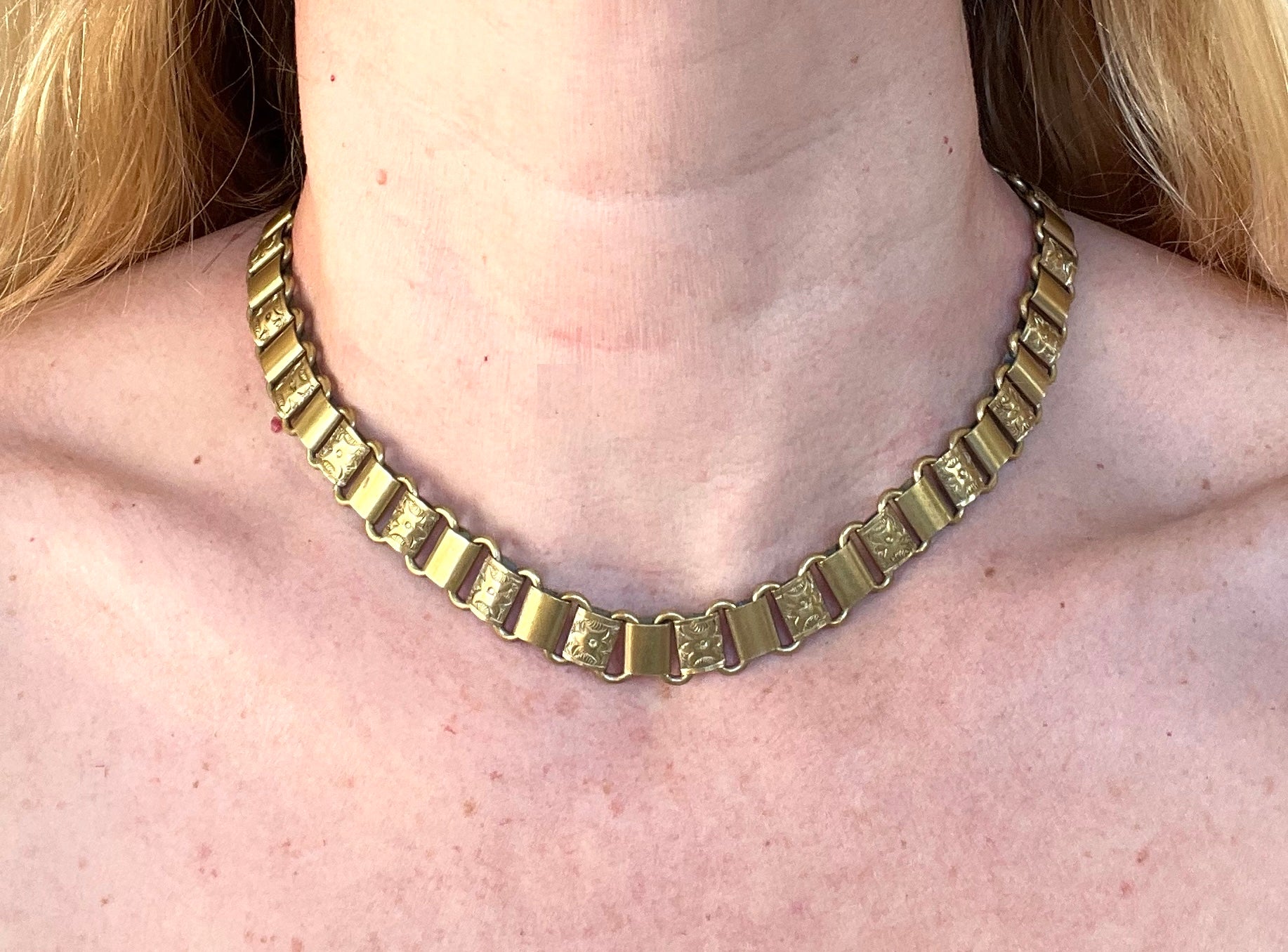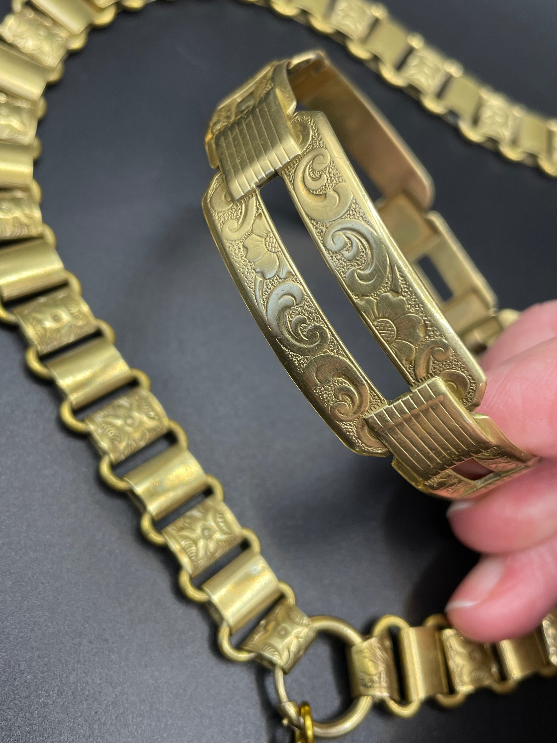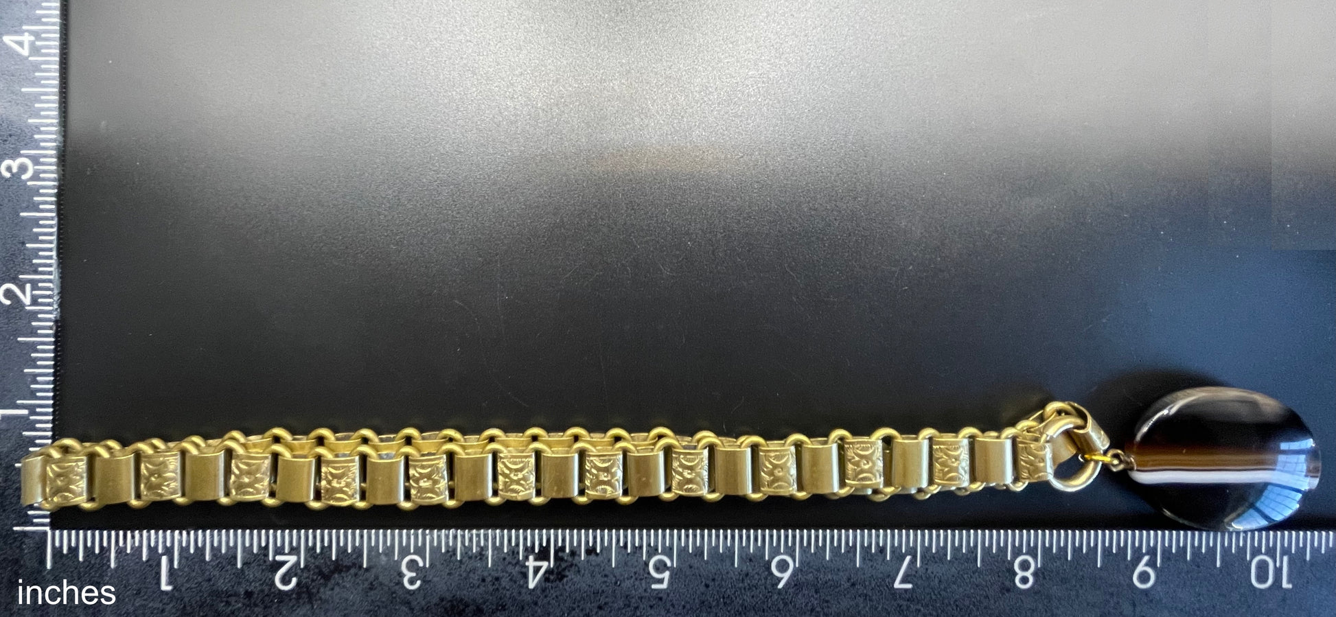 Fabulous antique Victorian yellow gold plated (or rolled gold / gold filled) book chain choker necklace and detachable bullseye/banded agate pendant, with lovely bangle with gorgeous, elaborate engraving. The book chain design emerged during the latter part of the Early Victorian Era, or Romantic Period (1837 to 1860) and was worn at that time with a large locket, cameo or pendant at the front.