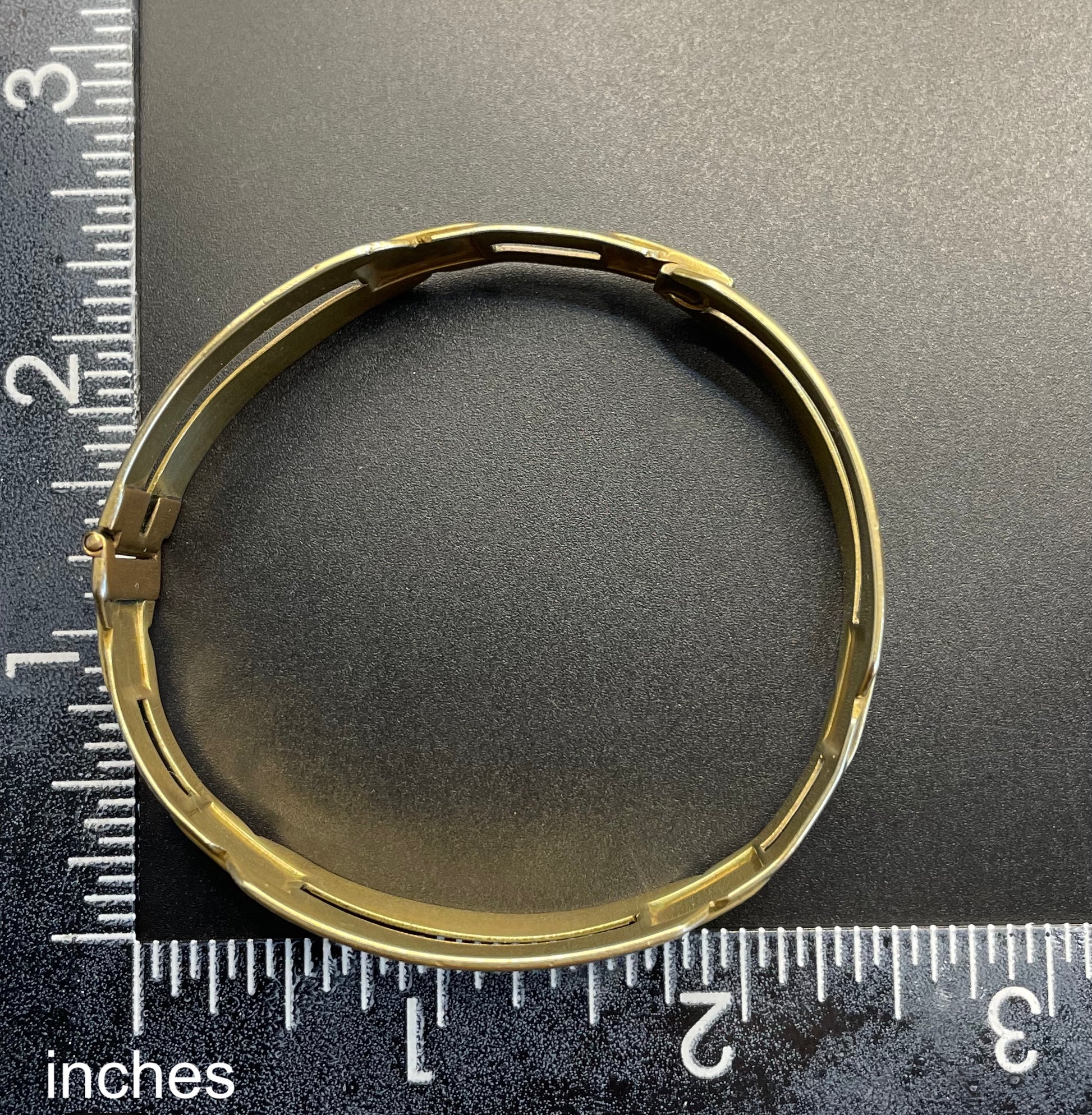 The necklace has a length of 17 inches and fastens with a classic antique, over-sized spring ring clasp. The pendant has a length of nearly 2 inches and a width just over 1 inch. The bangle has an internal diameter of about 2 1/4 inches and has a simple hook mechanism that can be slid into position. When unhooked, a panel is hinged and can open up for the bangle to slip over the wrist.