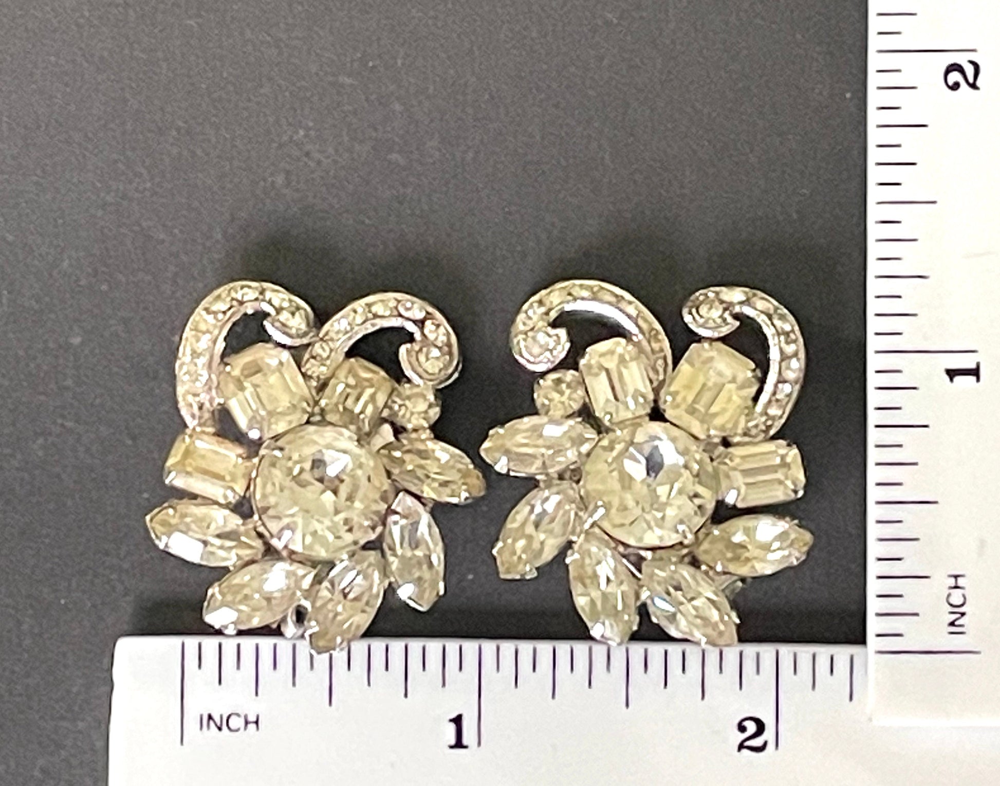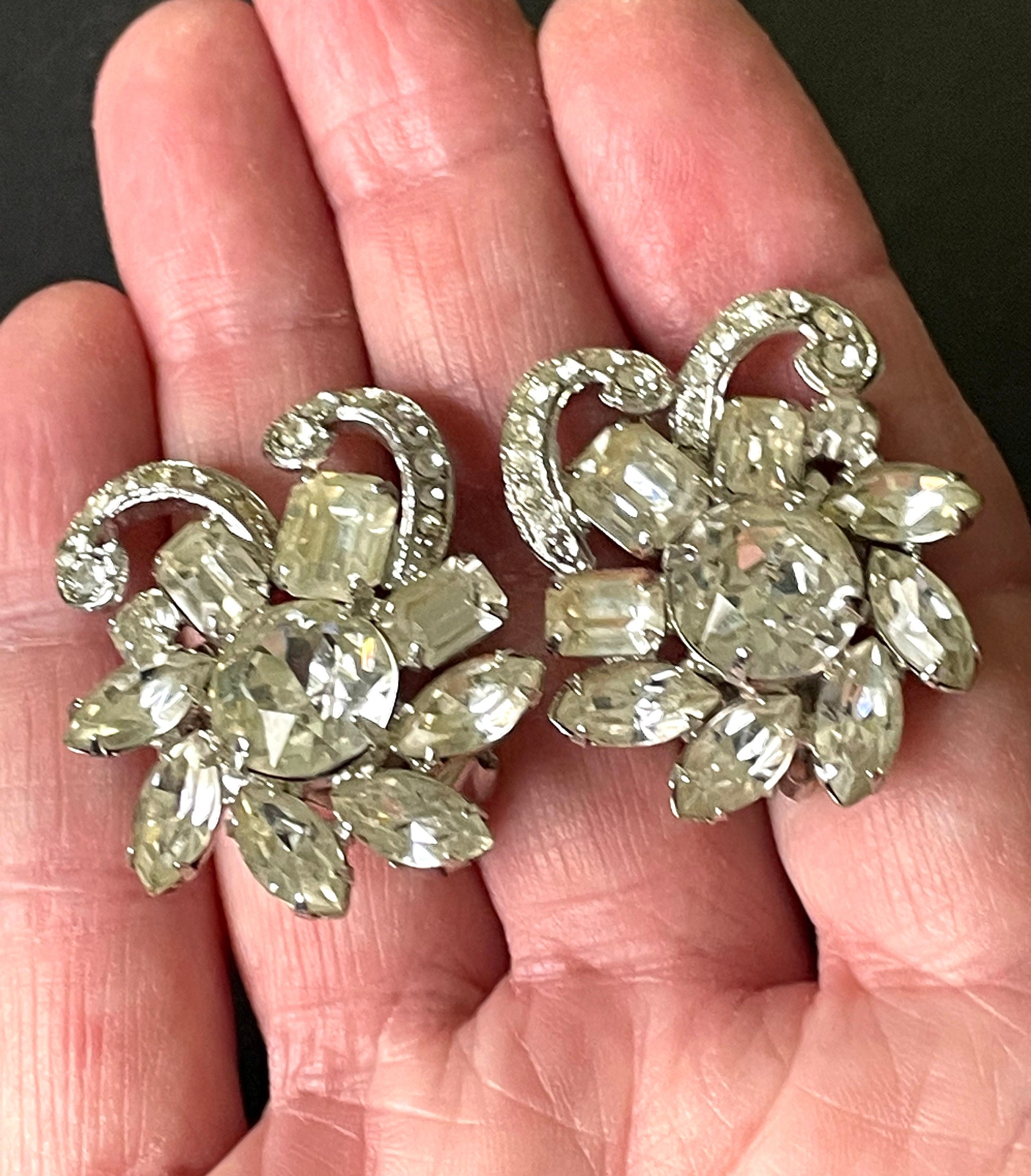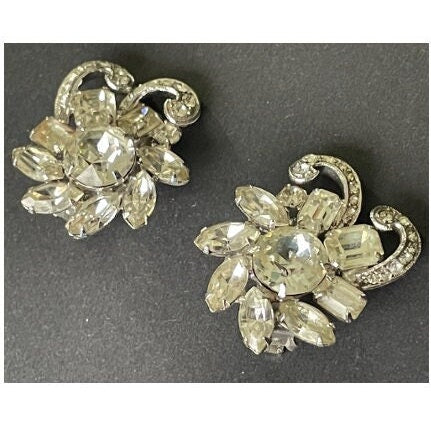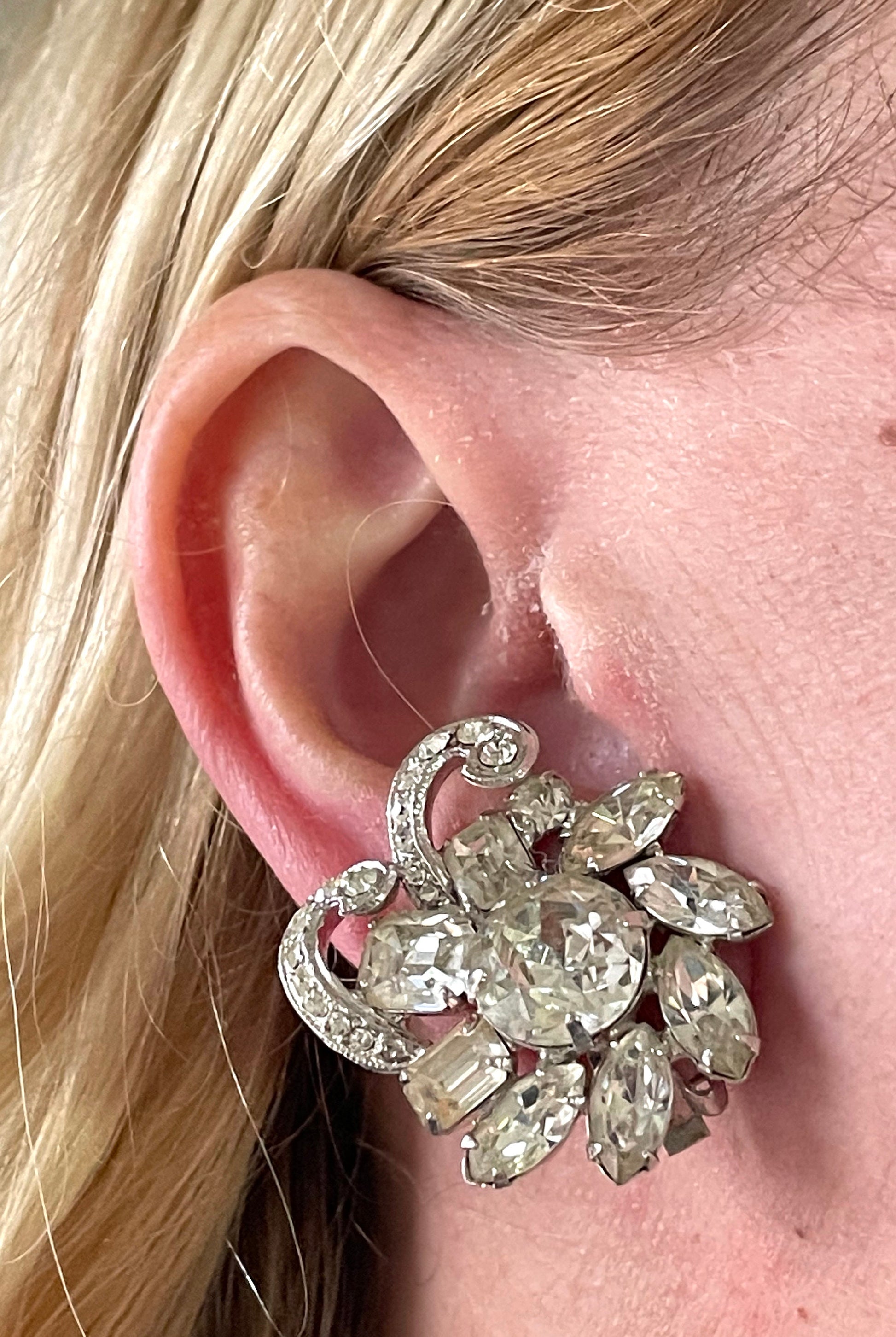 Large vintage clear rhinestone Eisenberg clip on earrings in shiny silver tone tone. Gorgeous mid century floral design in stunning classic ice white.