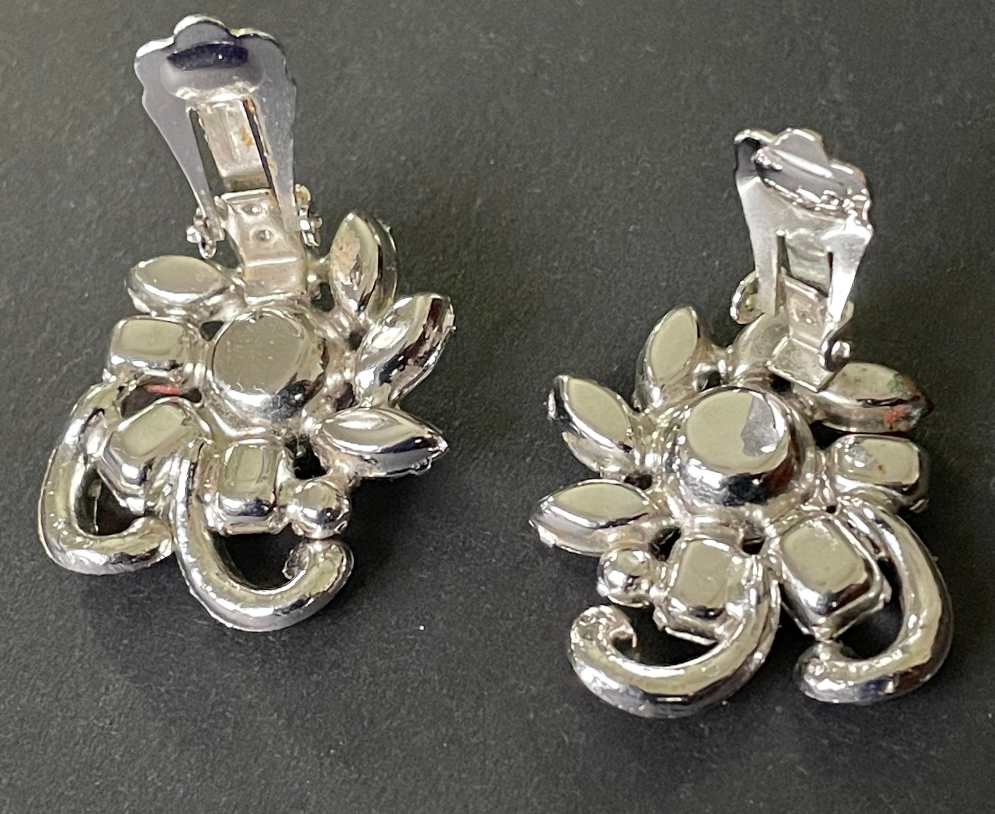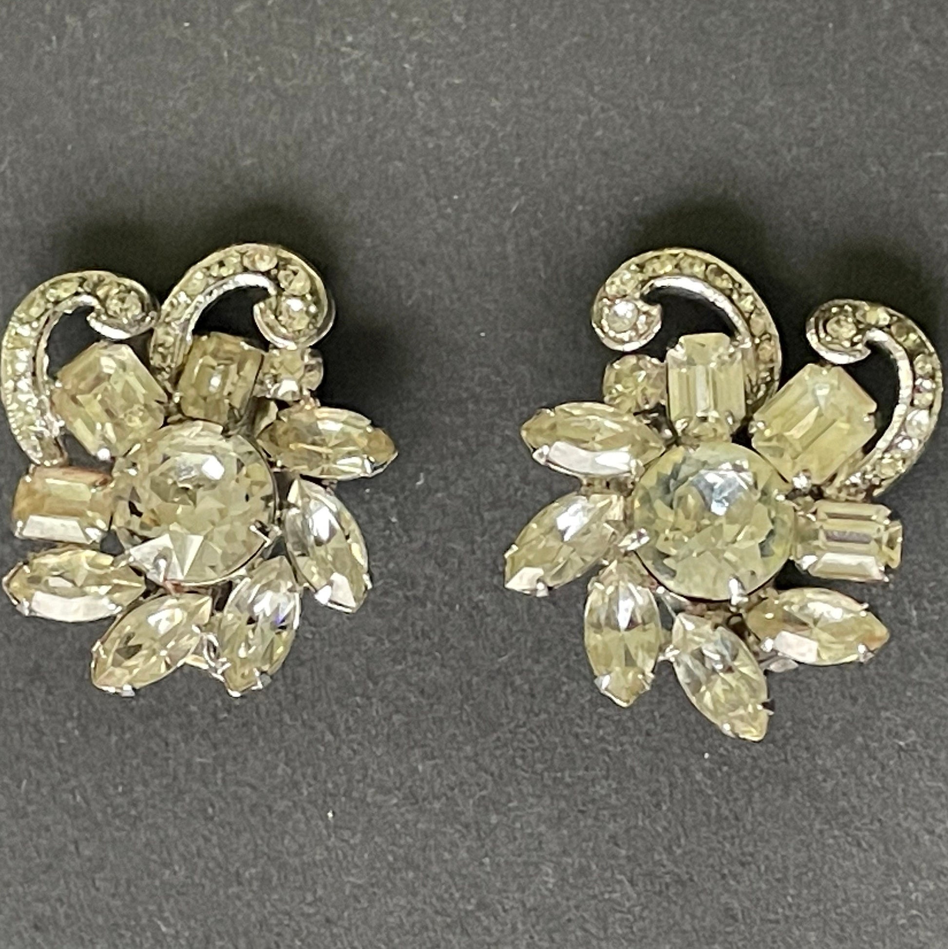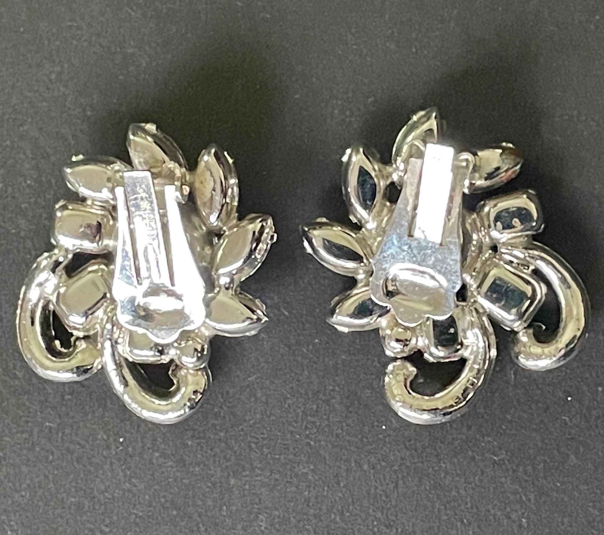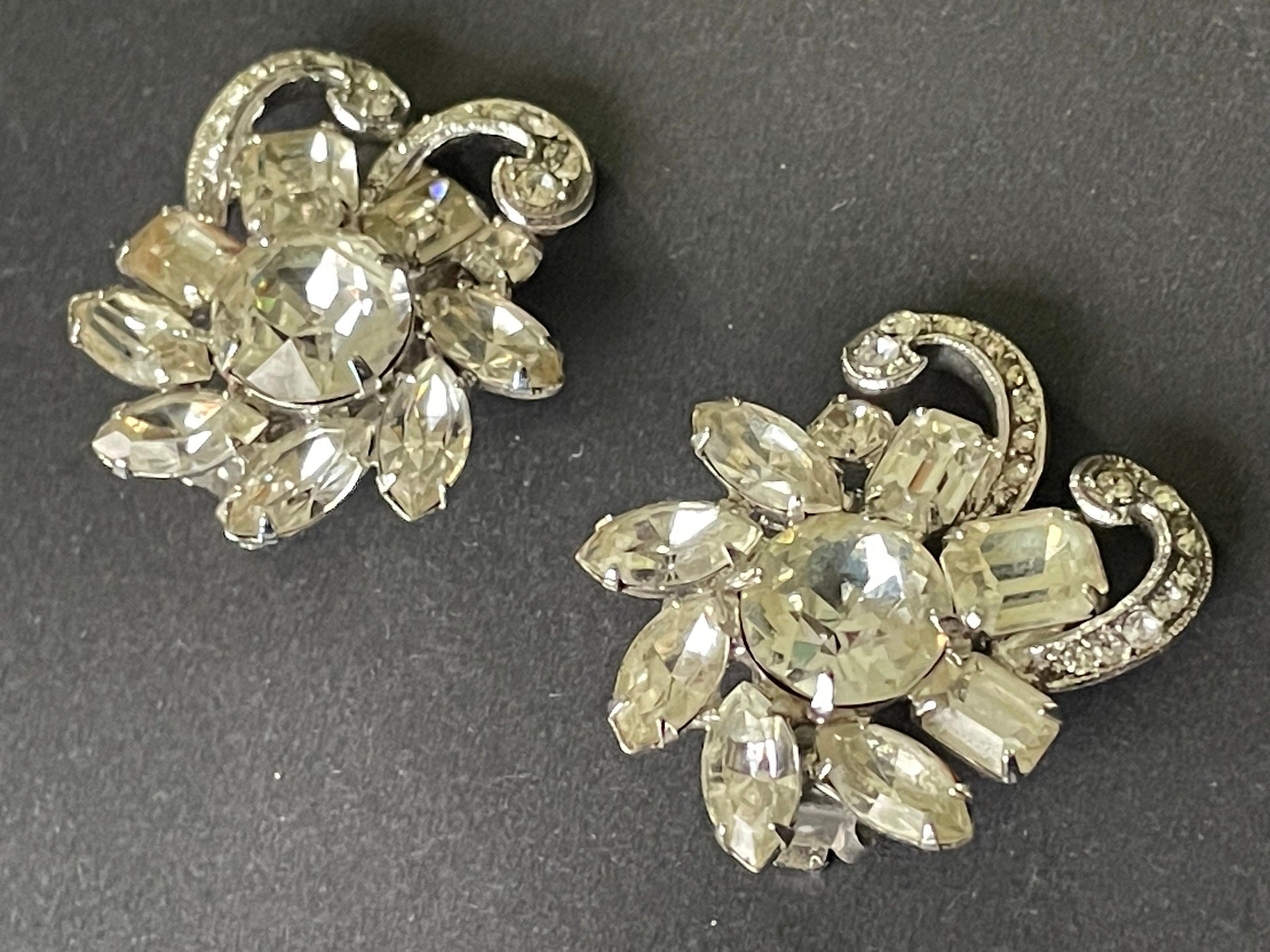 Large vintage clear rhinestone Eisenberg clip on earrings in shiny silver tone tone. Gorgeous mid century floral design in stunning classic ice white.