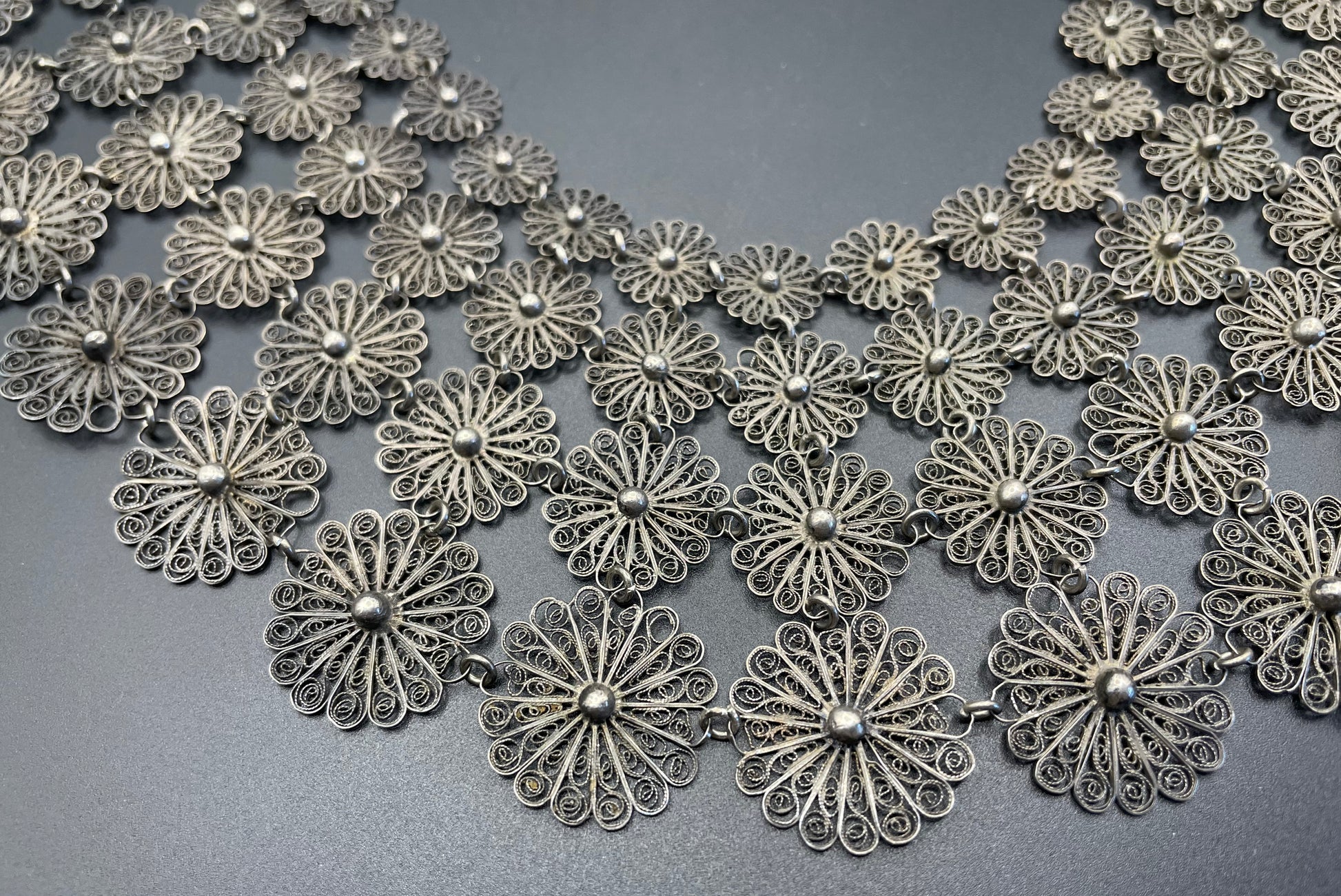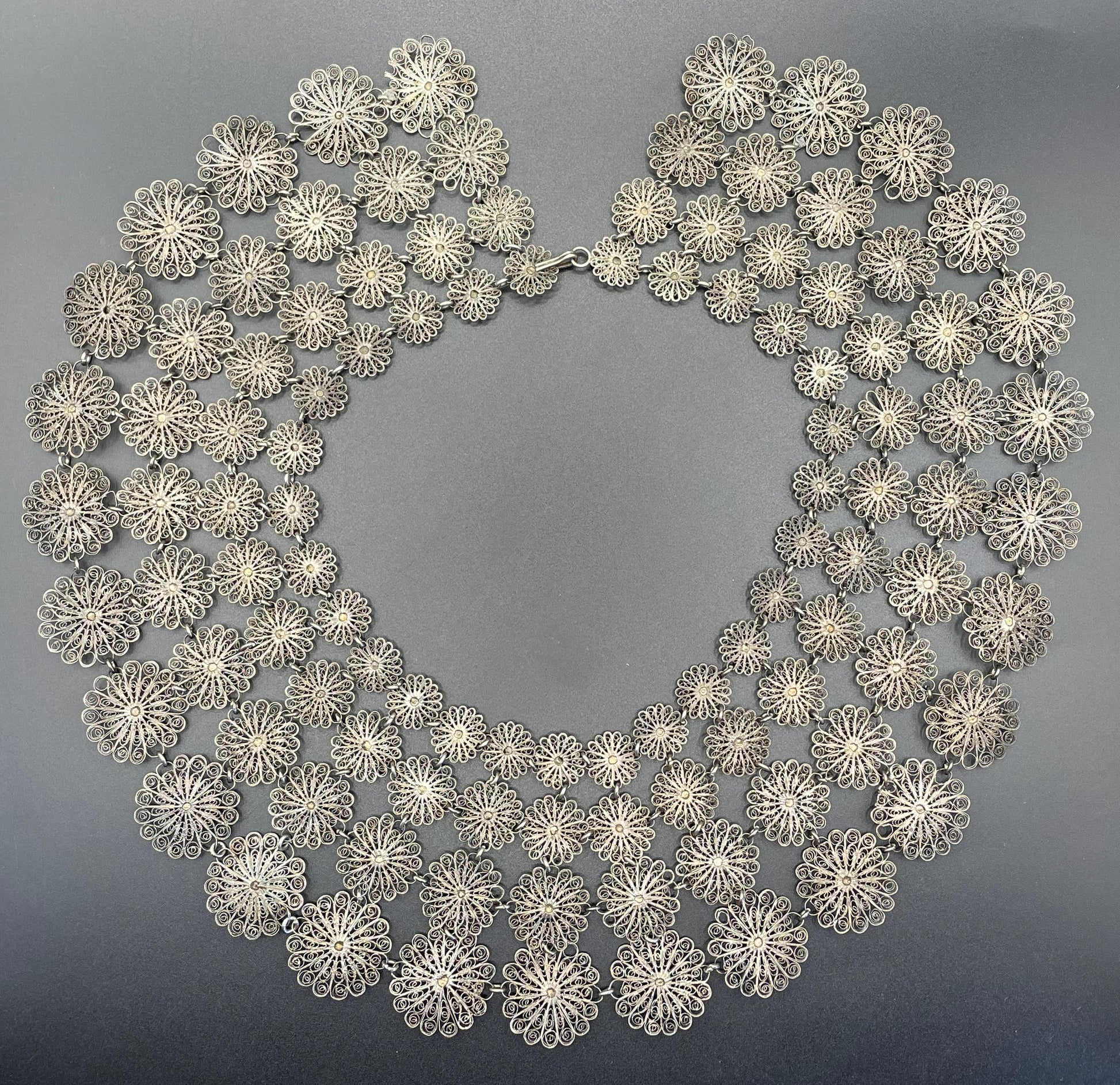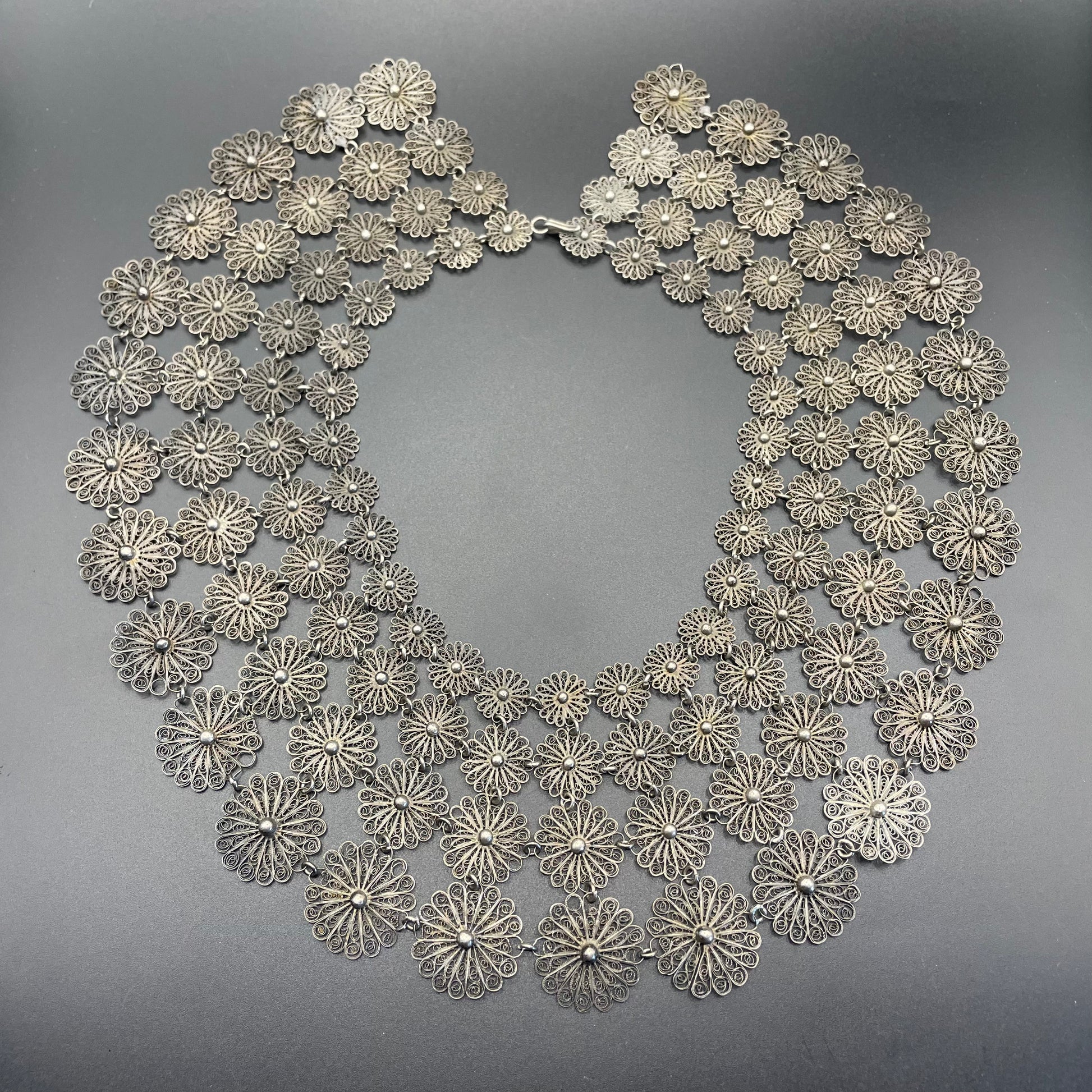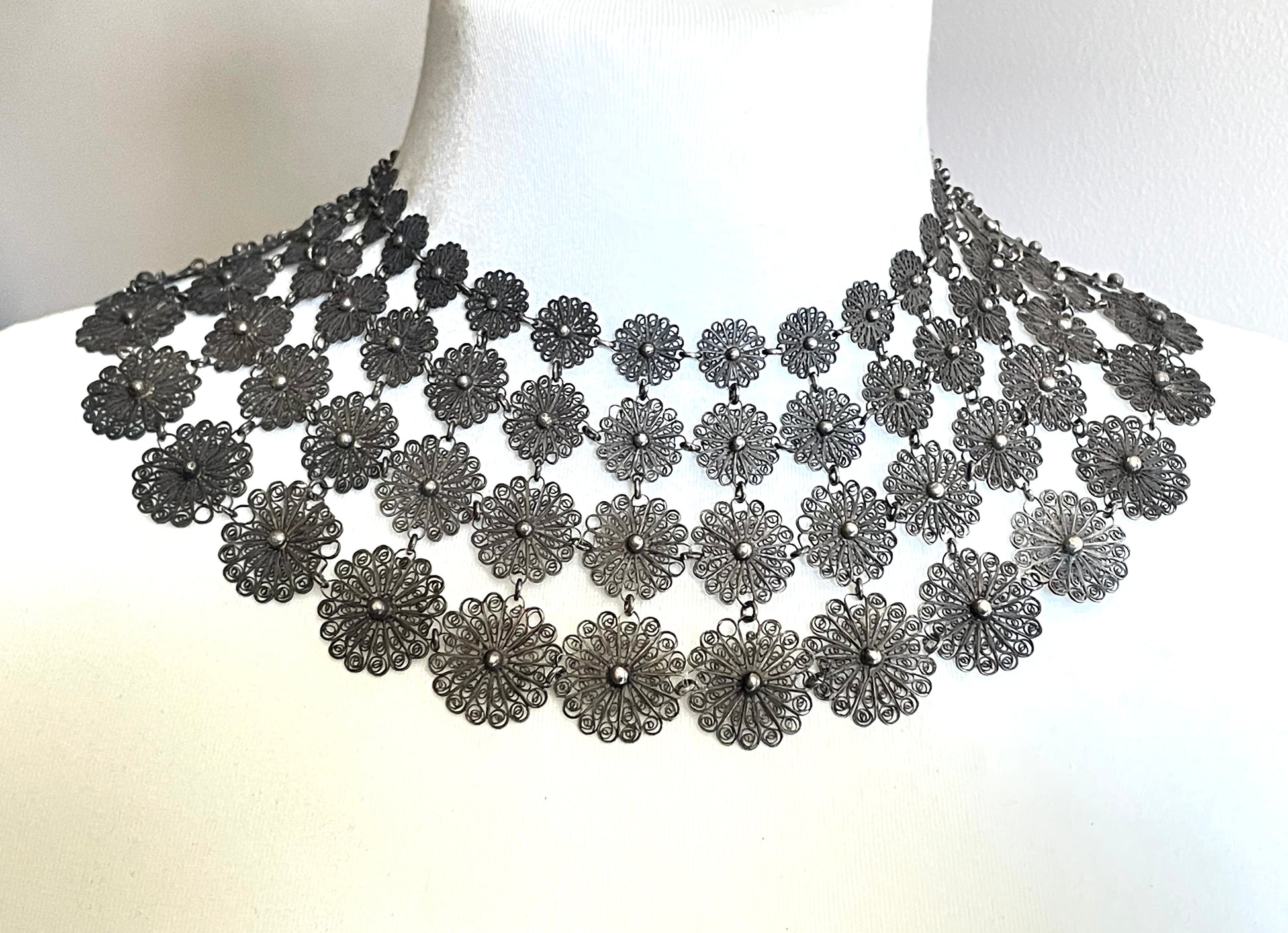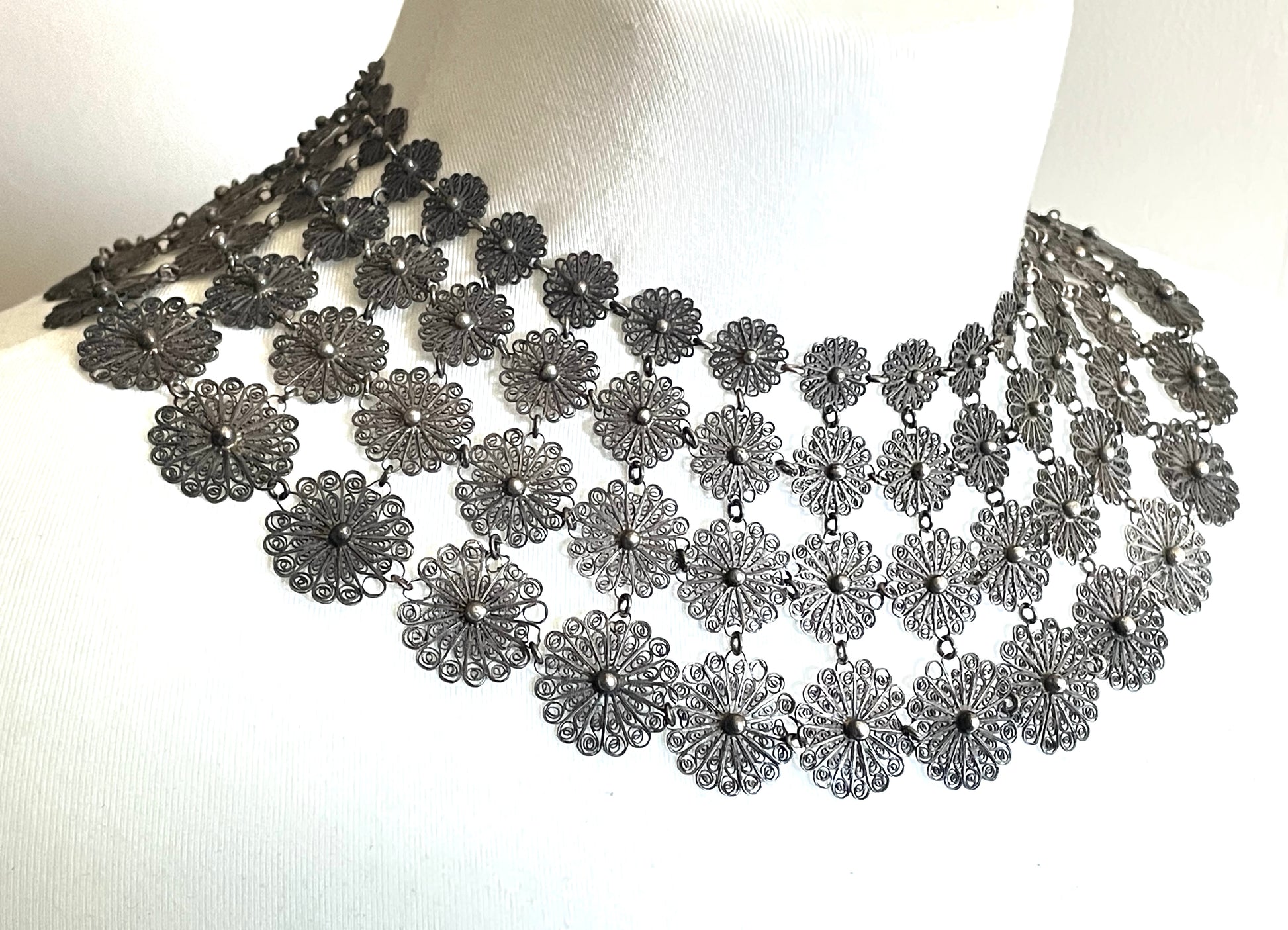 Huge antique silver (tested) filigree, four layer collar bib necklace, 97 grams