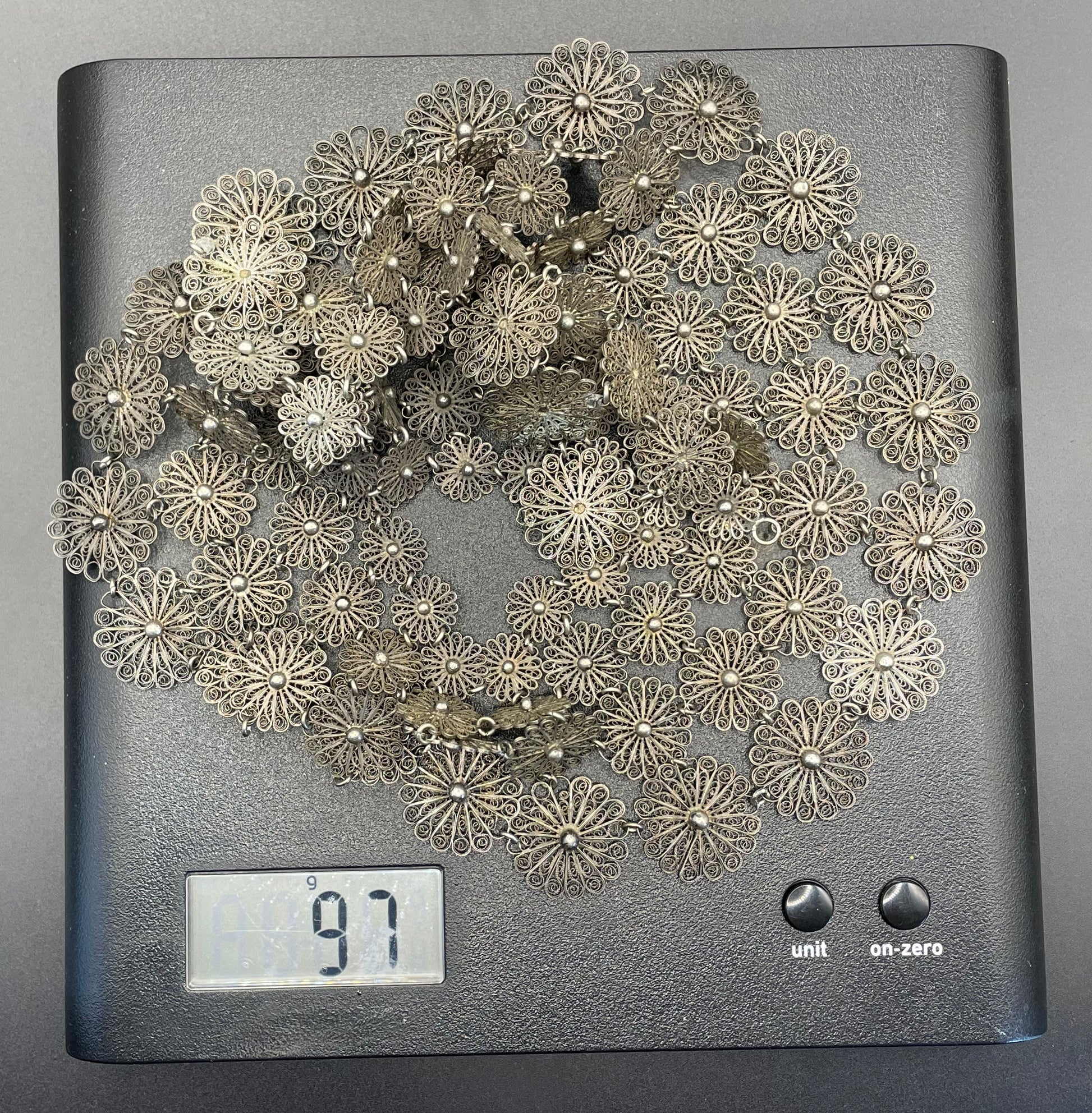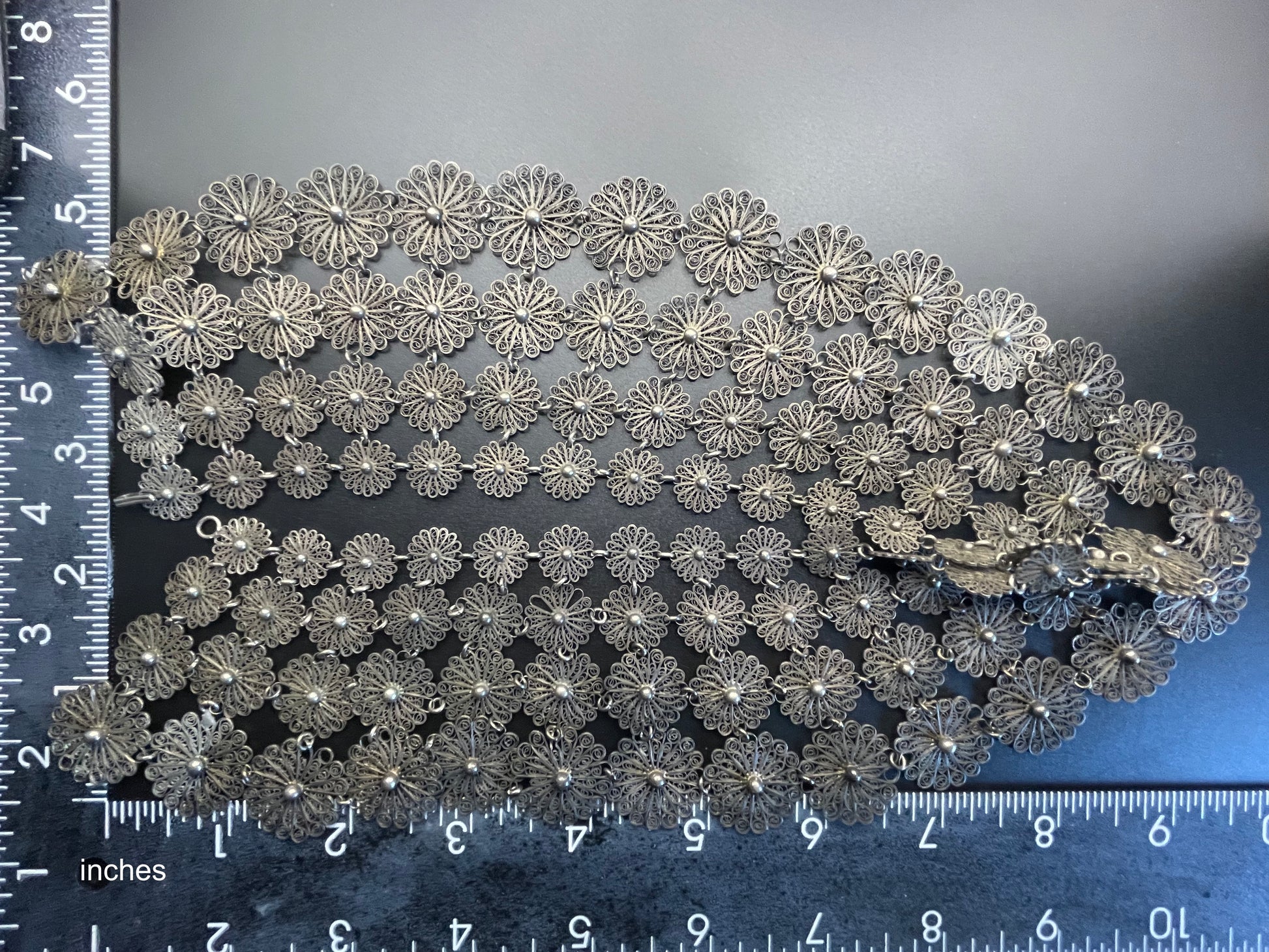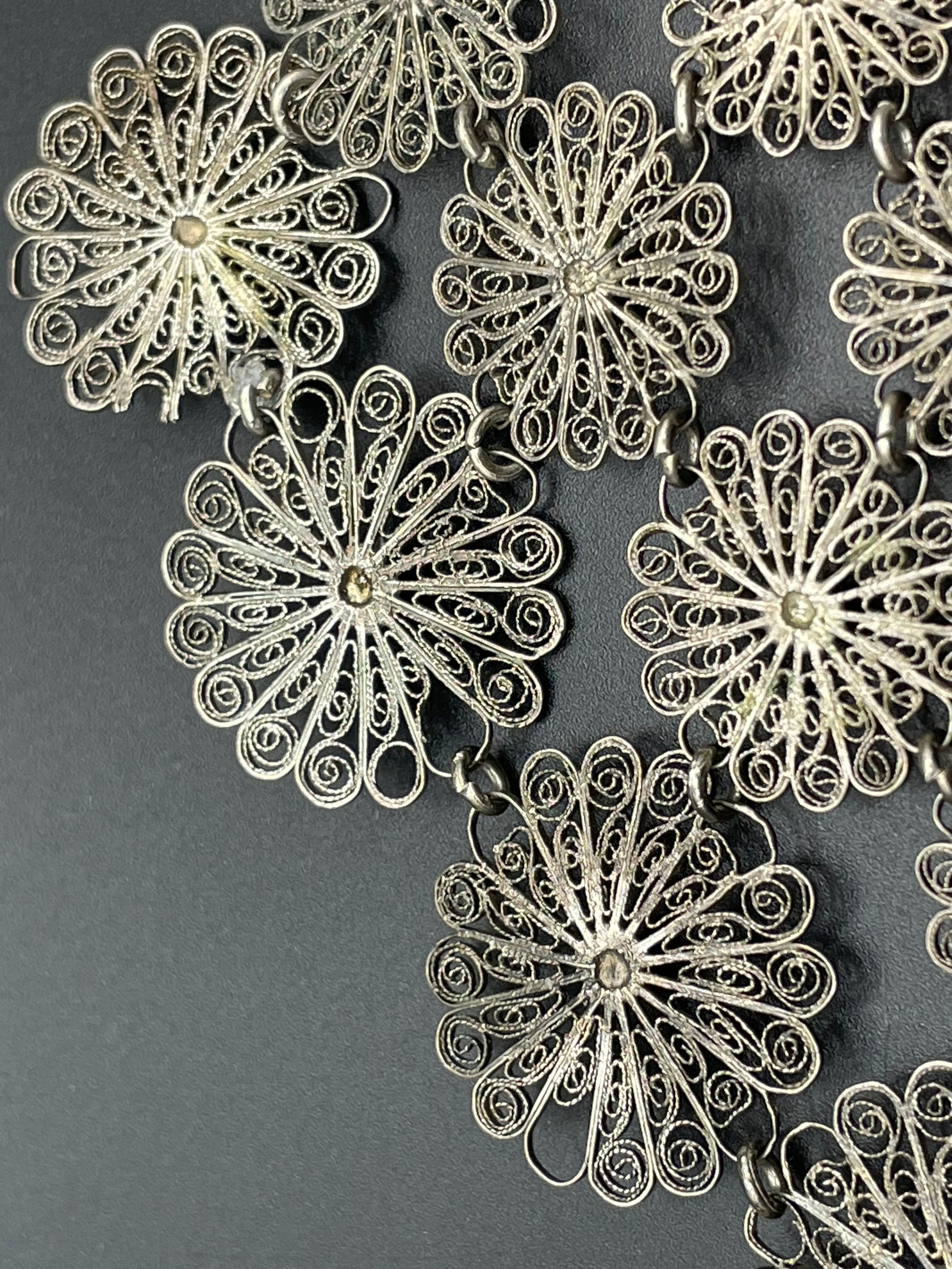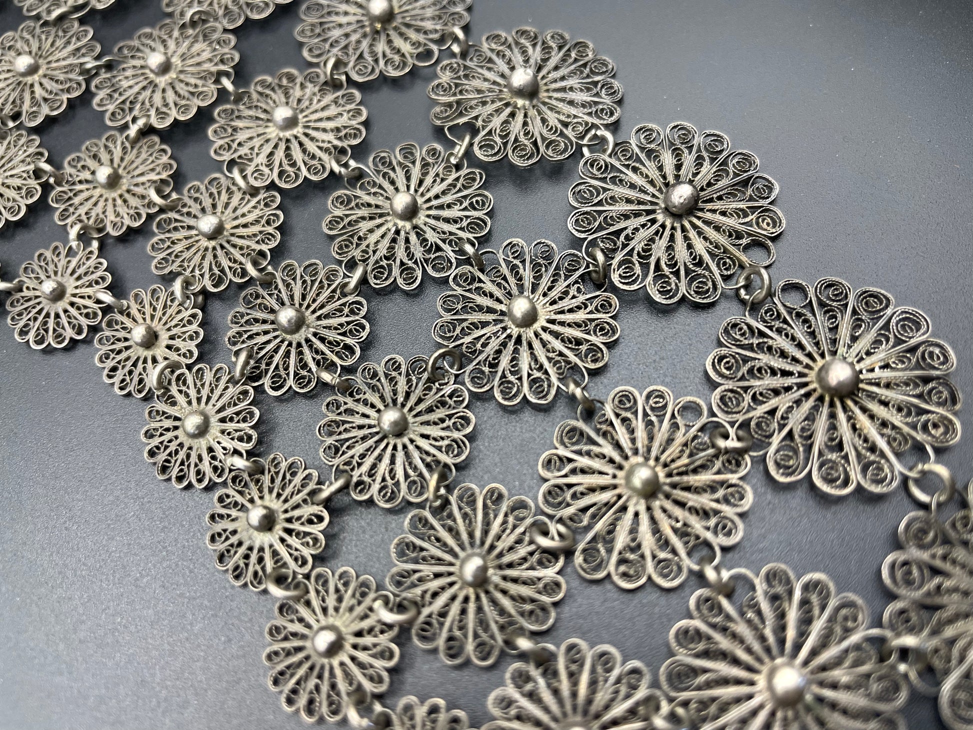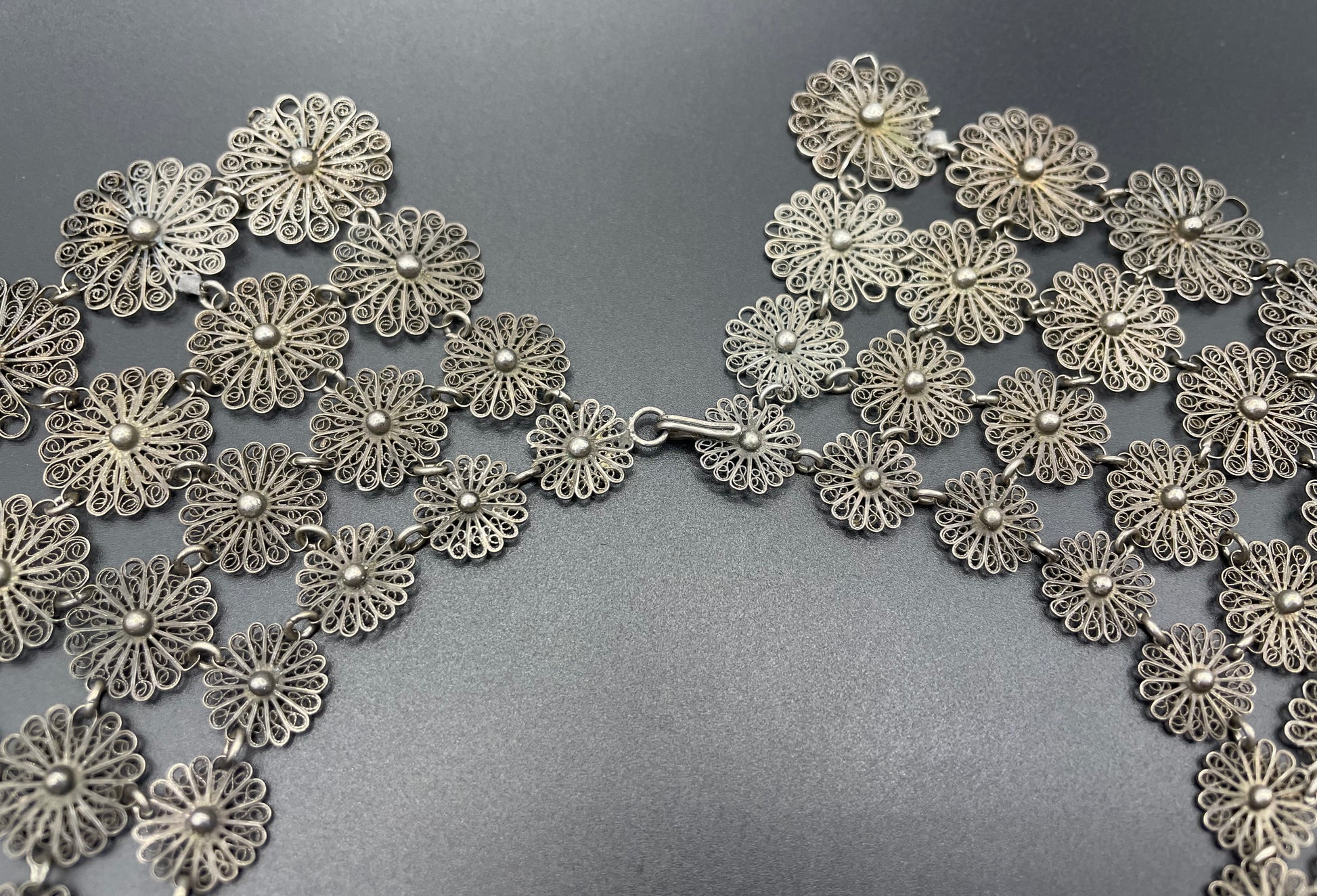 Huge antique silver (tested) filigree, four layer collar bib necklace, 97 grams