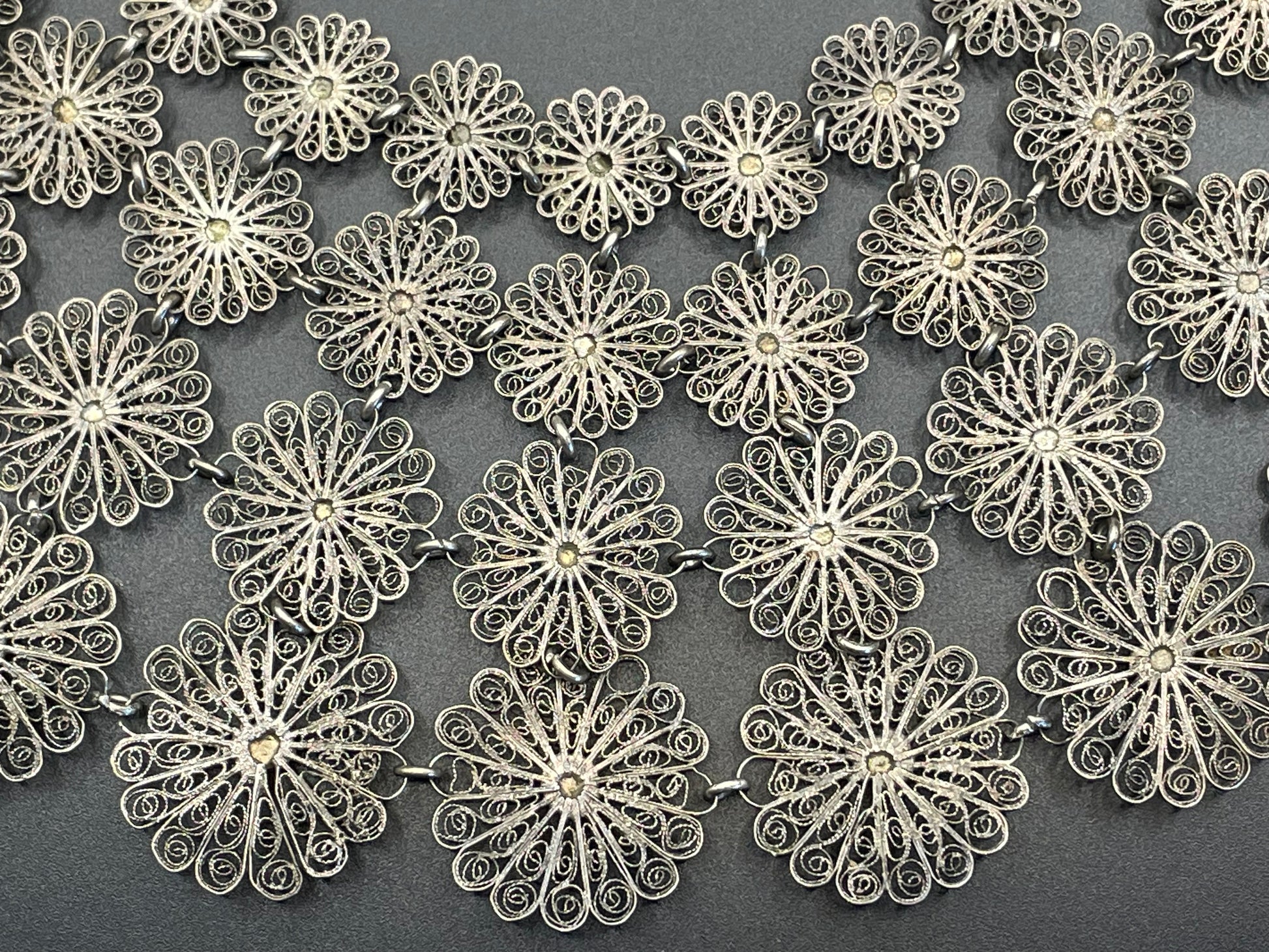 It is in good vintage condition, but with its age and highly delicate filigree, you can see from the photos that there are tiny losses within the curled wires in some of the pieces. All the linked panels are solid and secure despite this.