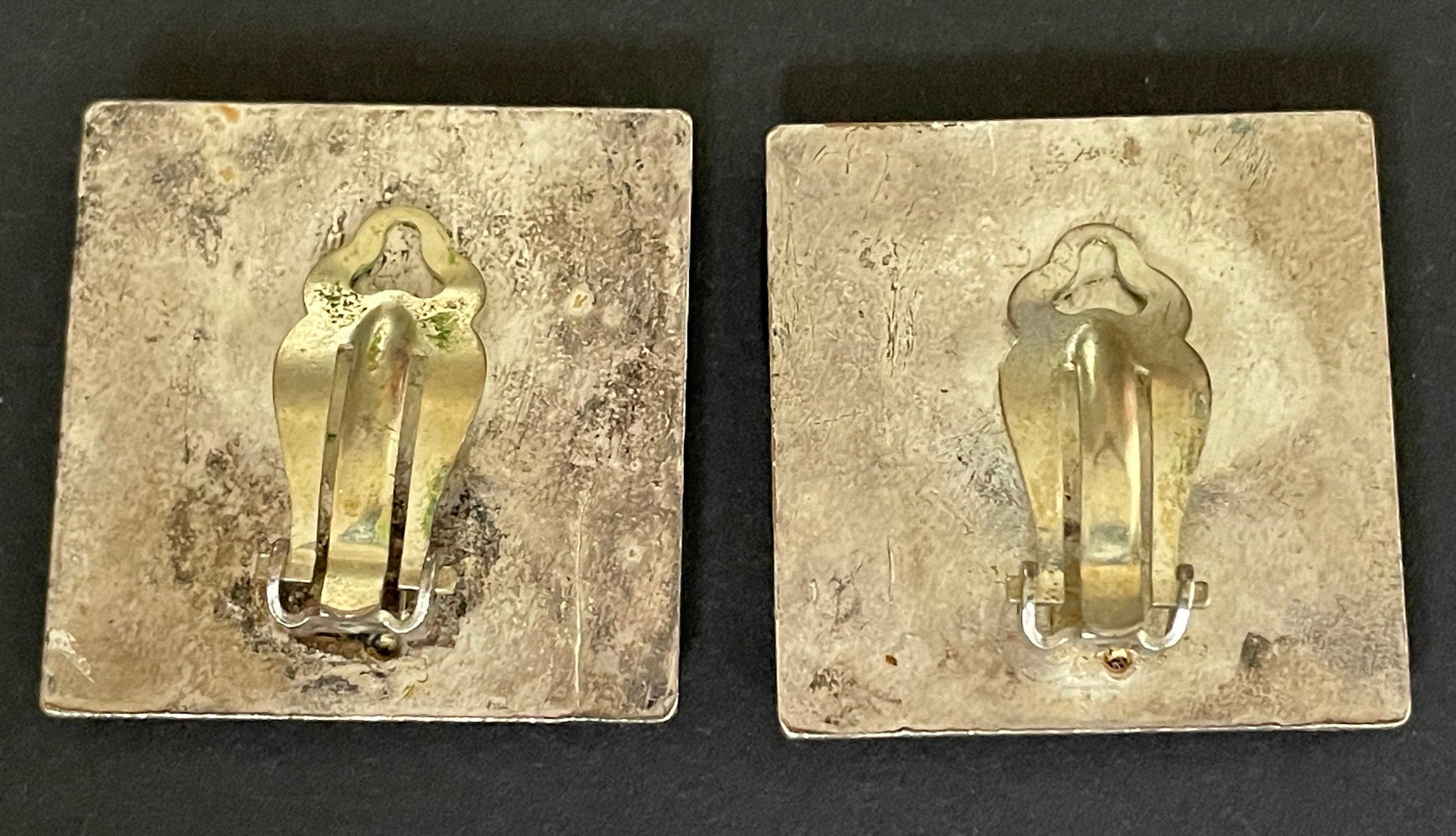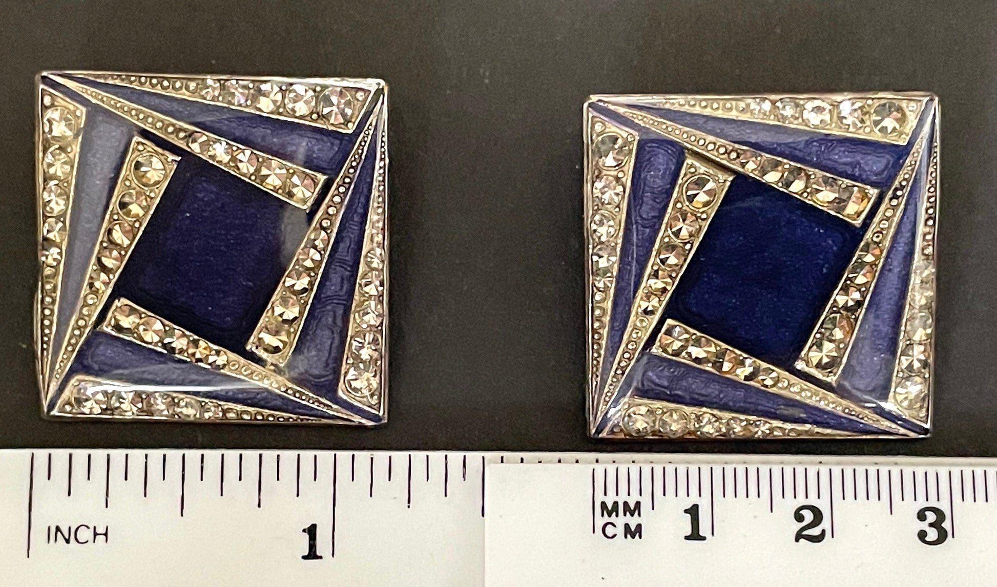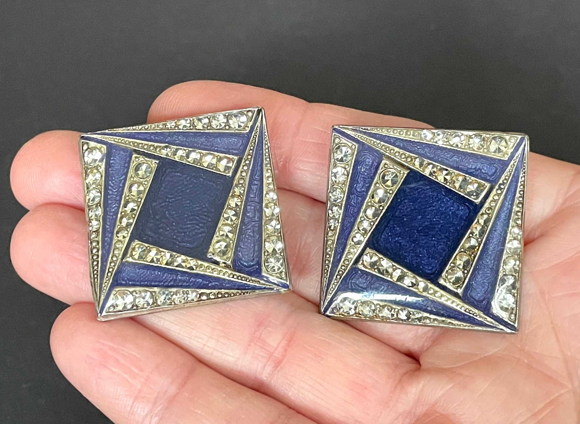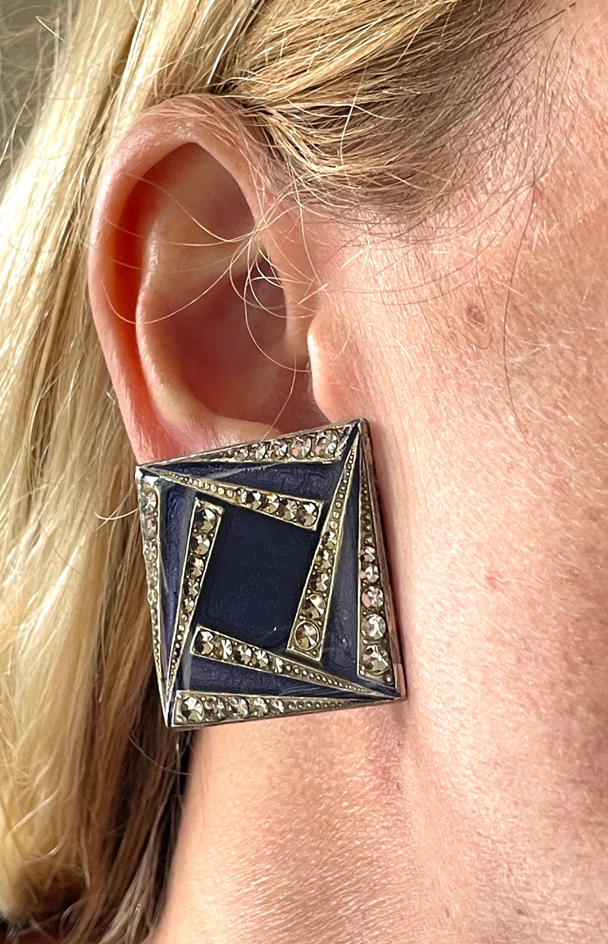 Huge vintage Pierre Bex Art Deco bright blue enamel and rhinestone clip on earrings, fabulous geometric design, large square shape