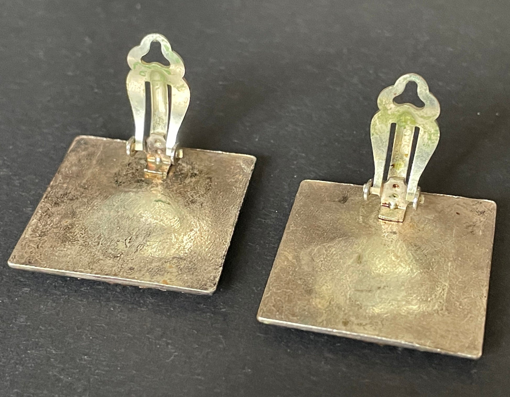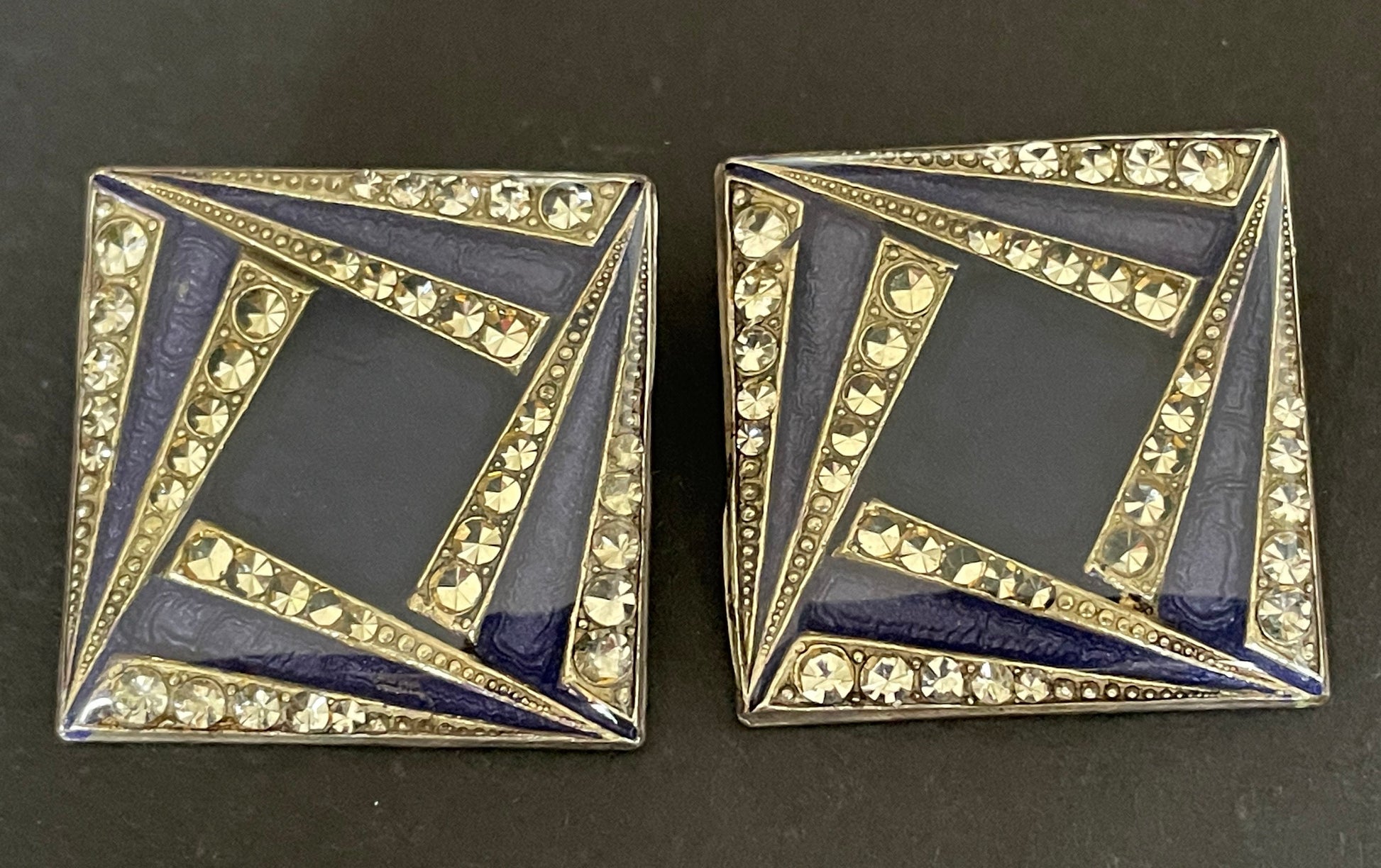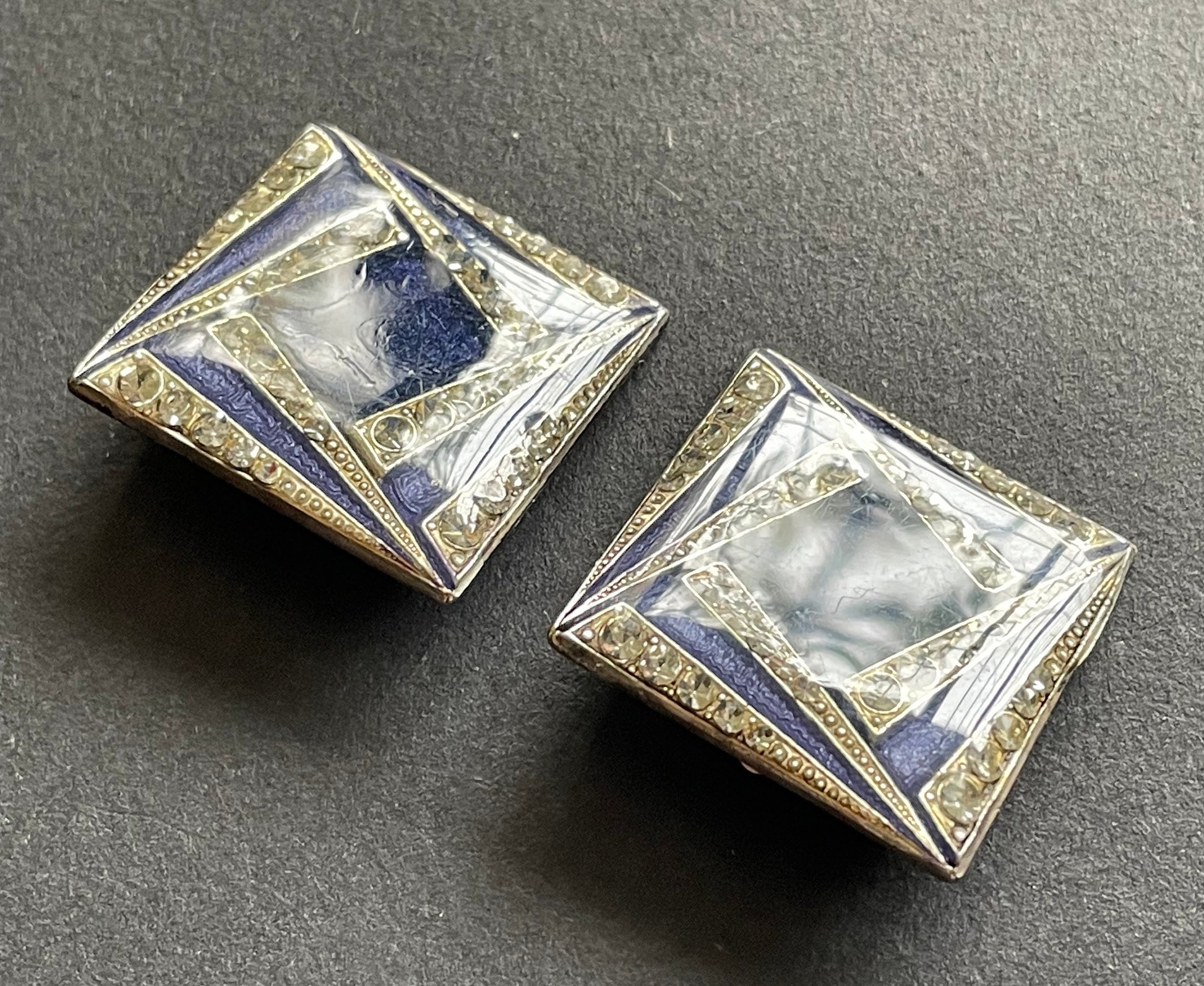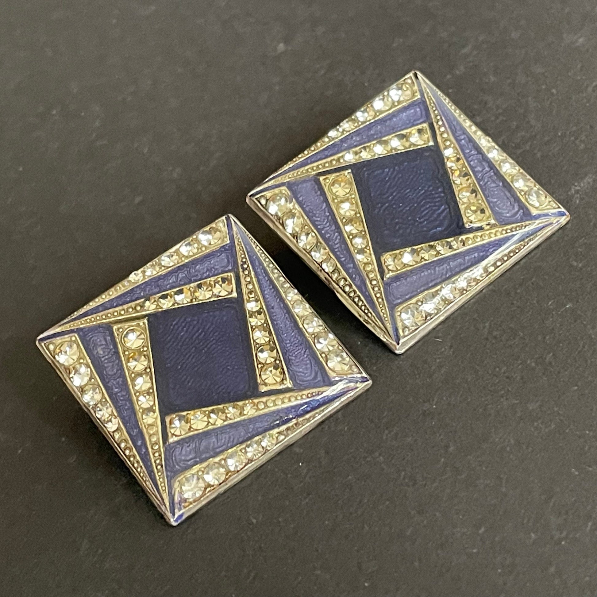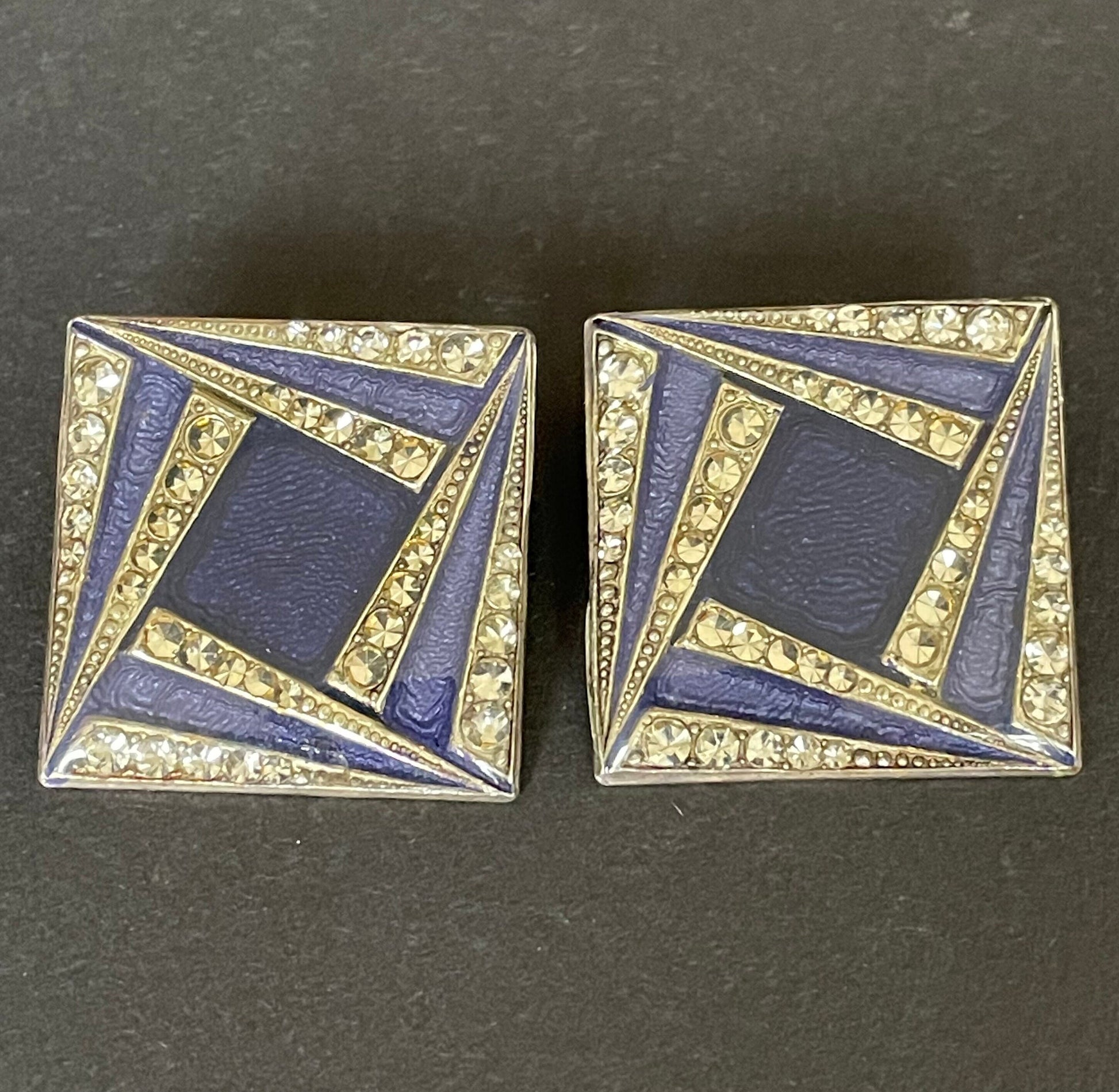 Beautiful very large vintage Pierre Bex enamel and clear rhinestone clip on earrings. With a gorgeous Art Deco geometric design, these earrings are of a lovely quality, with the square shaped panels covered with a thick, shiny layer of clear enamel in trademark Pierre Bex style.
