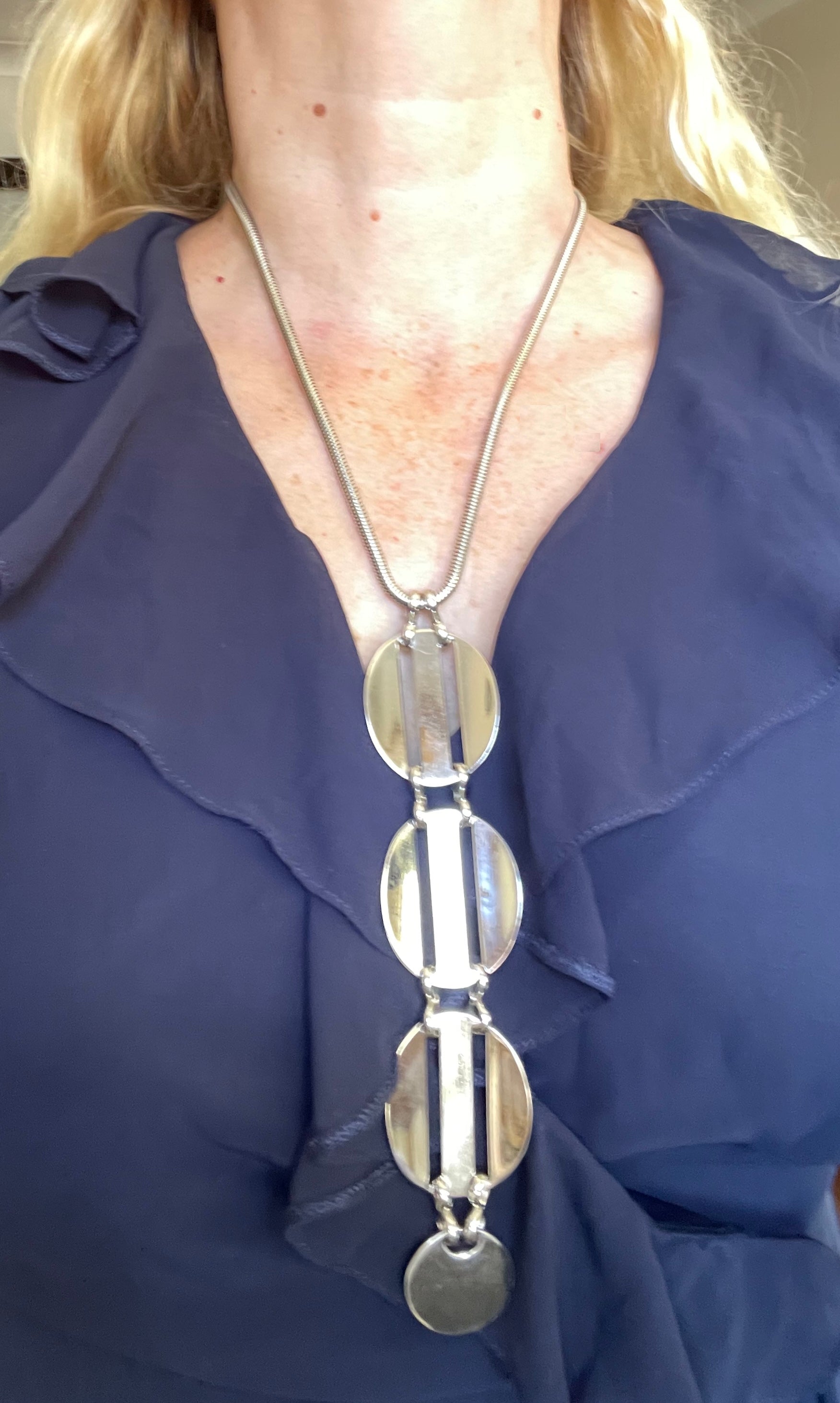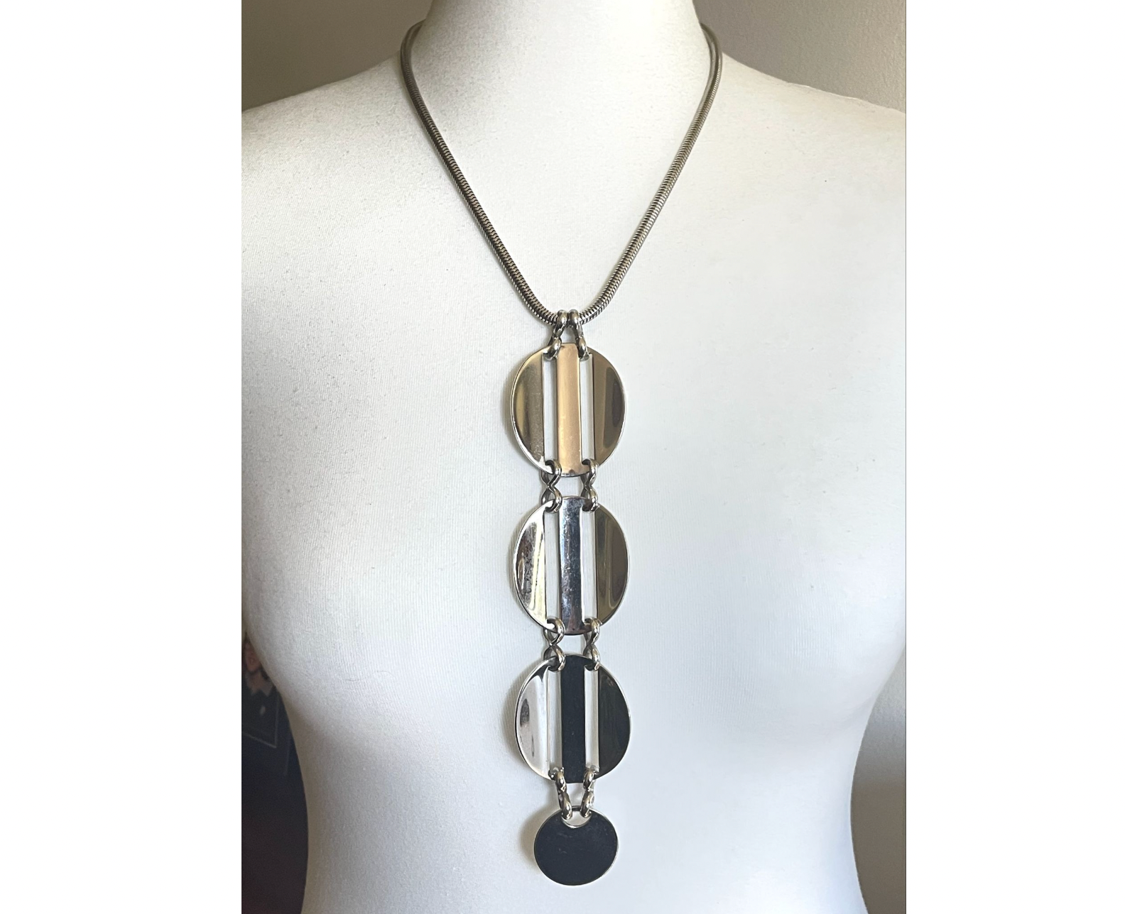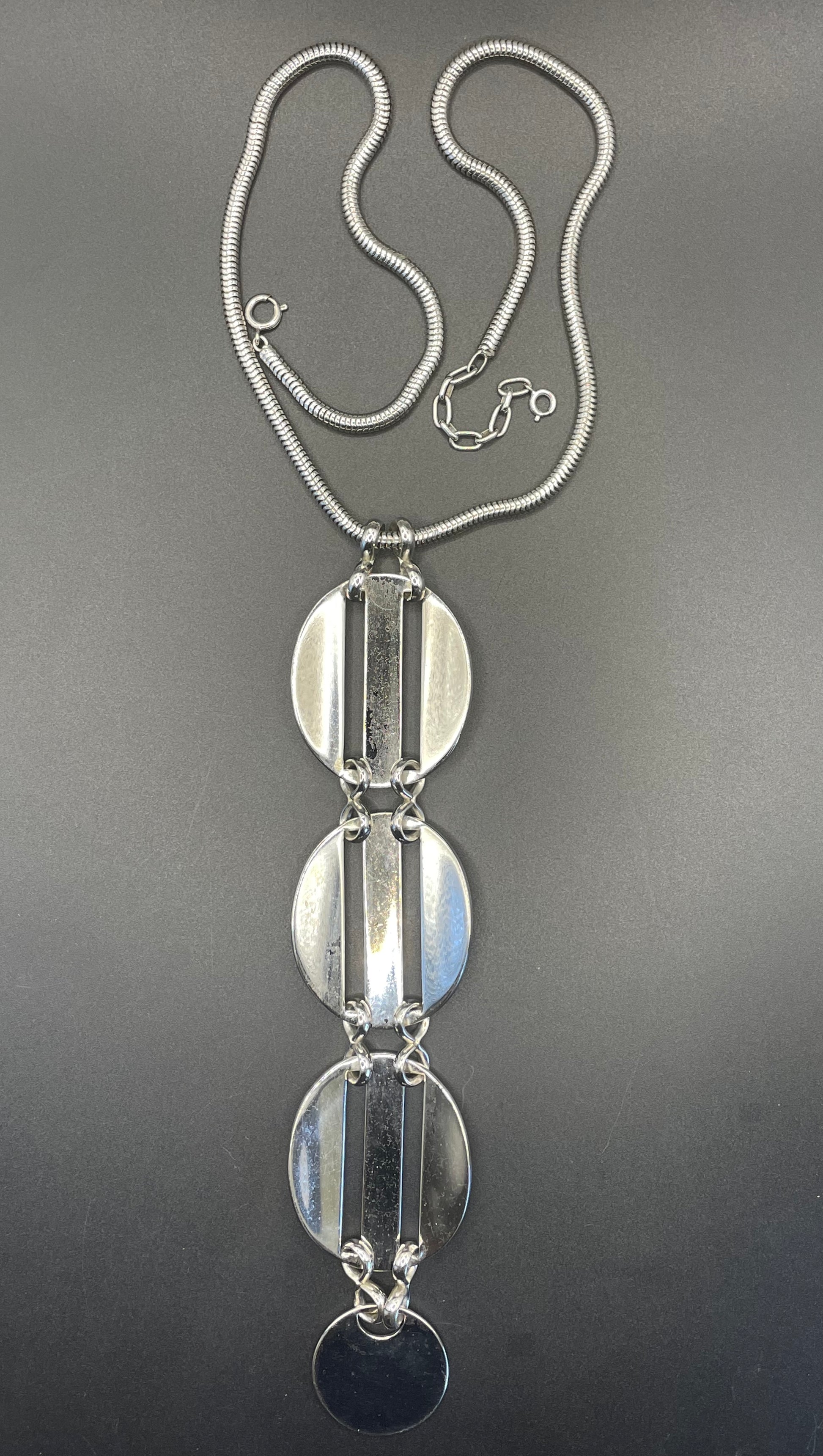 Huge vintage signed Grosse 1971 shiny silver tone long pendant necklace, space age disco design by Henkel & Grosse - makers for Dior