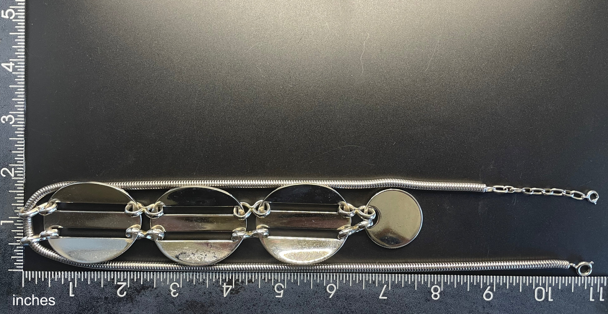The chunky silver tone snake chain has an adjustable length using the 2-inch extension chain - between about 21 and 23 inches. It fastens with a secure spring ring clasp and the extension chain also has a small spring ring clasp at its end so that it can be looped up and secured rathe than hang down.