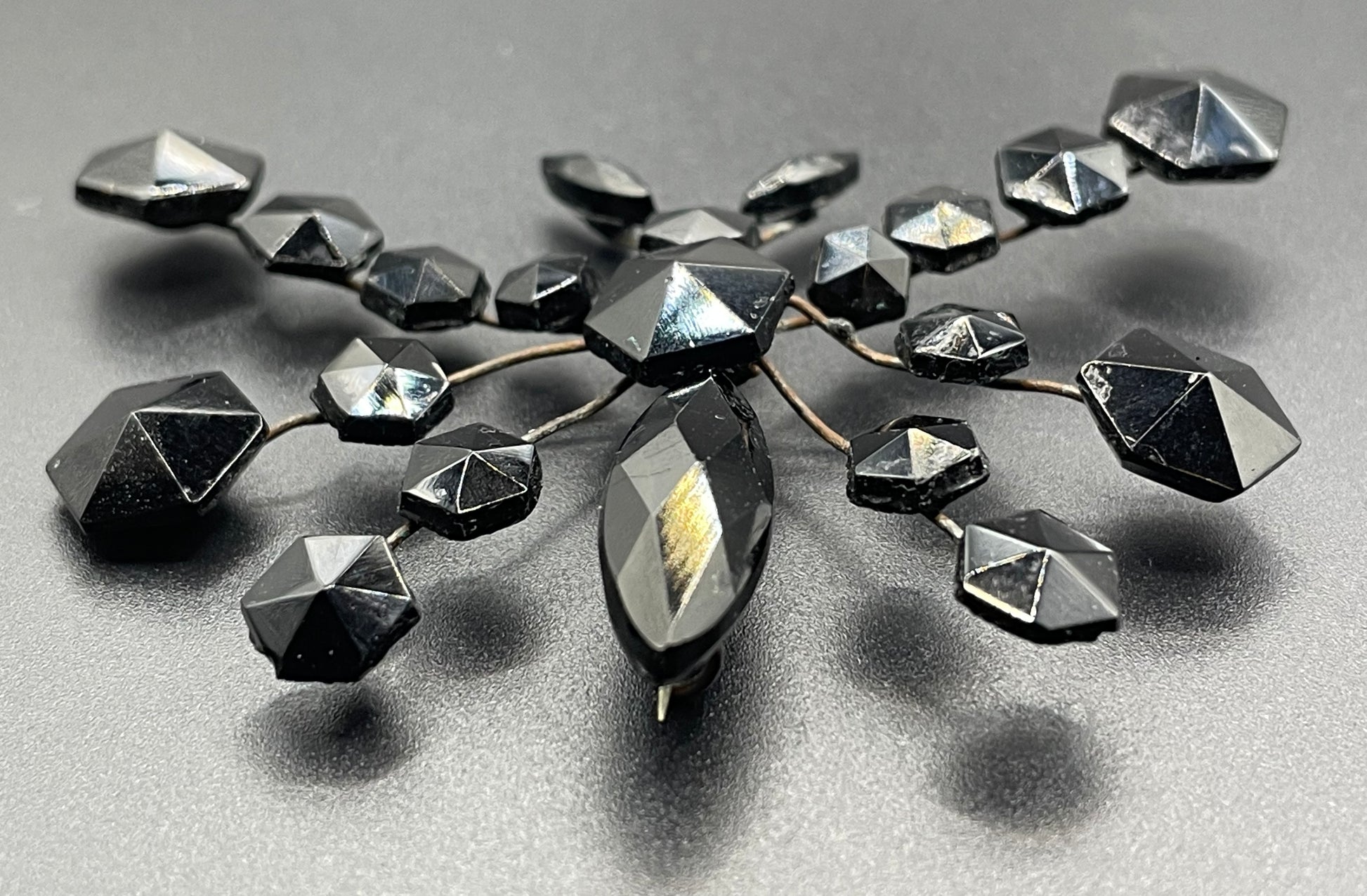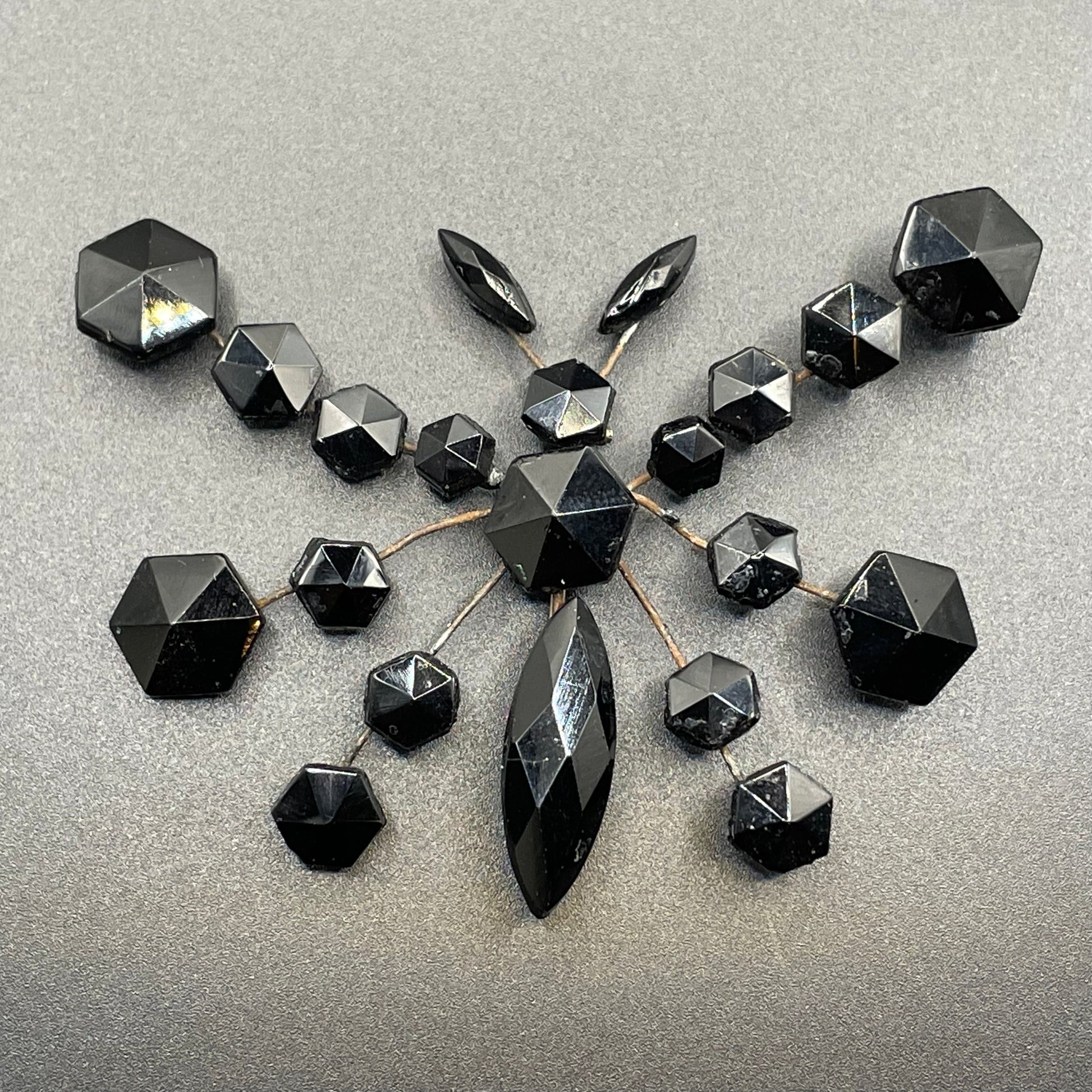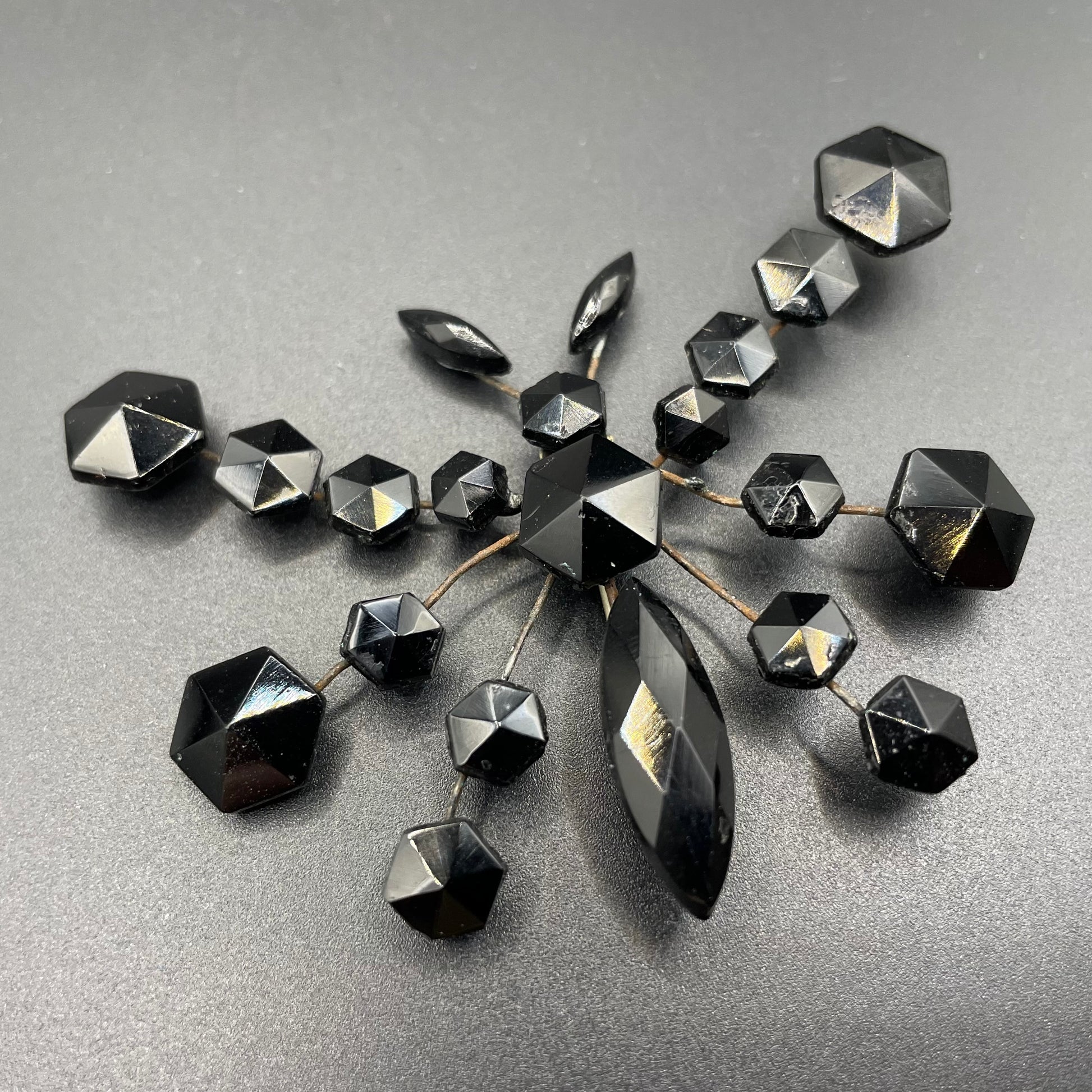 Beautiful antique black Vauxhall glass French jet butterfly brooch from the Victorian era, with beautiful hexagonal and navette/marquise cut faceted glass stones. Victorian French jet jewellery was inspired by pieces of mourning jewellery, which was made popular during this period as it was Queen Victoria's only jewellery following the death of her beloved husband.