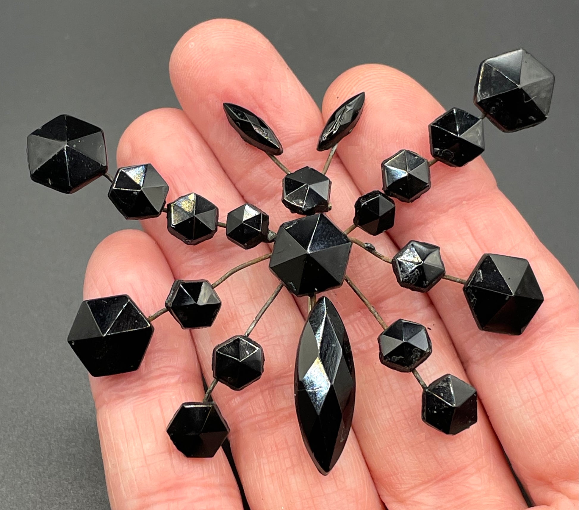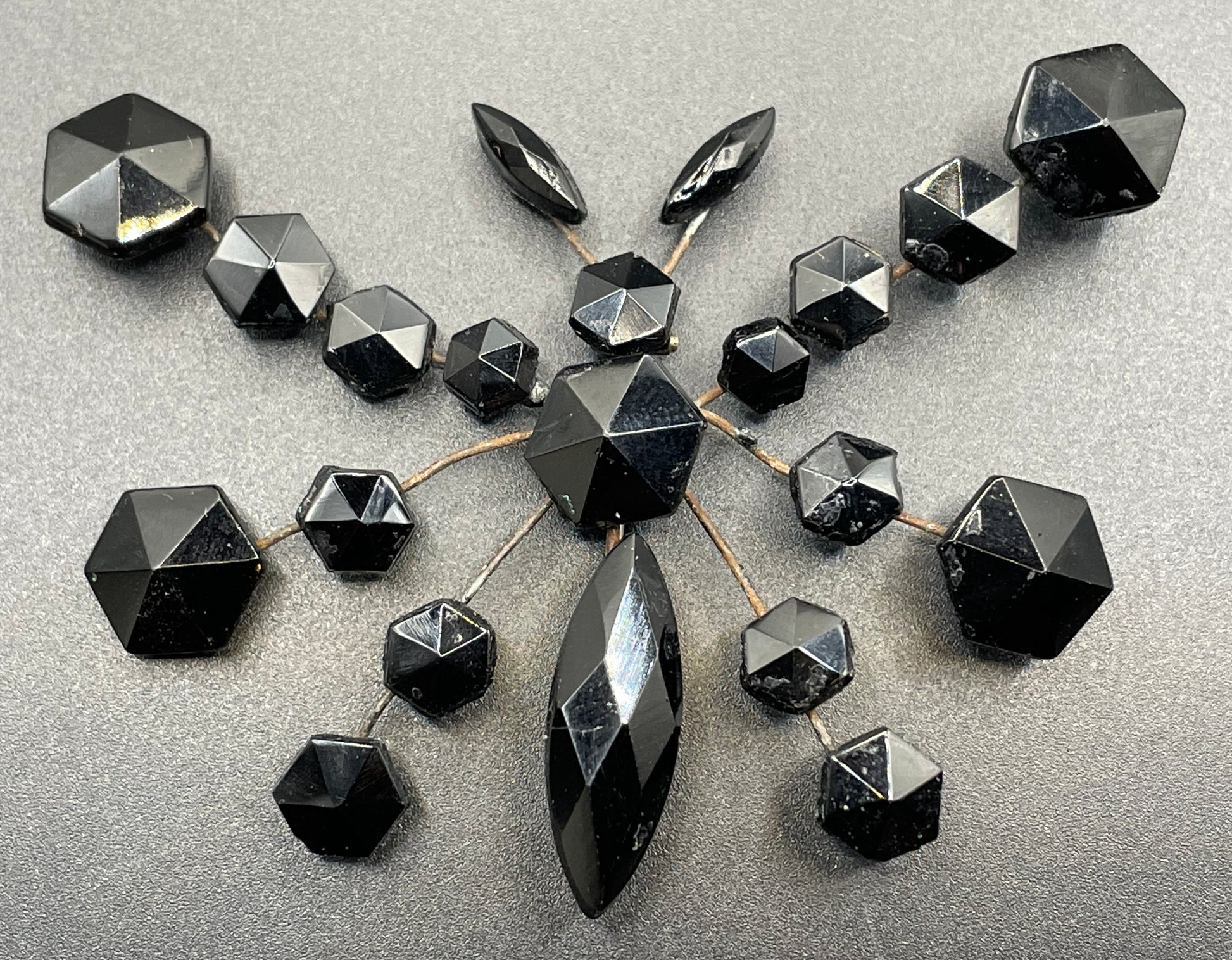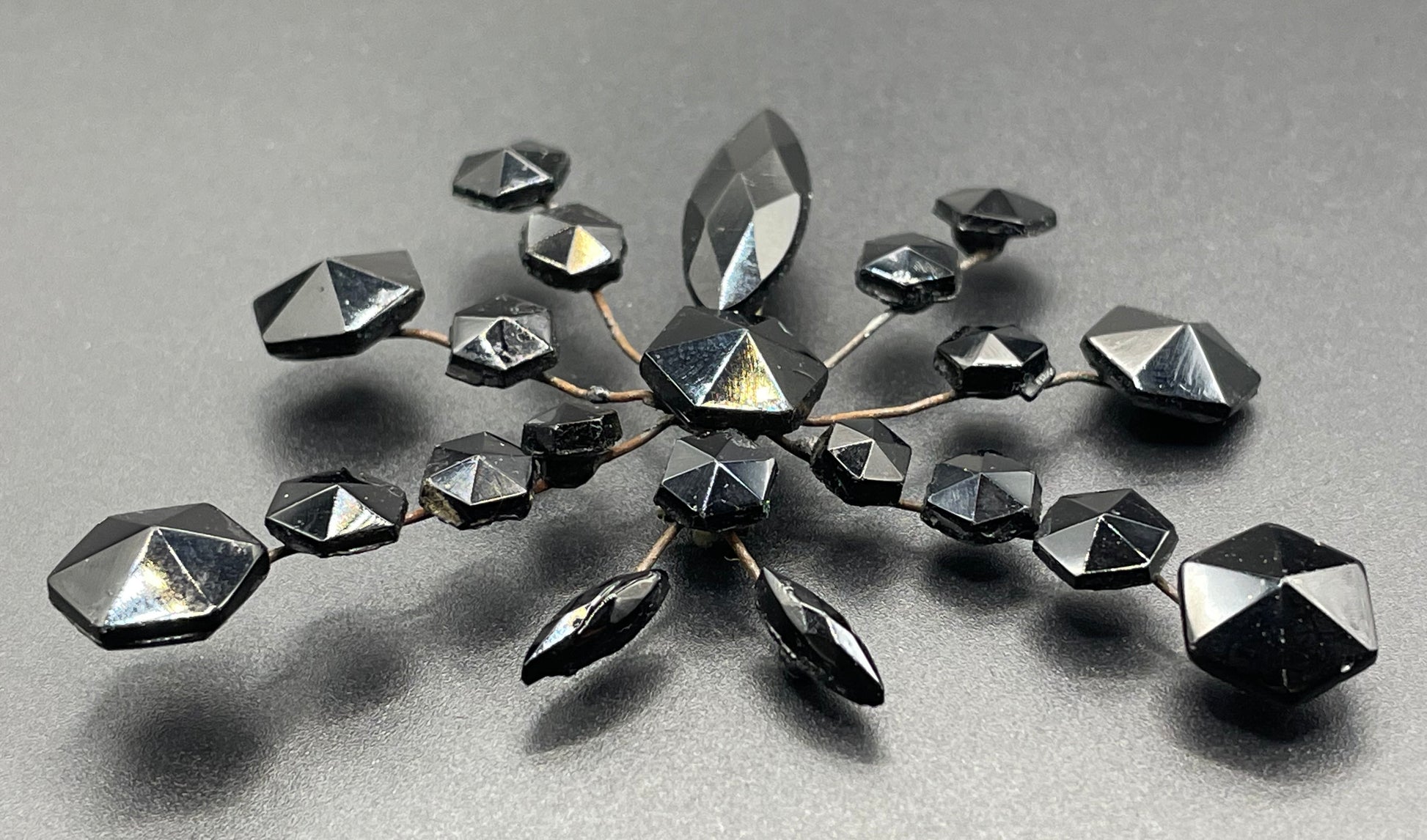 Beautiful antique black Vauxhall glass French jet butterfly brooch from the Victorian era, with beautiful hexagonal and navette/marquise cut faceted glass stones. Victorian French jet jewellery was inspired by pieces of mourning jewellery, which was made popular during this period as it was Queen Victoria's only jewellery following the death of her beloved husband.