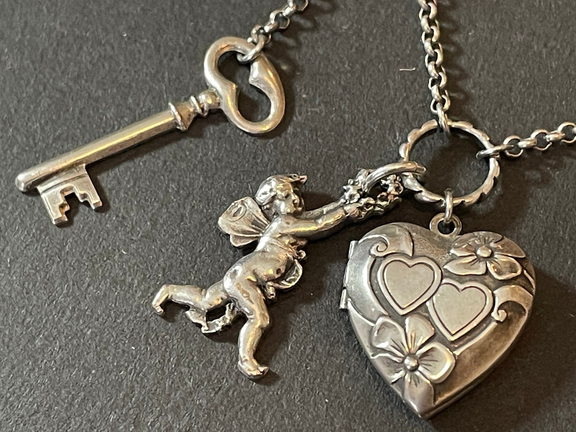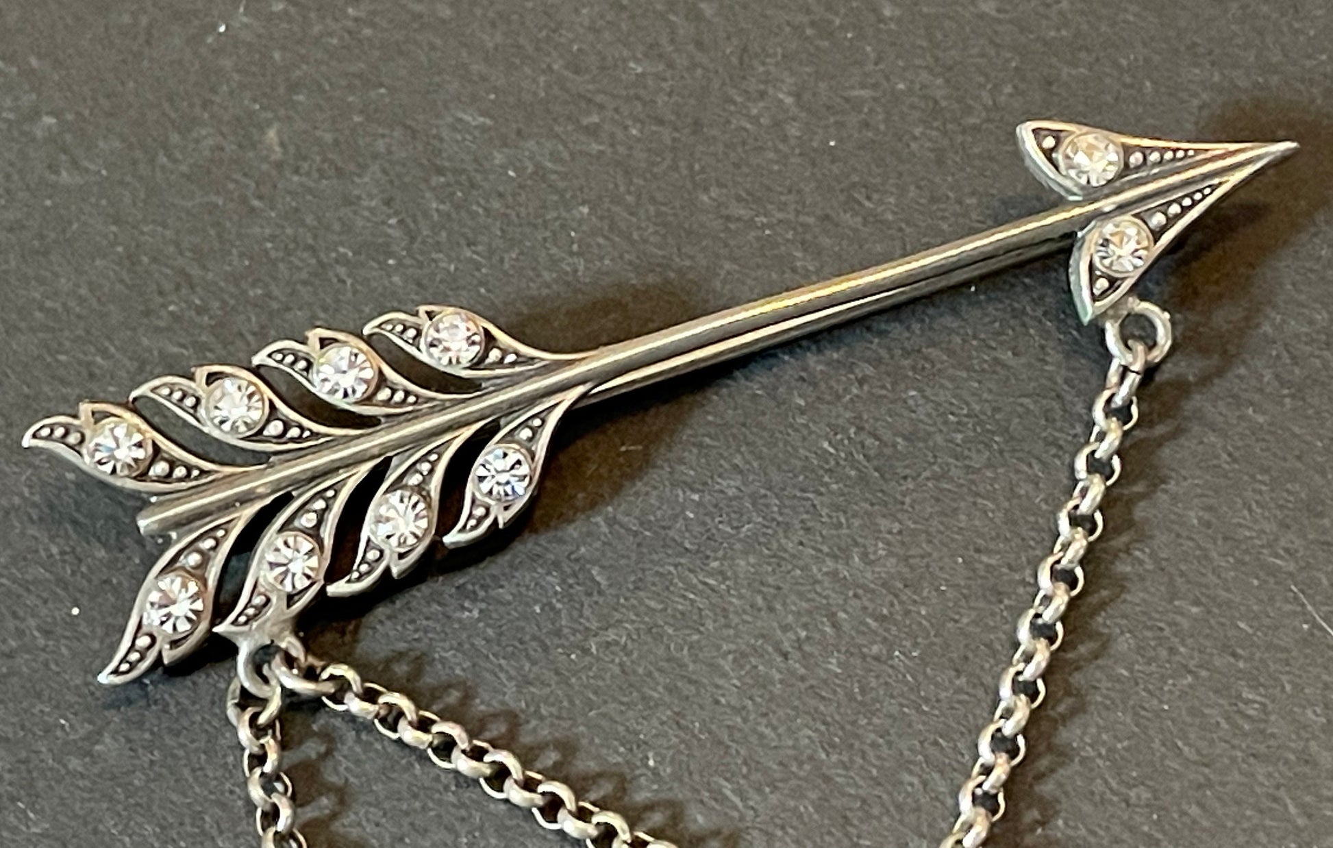 Vintage cupid's arrow ornate festoon brooch in antique silver tone. The design is gorgeous and whimsical with a large cupid's arrow embellished with clear rhinestones at the top, with asymmetric dangles of items representing love beneath. There is an ornate 'key to my heart', an engraved heart shaped locket which is hinged and fully functional and finally a figure of cupid.