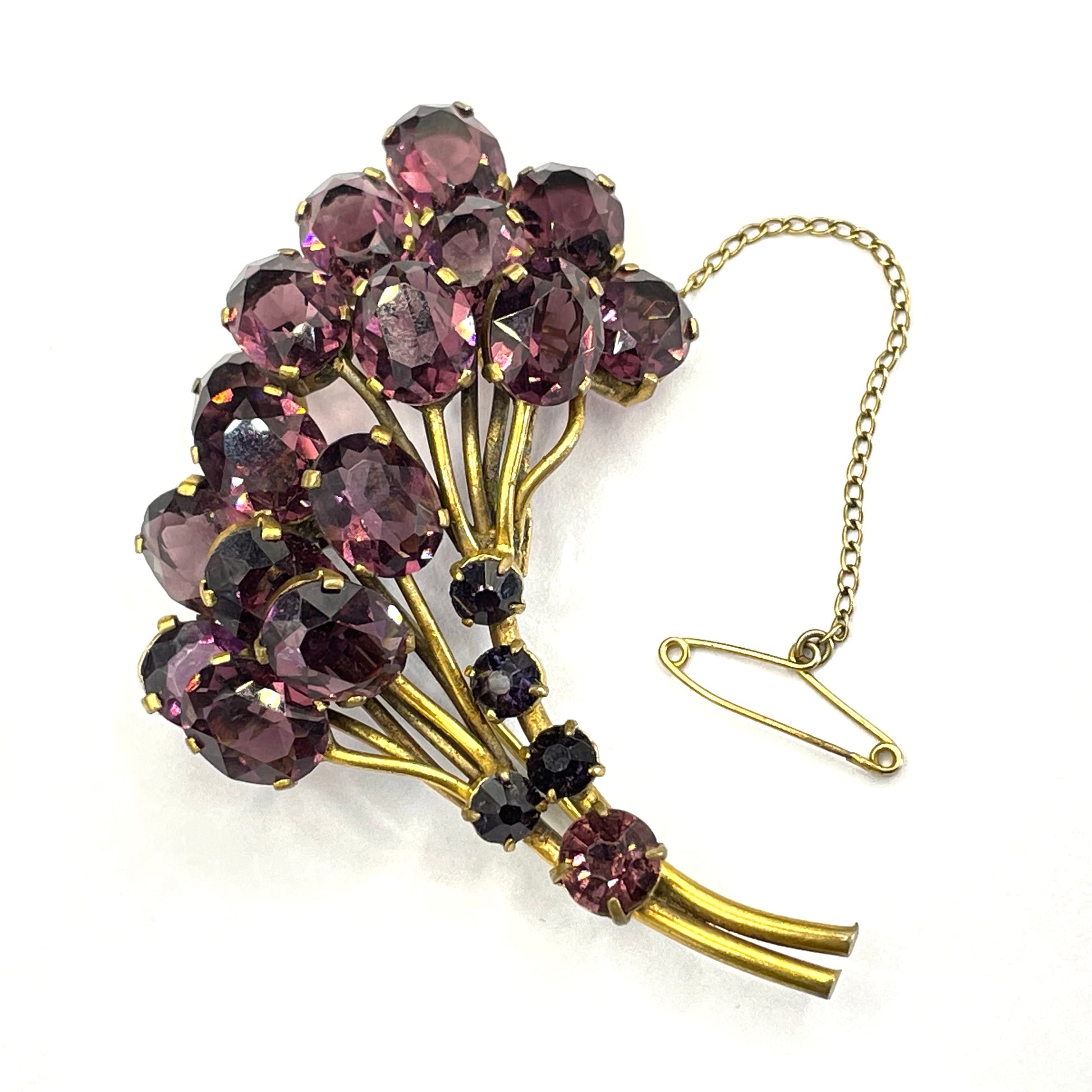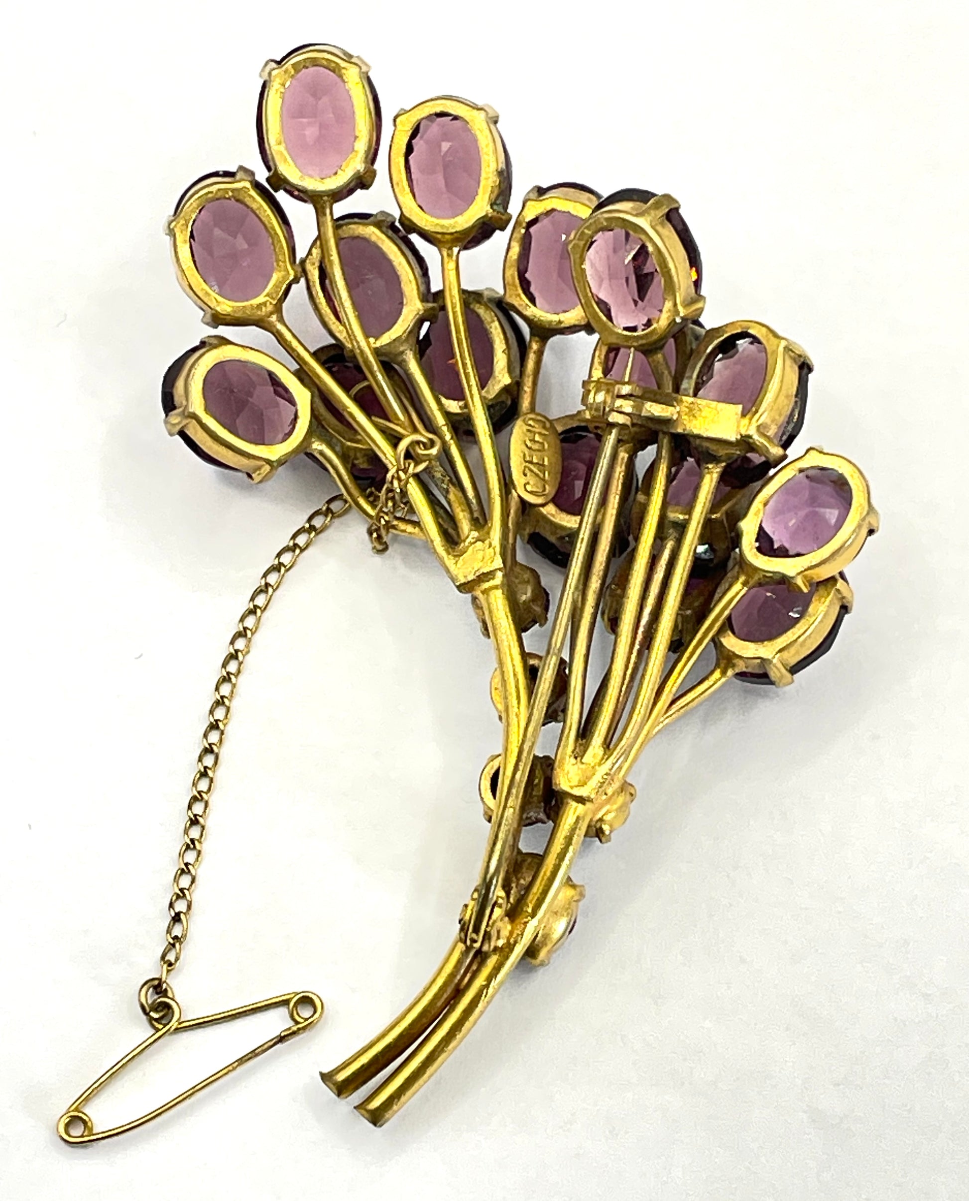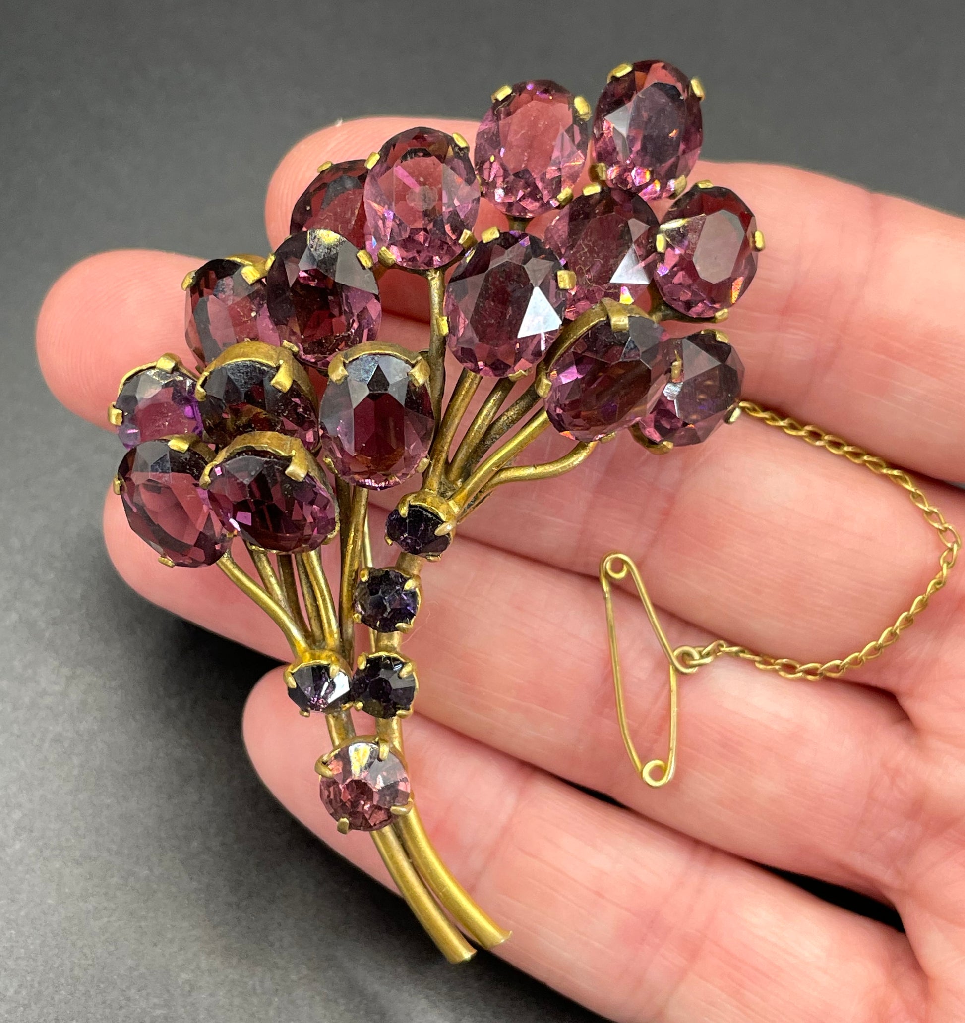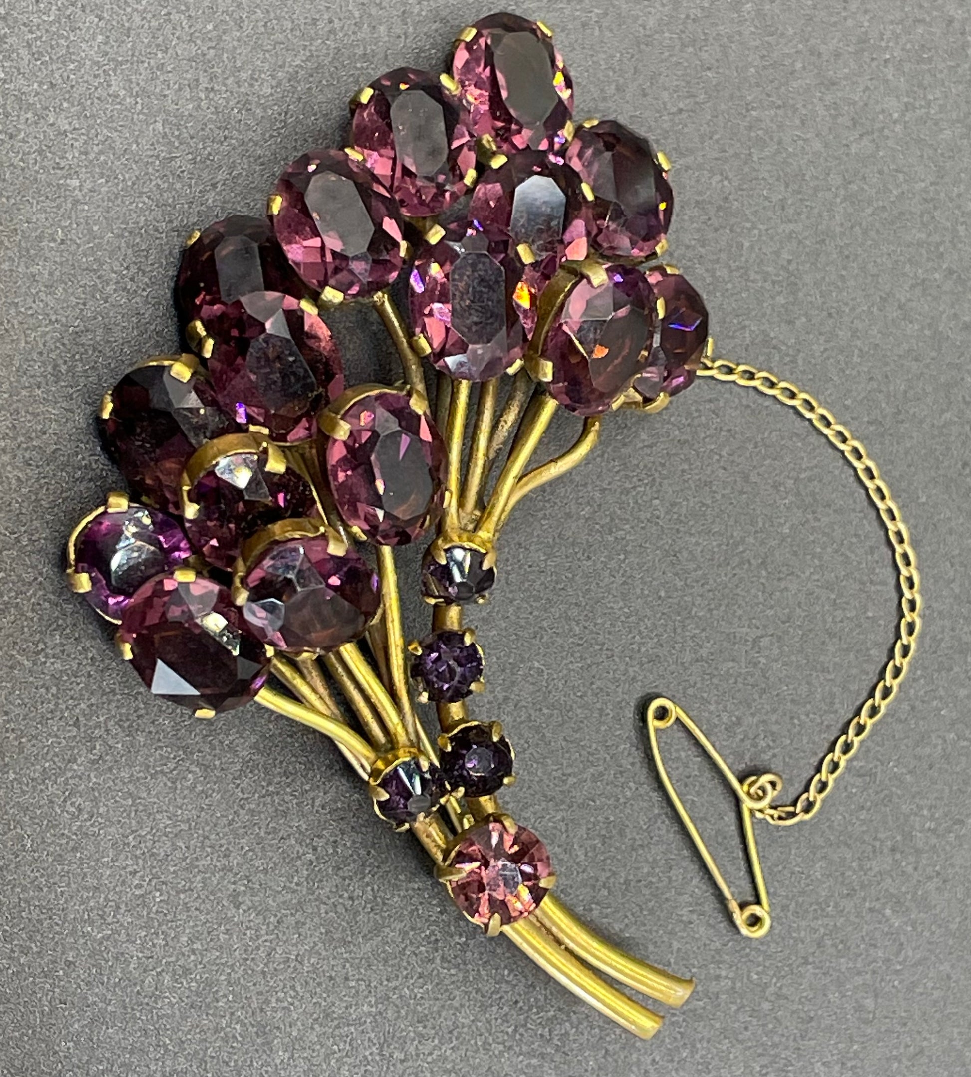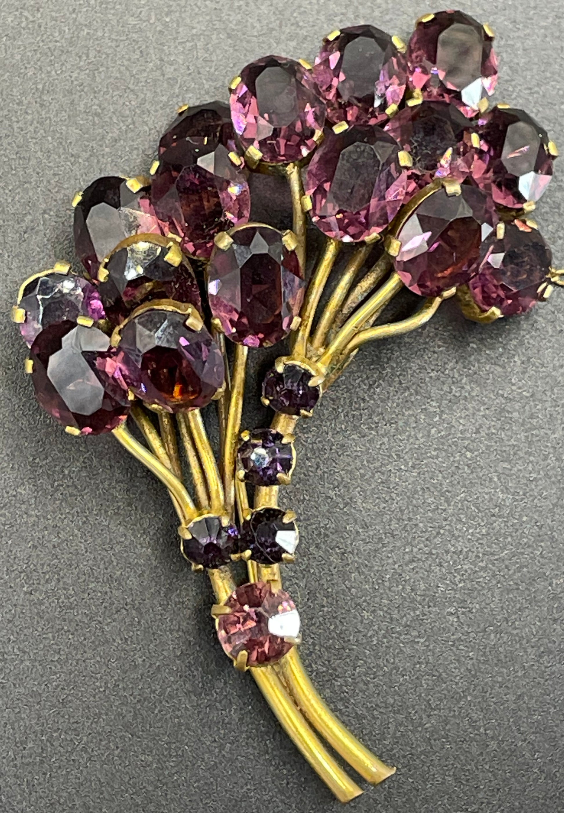 Large vintage Art Deco gorgeous vibrant amethyst purple crystal Czech flower bouquet brooch, open-backed rhinestones in gold tone