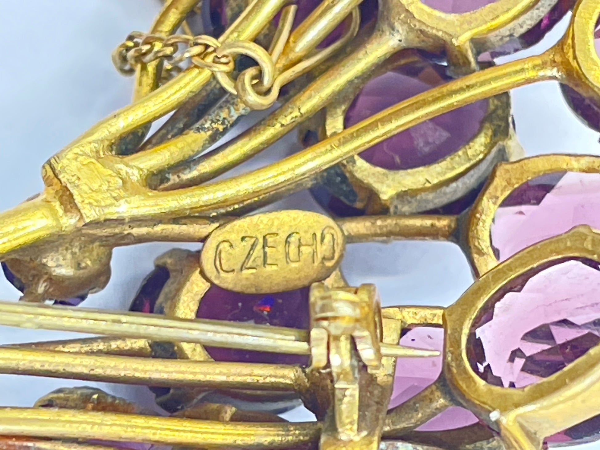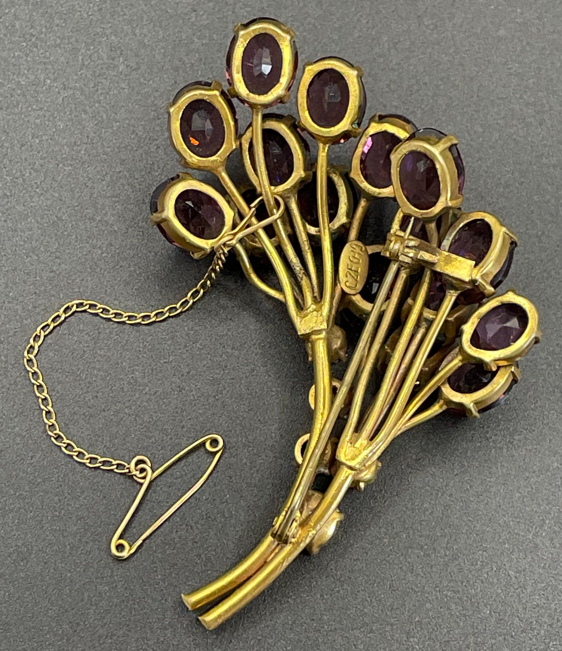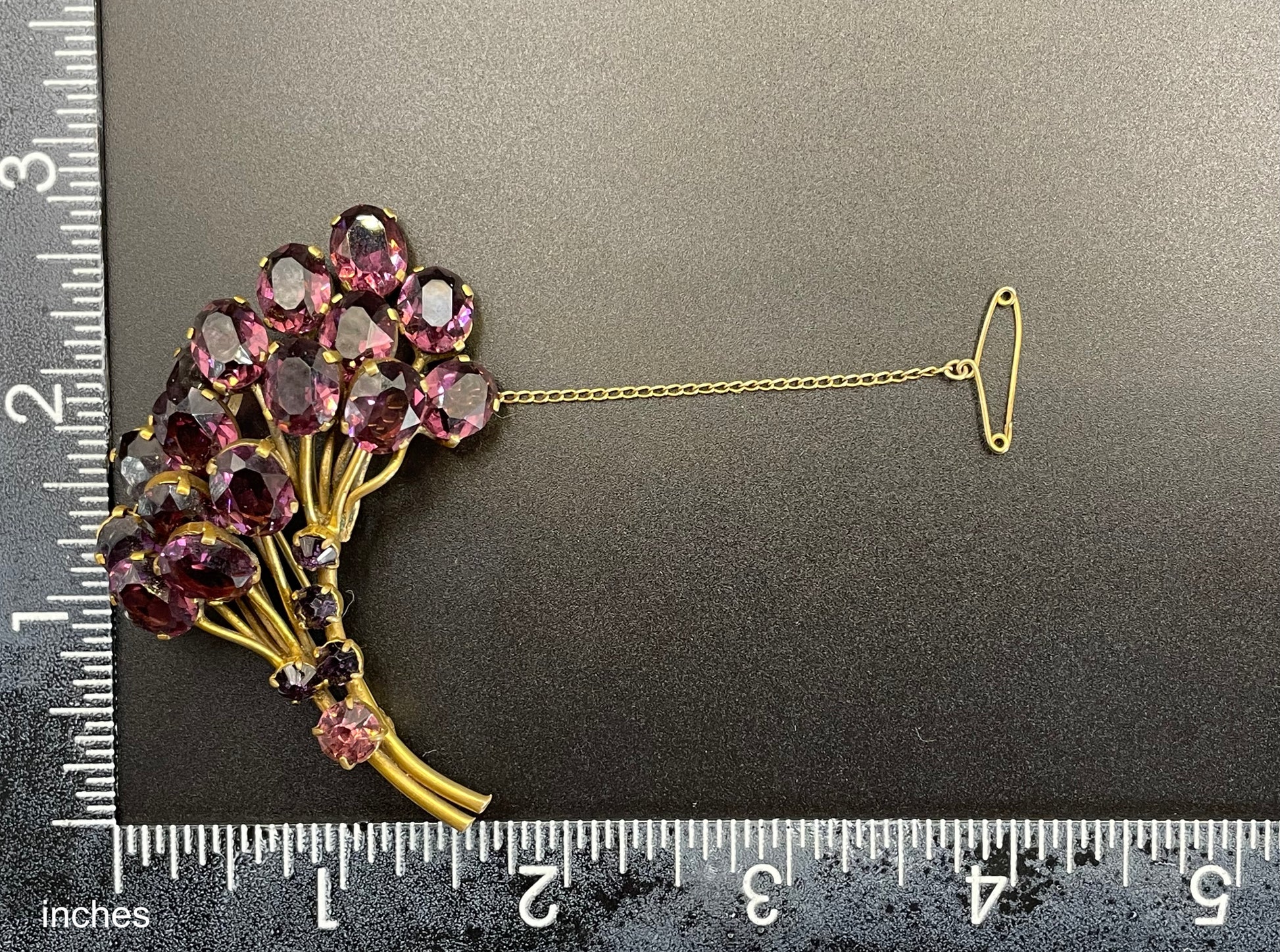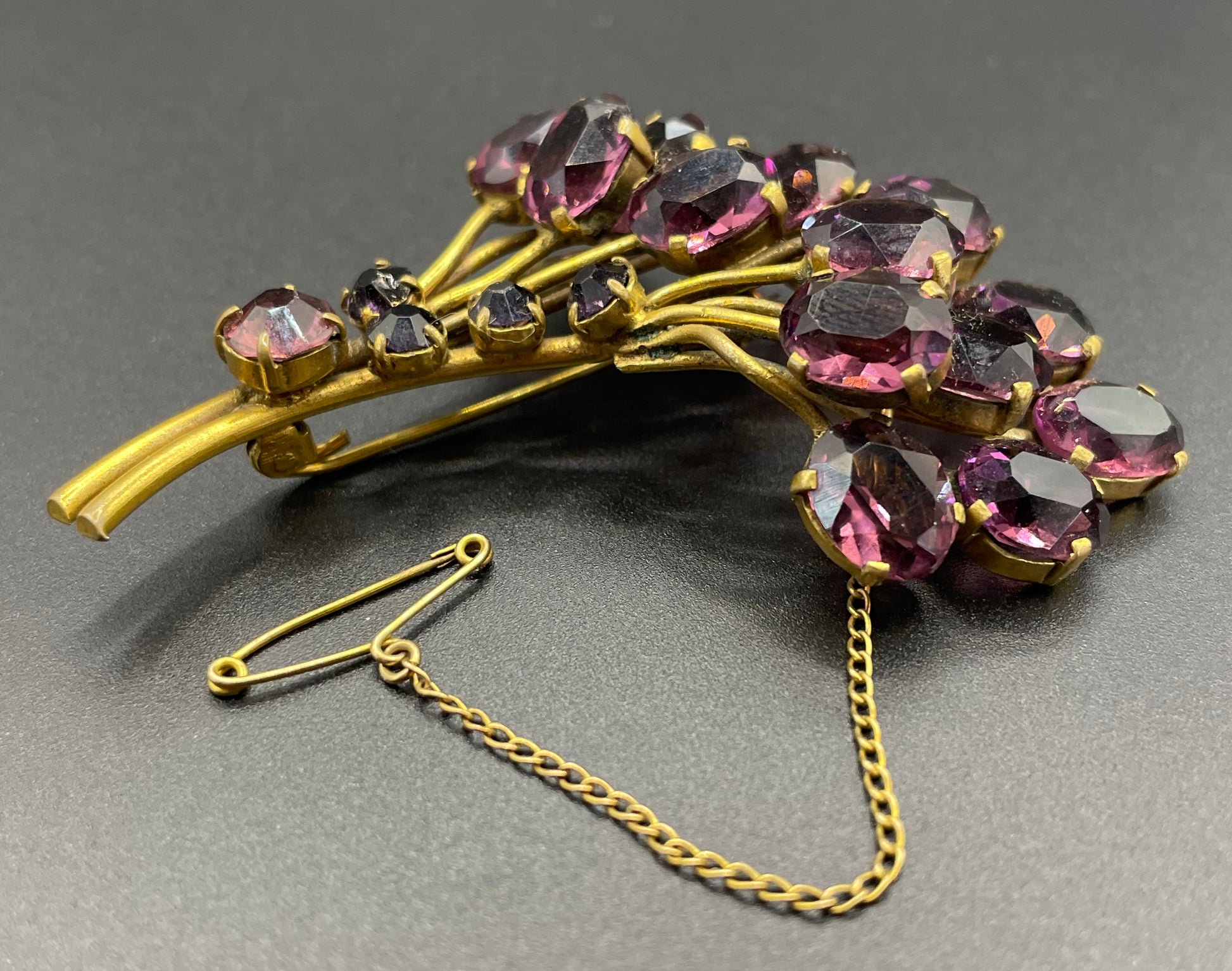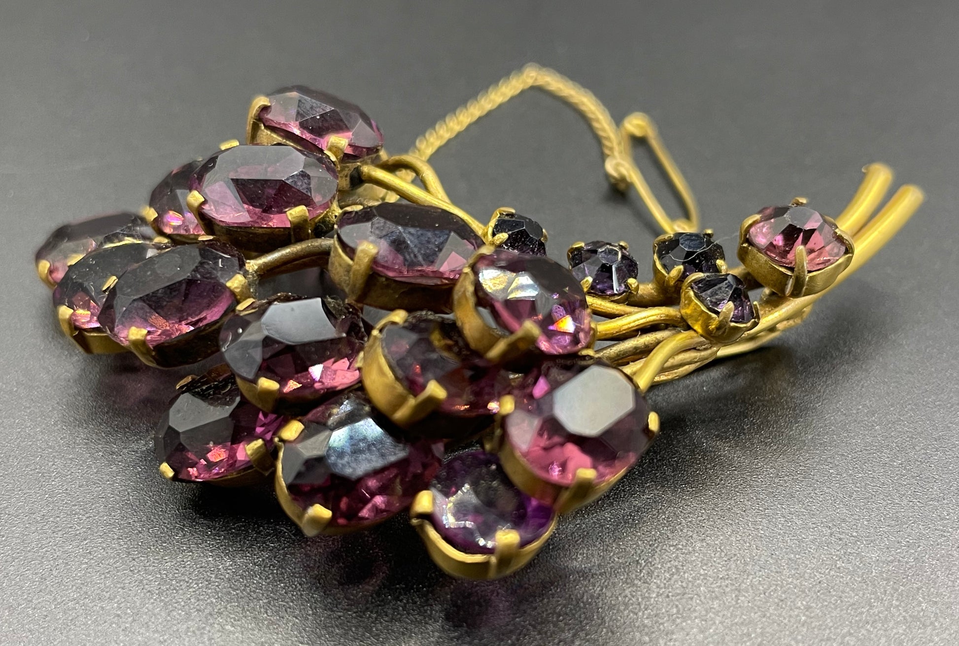 Large vintage Art Deco gorgeous vibrant amethyst purple crystal Czech flower bouquet brooch, open-backed rhinestones in gold tone