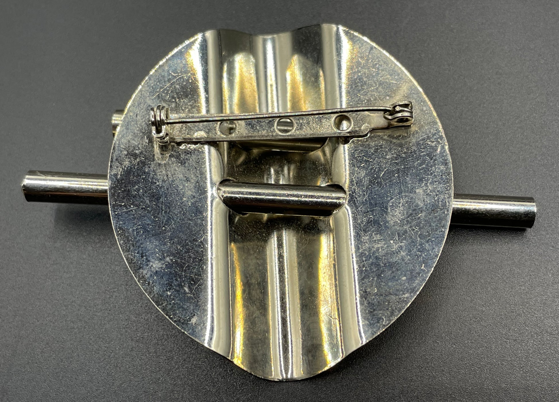 Large vintage Art Deco style brooch in shiny silver tone chrome, with a streamlined three-dimensional space age shiny chrome design. The lighting for the photographs gives the surface a yellow/gold glow in places, but this is solely the lights, the brooch is completely silver tone.