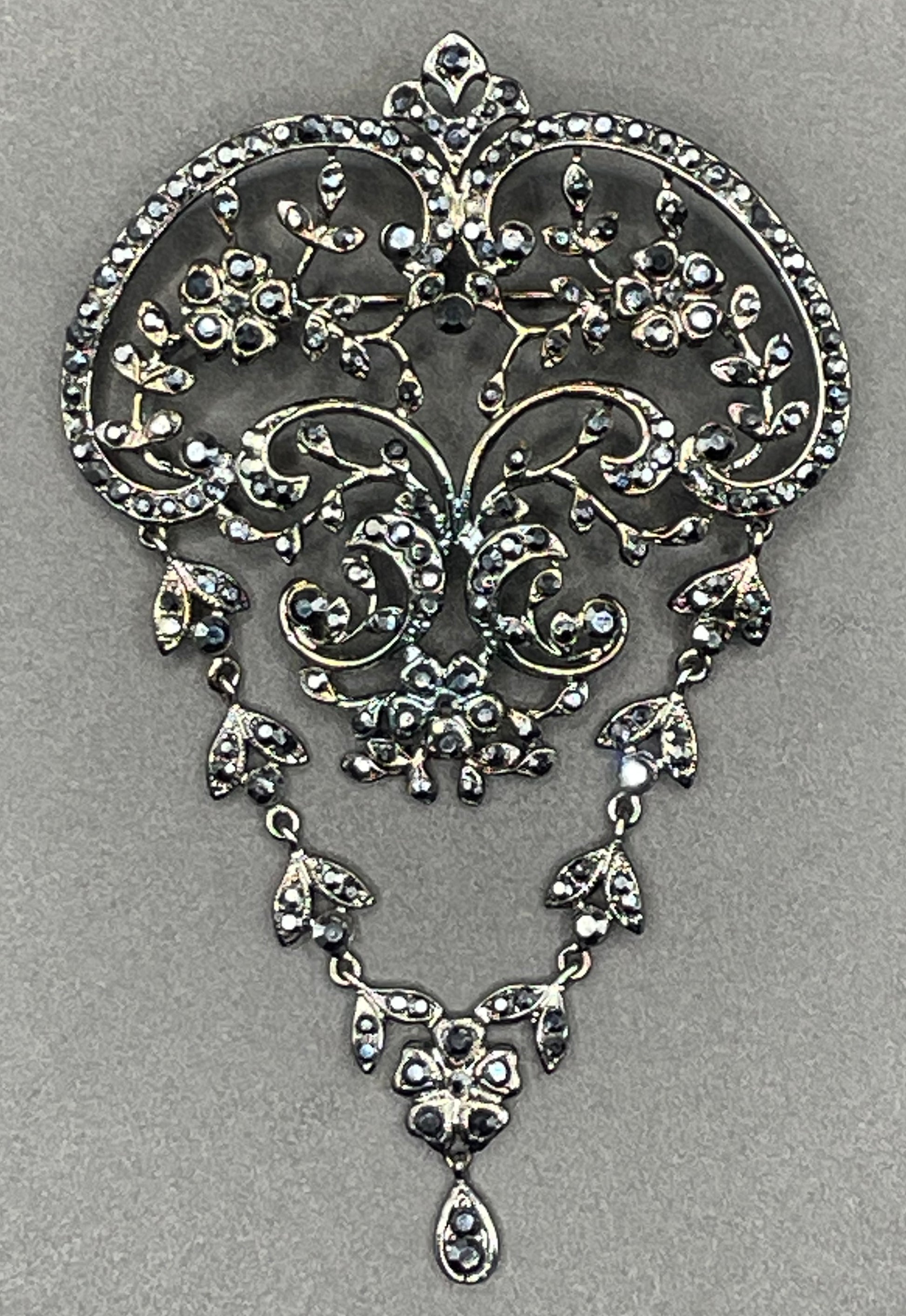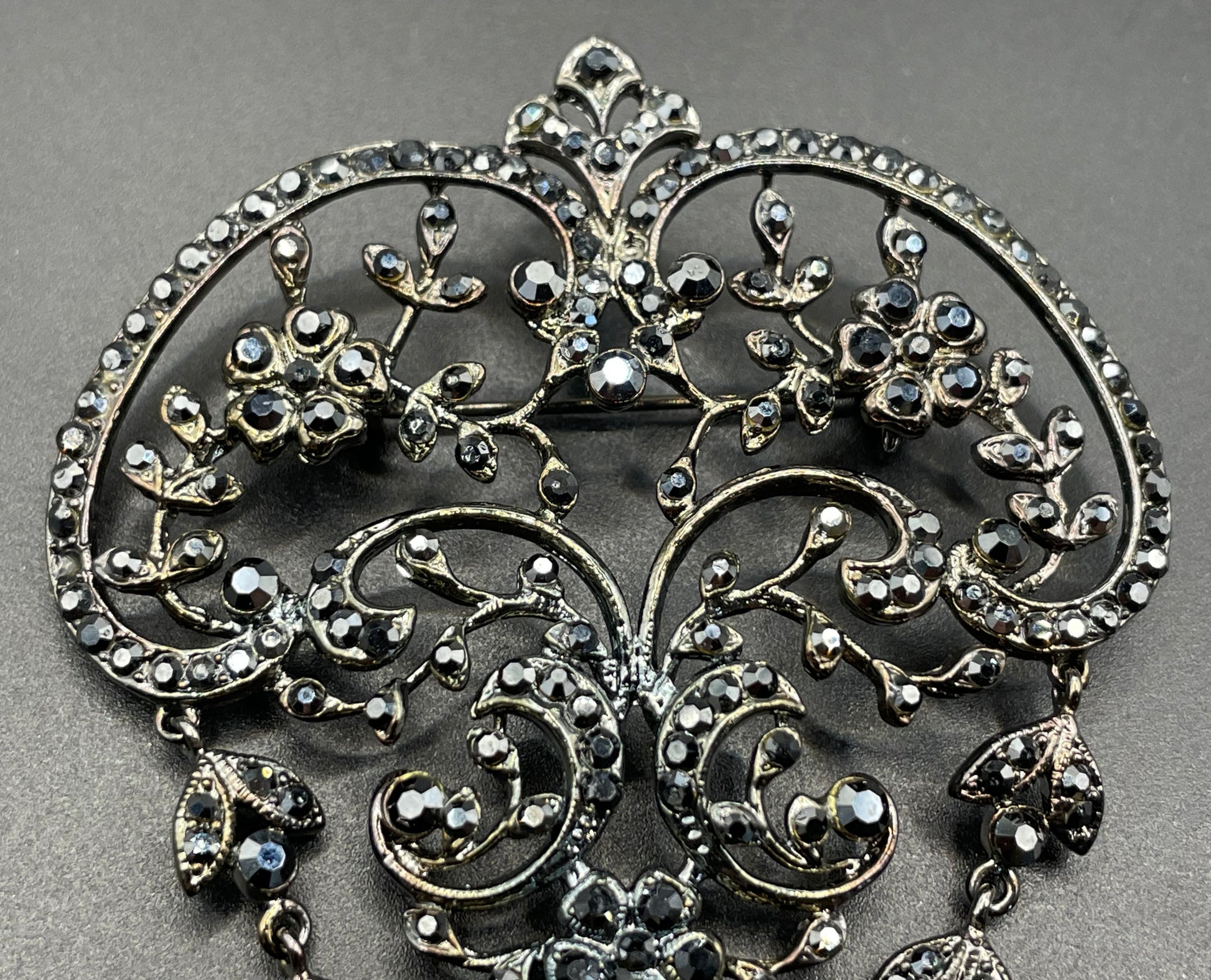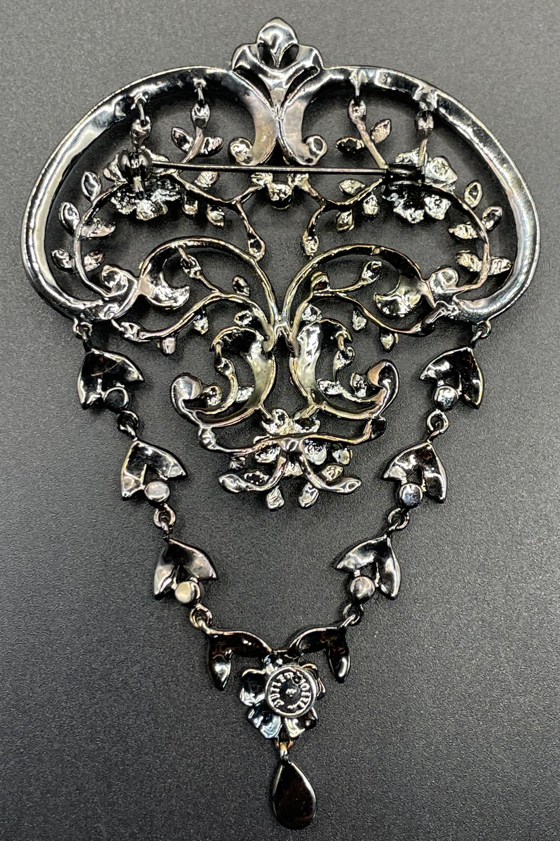 Large vintage Butler and Wilson (B&W) signed blackened silver tone and black French jet rhinestone ornate festoon 'stomacher' brooch