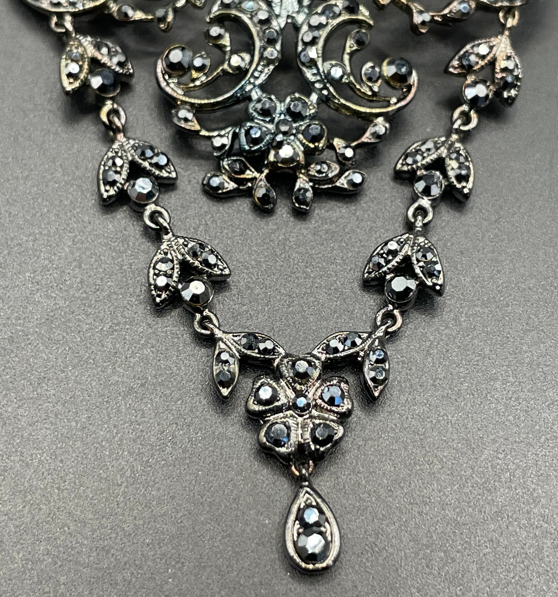 Large vintage black rhinestone and darkened silver tone ornate festoon stomacher brooch signed by iconic makers Butler and Wilson. This is a very Victorian to Edwardian revival style piece, probably made in the 1980s or thereabouts, and in a lovely large statement style. It has pave set jet black rhinestones set in japanned silver tone.