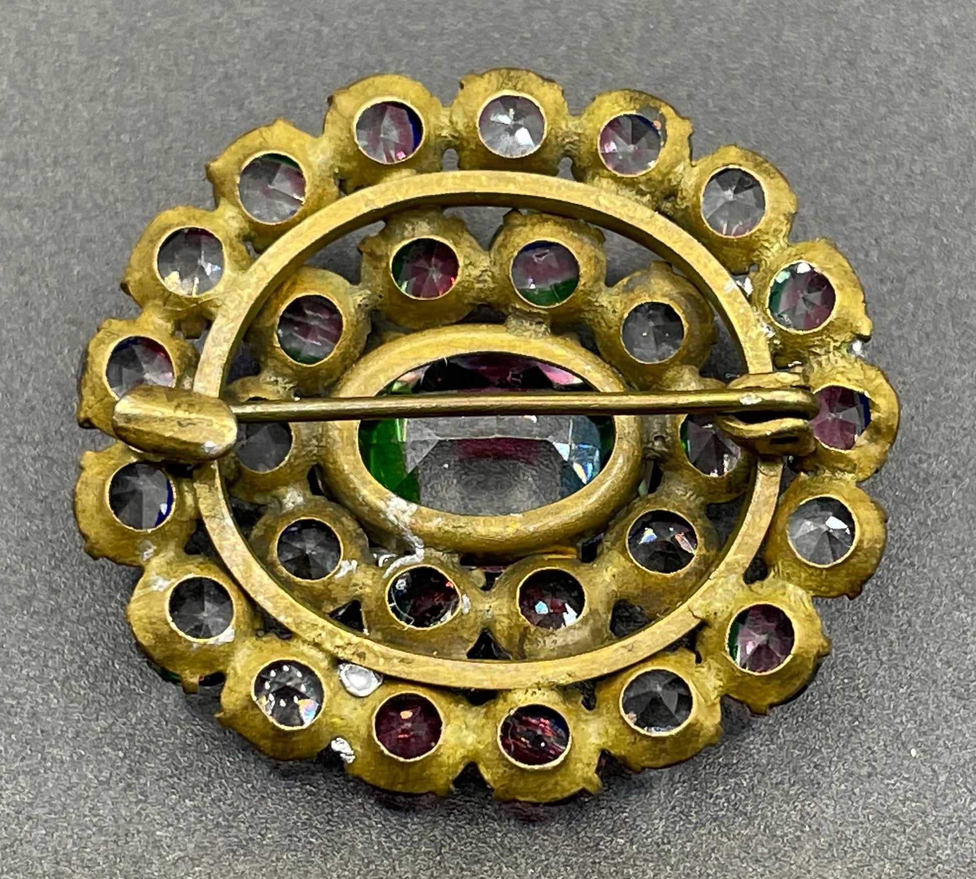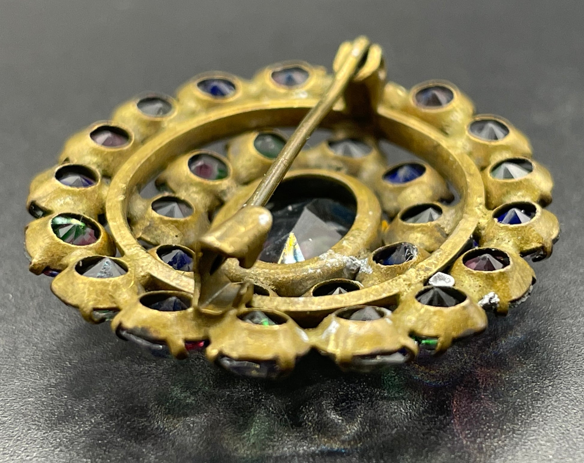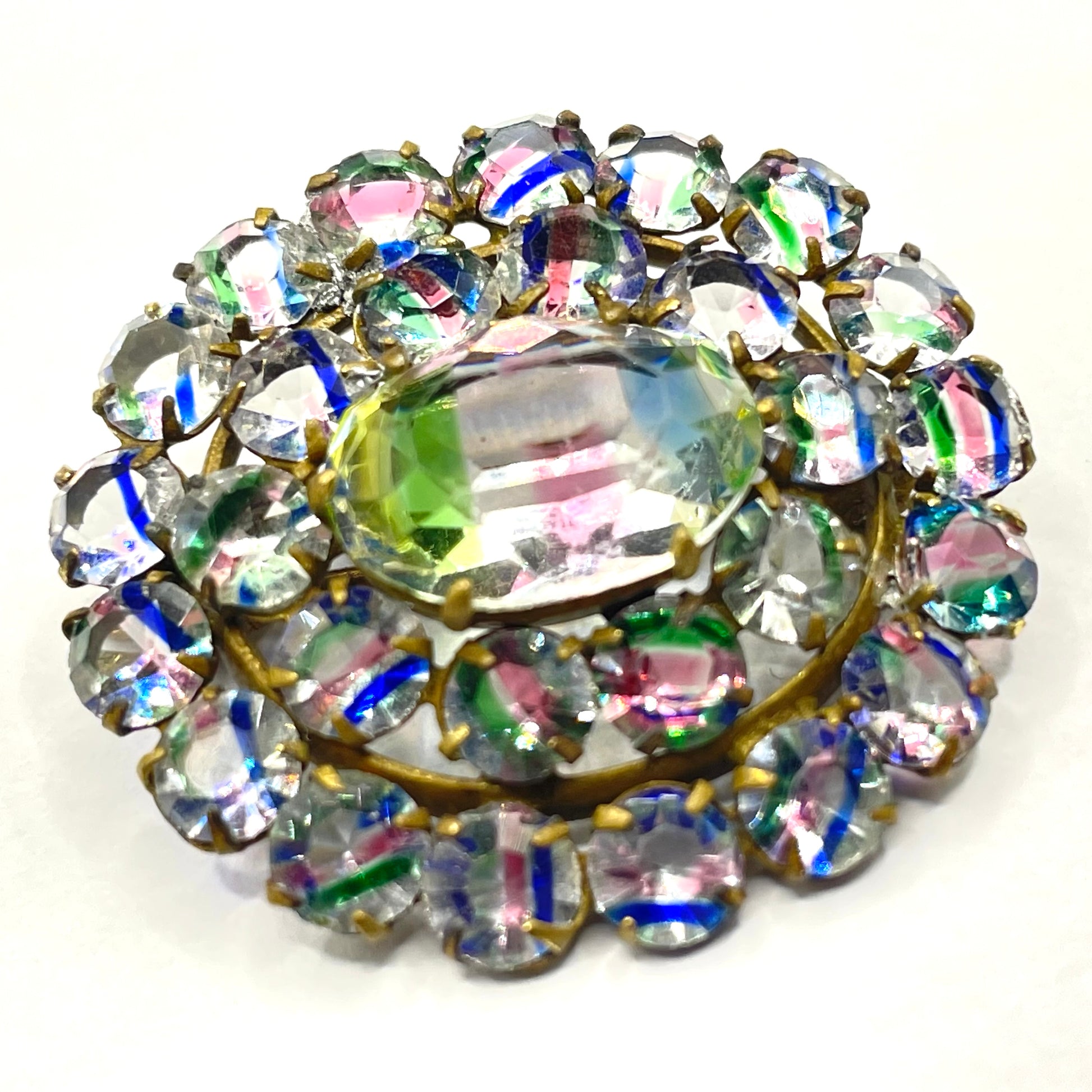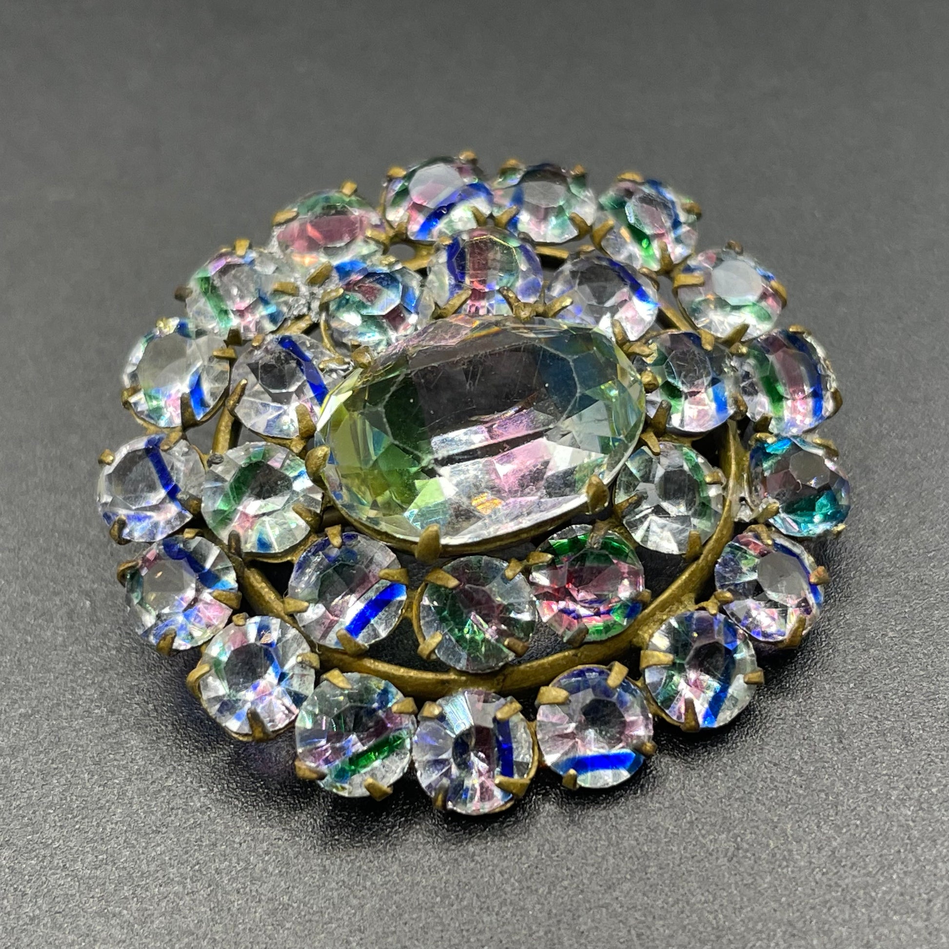 Gorgeous Czech rhinestone Art Deco brooch with remarkable iris glass rhinestones claw / prong set in antique gold tone. Characteristic Czech construction and fixings for the period, fastening with a pin and old style C clasp.