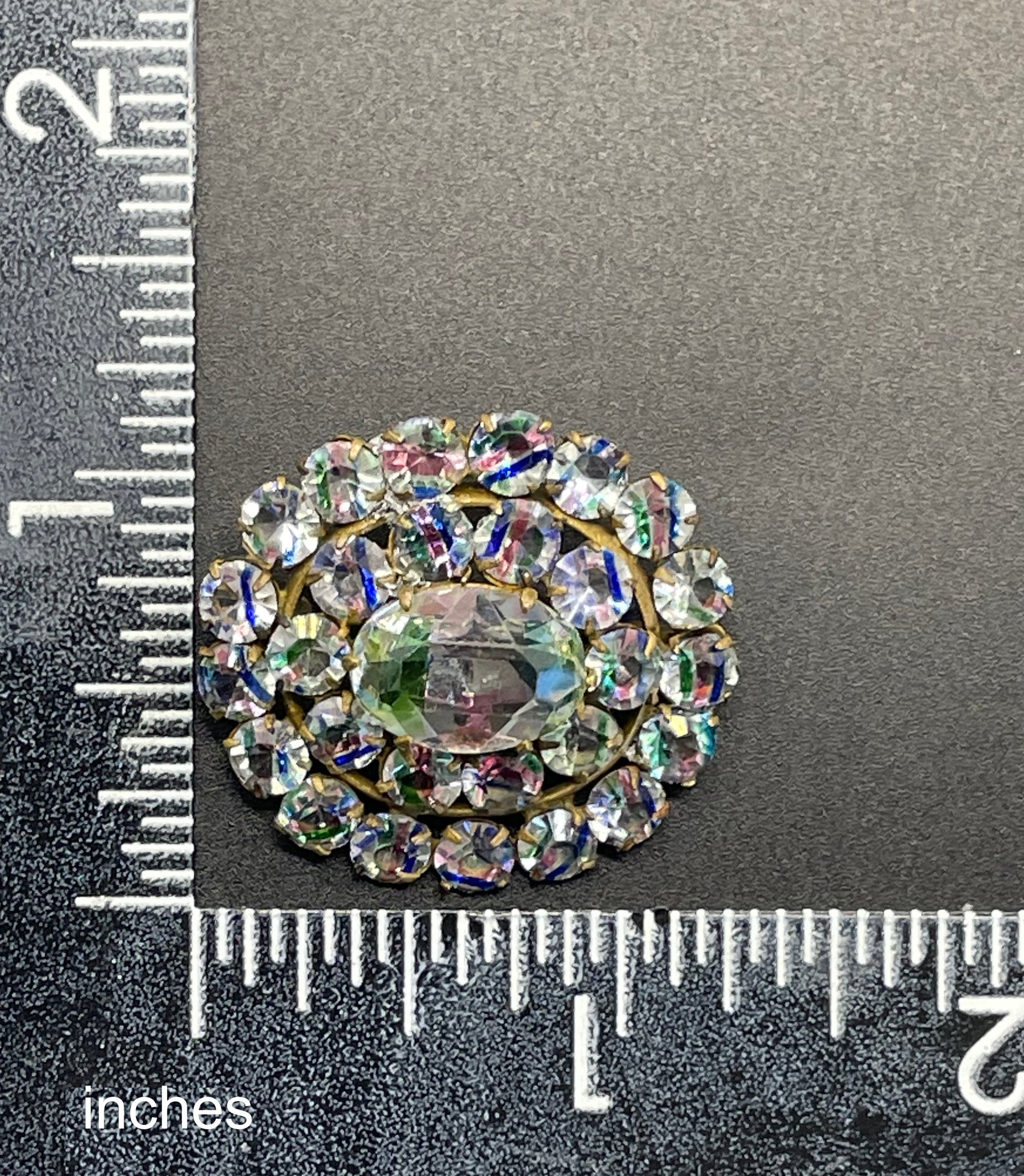 The brooch is about 1 1/4 inches long and 1 1/8 inches wide and is in good vintage condition. There are one or two small imperfections in the rhinestones commensurate with age.
