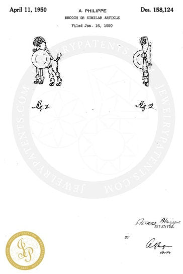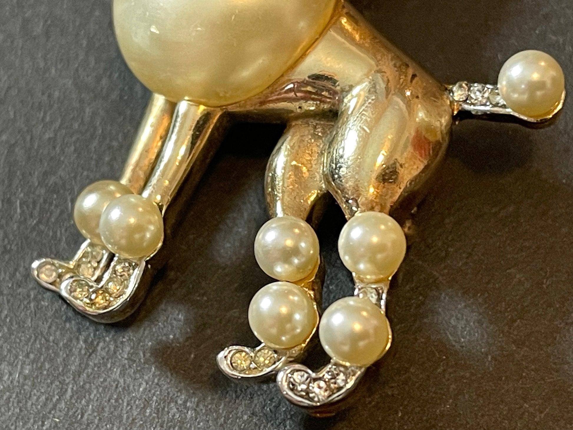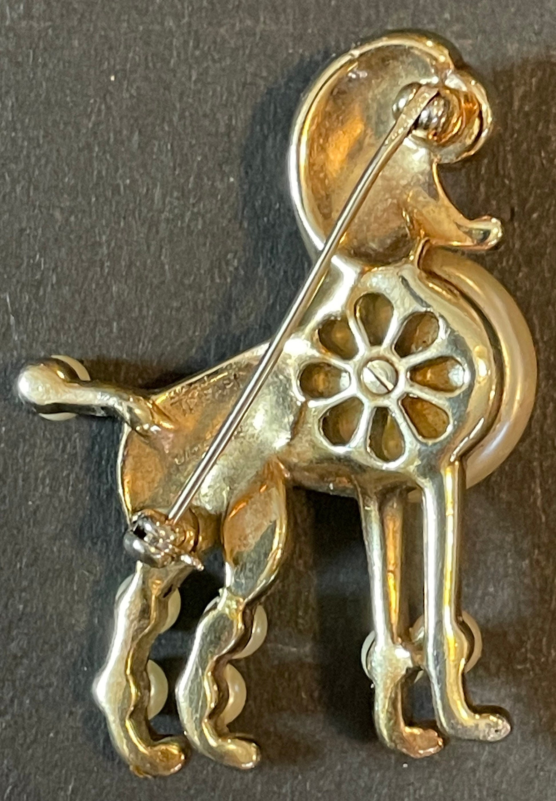 Rare signed Trifari vintage poodle brooch, 1950 patent of the Alfred Philippe design, gold tone, glass pearl and rhinestones