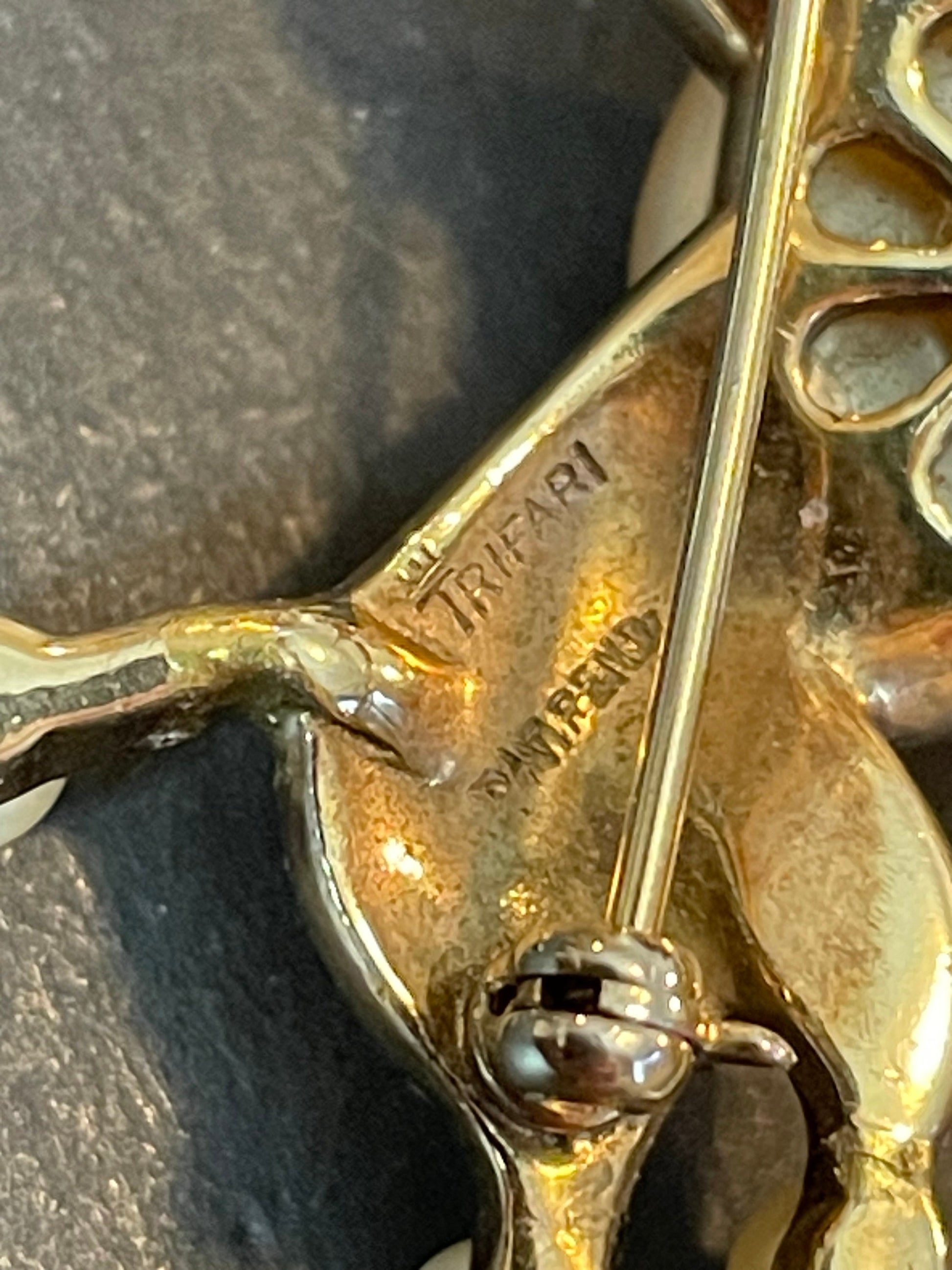The piece is stamped on the back - 'Pat Pending' along with Trifari with the crown over the T. Information on this brooch can be found in the book American Costume Jewelry vol 2 p152. The last picture shows the patent applied for by designer Alfred Philippe and gained in 1950. The brooch is in very good vintage condition - please examine the pictures carefully for a full condition report - some slight unevenness on the large pearl cabochon and minor wear to the gold tone, but all rhinestones and glass pearls are in place.