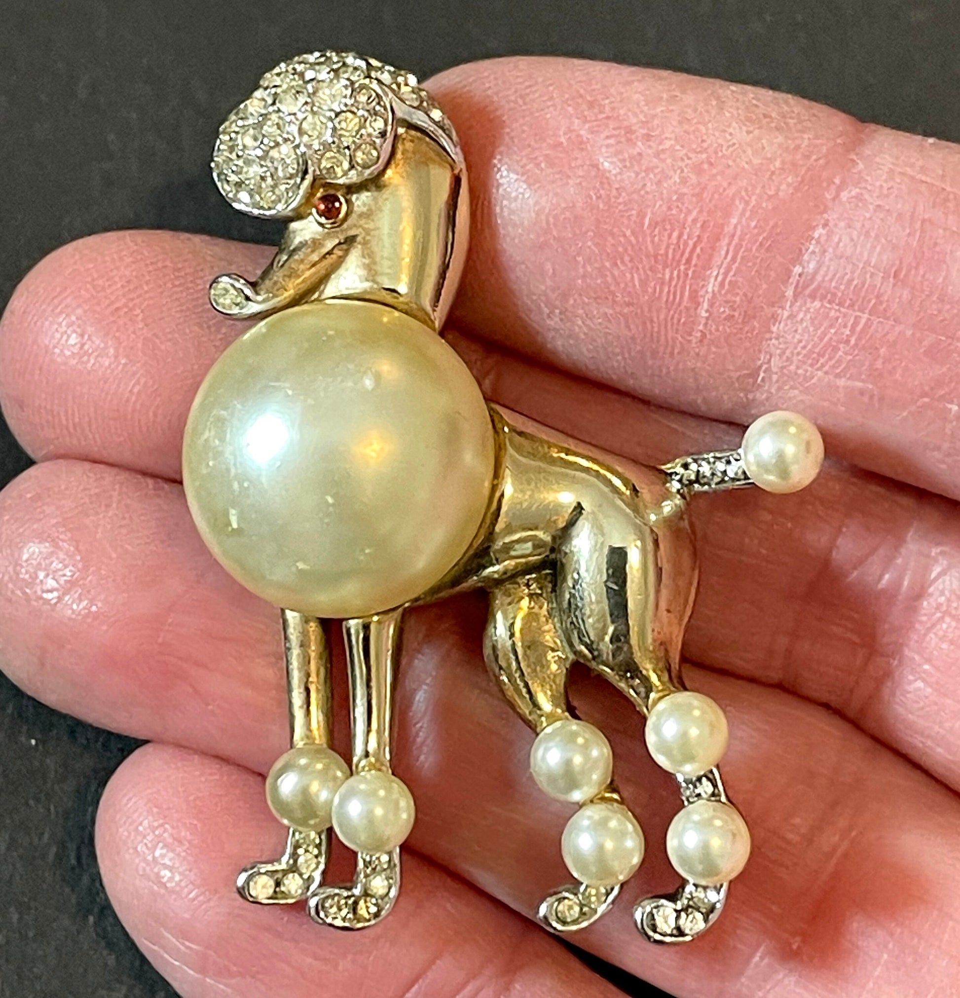 Beautiful vintage crown Trifari poodle brooch, featuring a large faux pearl cabochon for the body and smaller glass pearls on the legs and tail. The head and feet are accented with sparkling pave set rhinestones and there is a tiny red glass cabochon for the eye, all in a gold plated finish. The design is beautifully constructed with amazing attention to detail in body and form.