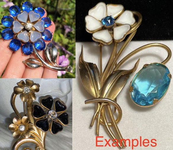 There are many similar pieces online either signed Trifari, or seen in old Trifari magazine advertisements or patent applications. However, the shape of the glass petals is usually slightly different from those in this necklace - less heart-shaped. In this listing, I have included as the last picture some examples of pieces - all fur clips / pins - with exactly the same shape of glass petals. None of these clips is signed, so I am still wondering if these are by Trifari or some other maker. Alfred Philippe for Trifari patented a very similar design in 1941. Let me know if you have further information!