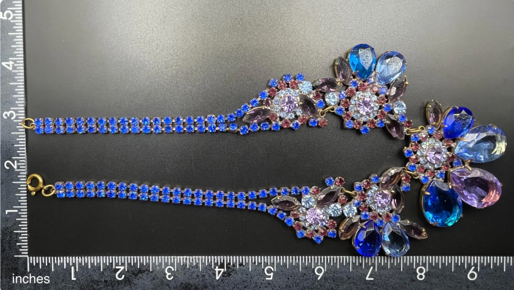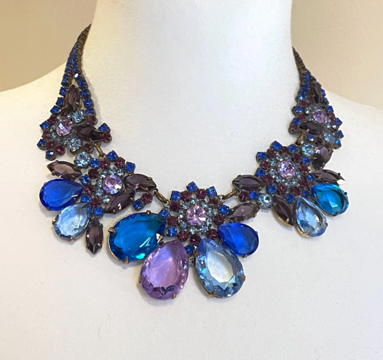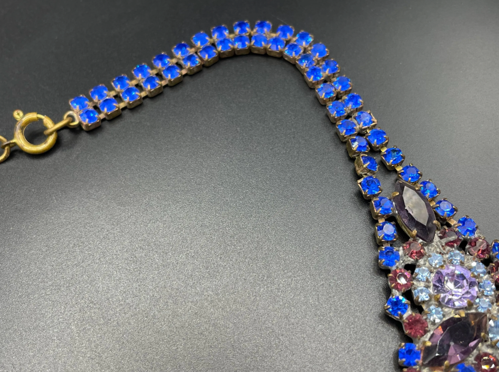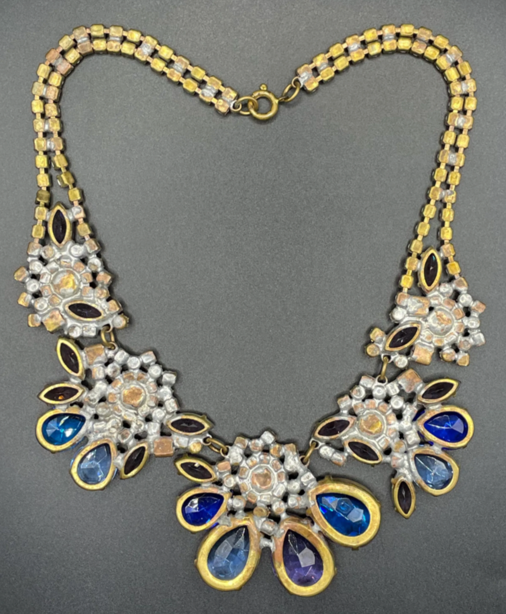 Glamorous and huge vintage rhinestone bib necklace set with enormous light blue, royal blue deep amethyst purple and light violet/purple rhinestones in antique gold tone. The largest marquise/navette cut and teardrop/pear cut rhinestones are set open-backed to allow the light to stream through. The visible soldering on the back of the necklace suggests more recent Czech makers - this one is not signed.