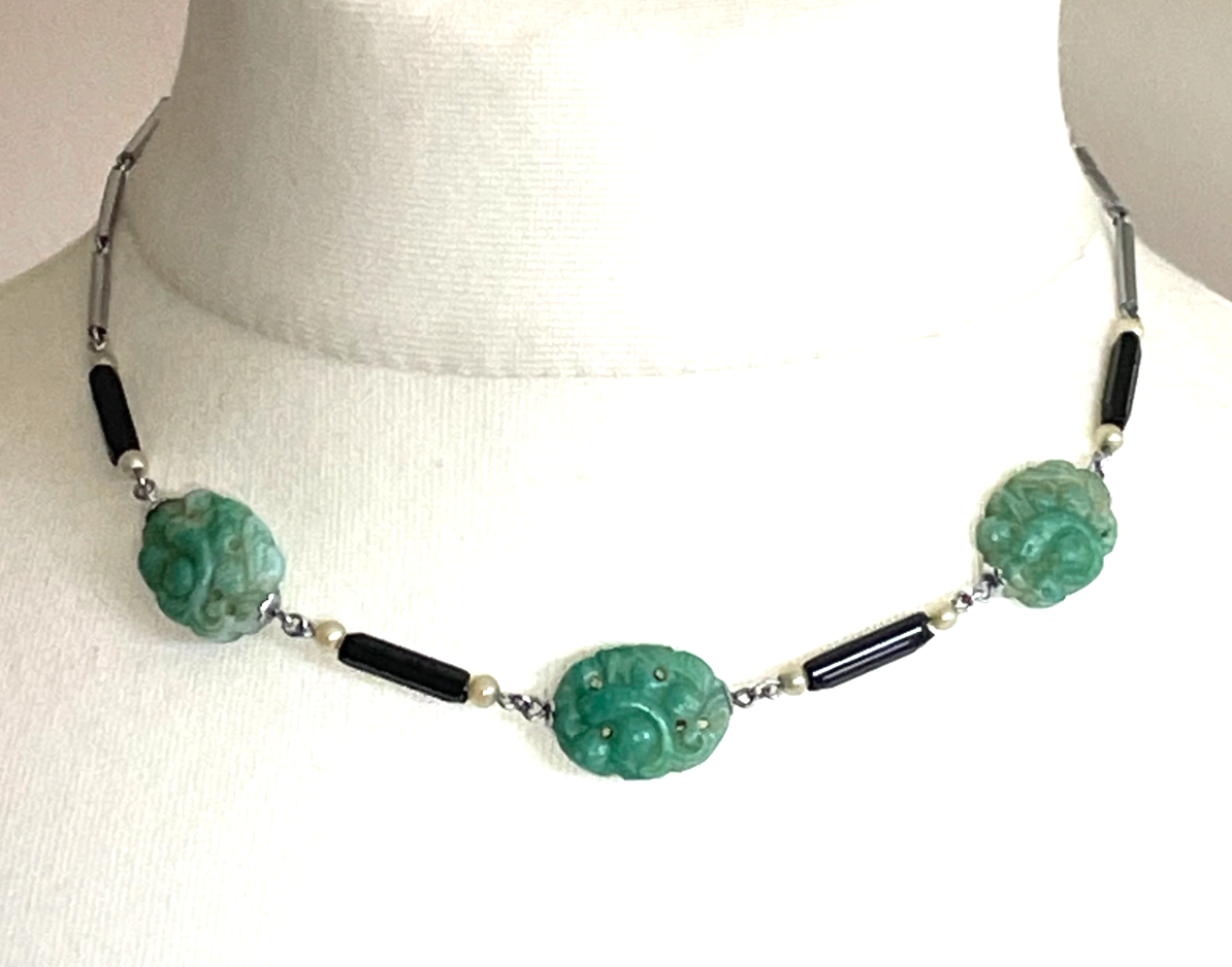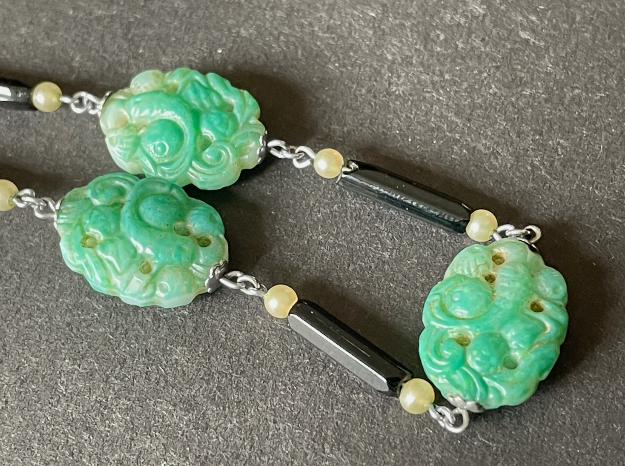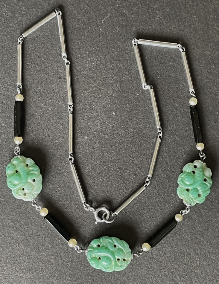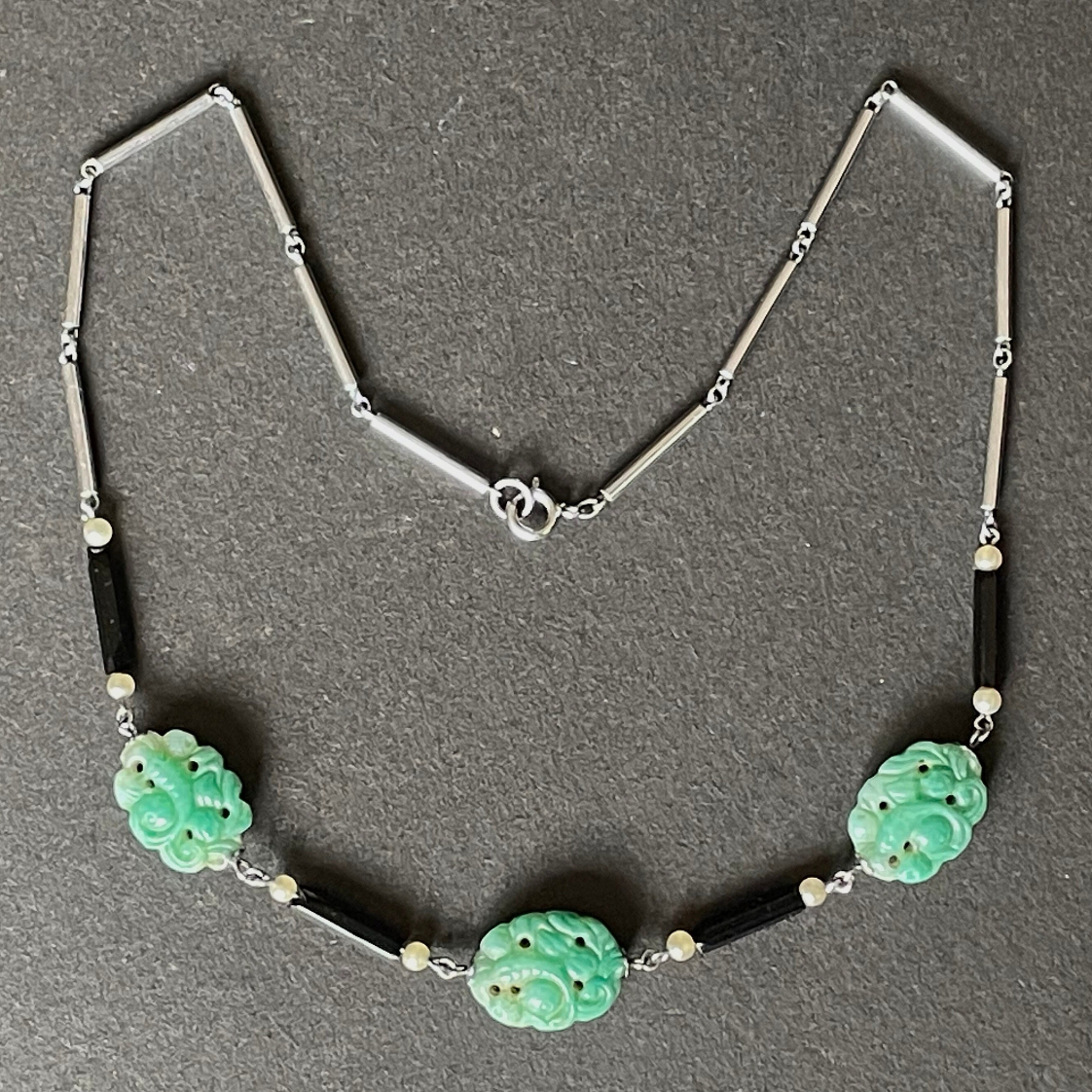 Vintage Art Deco beaded necklace with moulded glass and glass beads in chrome silver tone. There are three beautiful green moulded glass flattened oval beads with a gorgeous Chinoiserie koi crop design. These are interspersed with black French jet glass tube beads and small glass faux pearls.