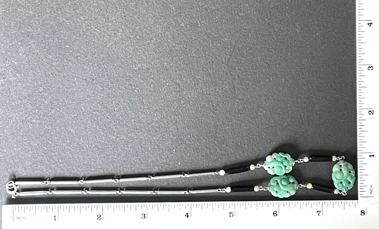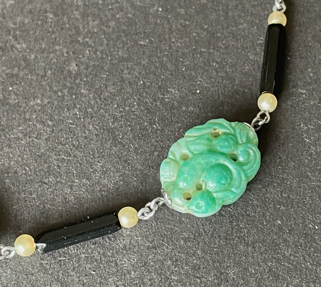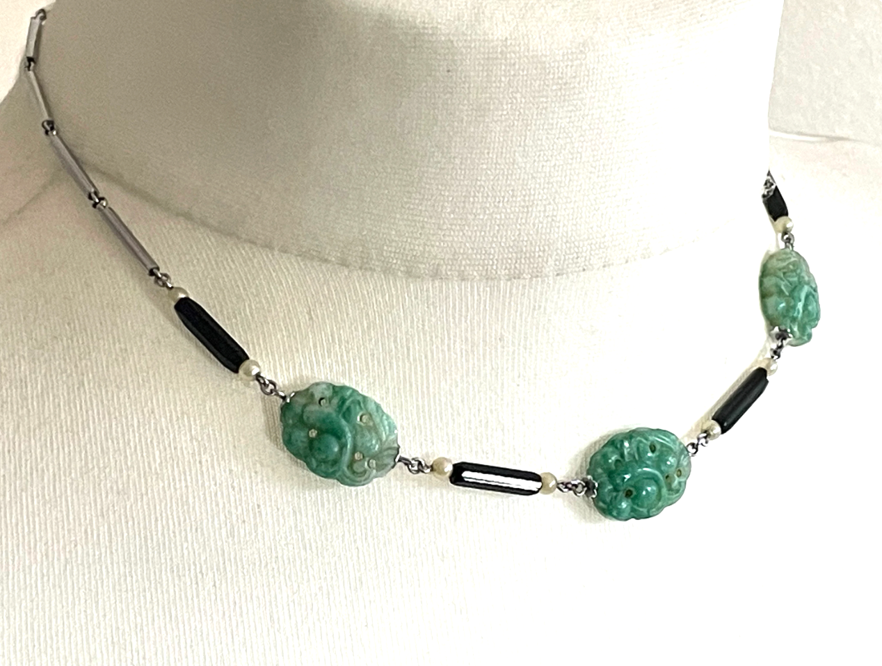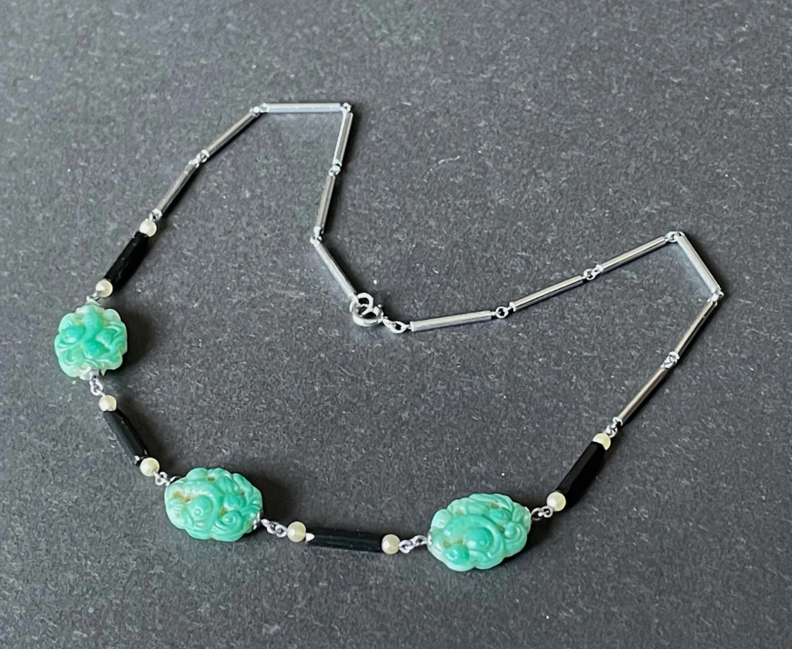 Vintage Art Deco beaded necklace with moulded glass and glass beads in chrome silver tone. There are three beautiful green moulded glass flattened oval beads with a gorgeous Chinoiserie koi crop design. These are interspersed with black French jet glass tube beads and small glass faux pearls.