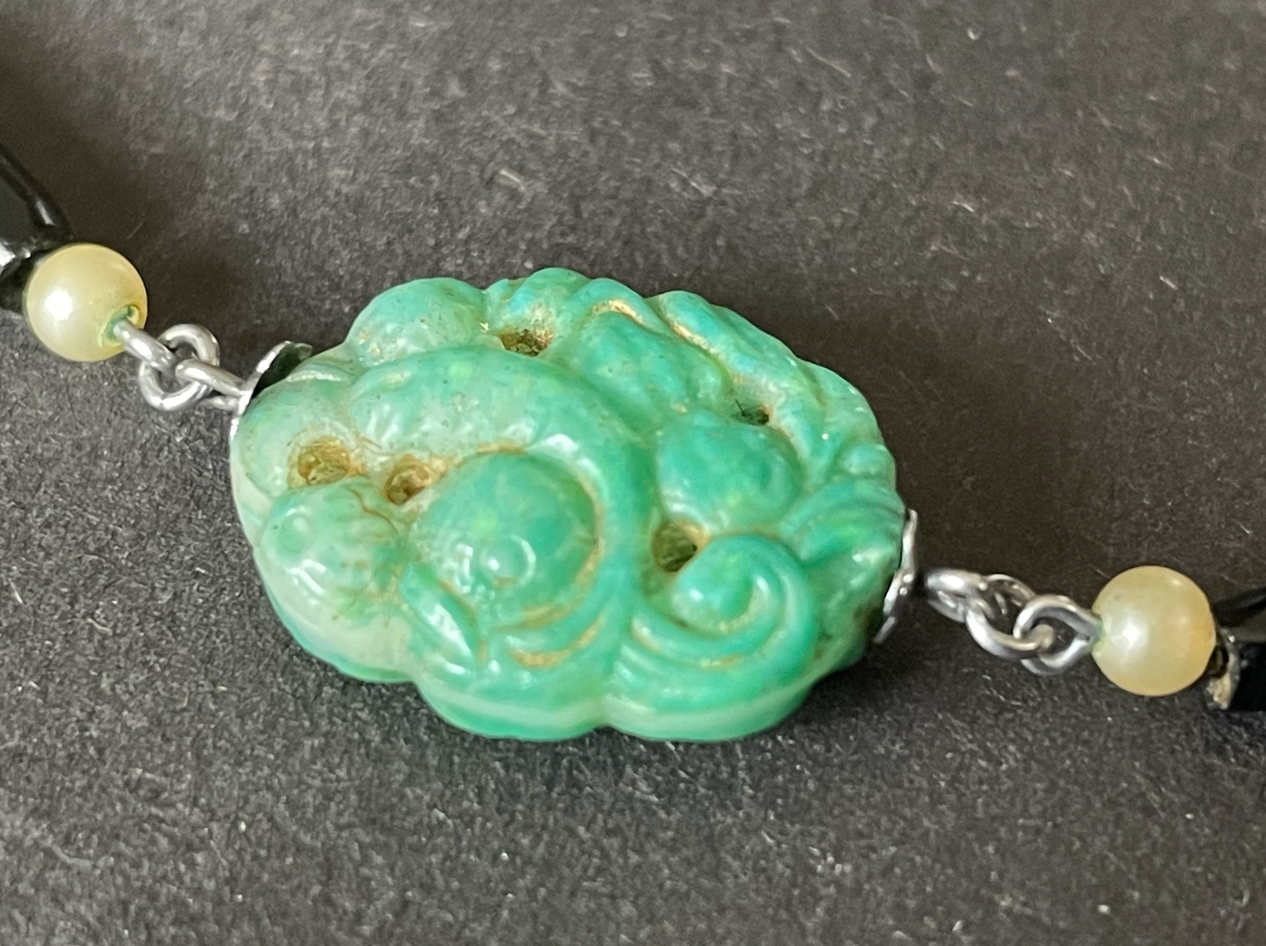 True vintage jade green moulded glass koi carp design bead and French jet black glass and faux pearl bead necklace