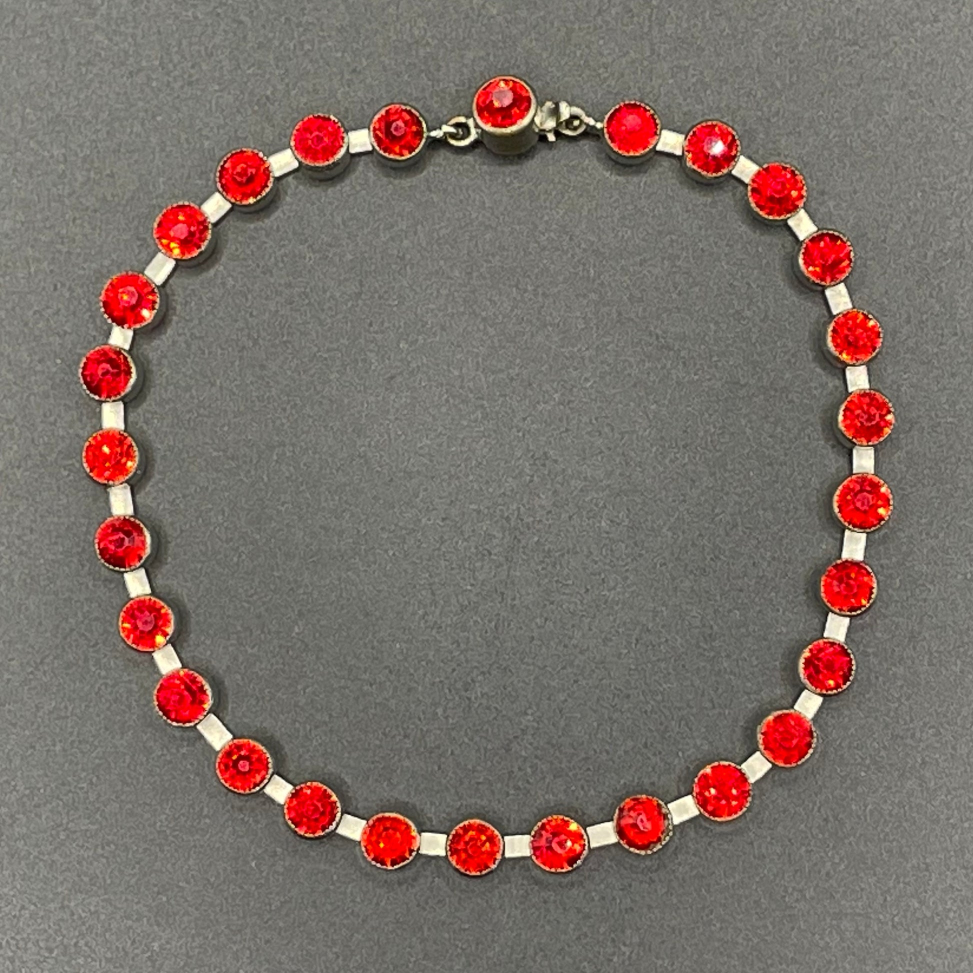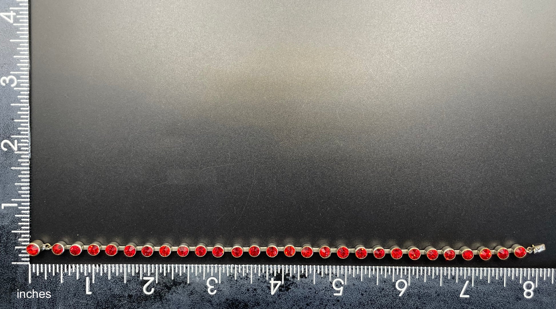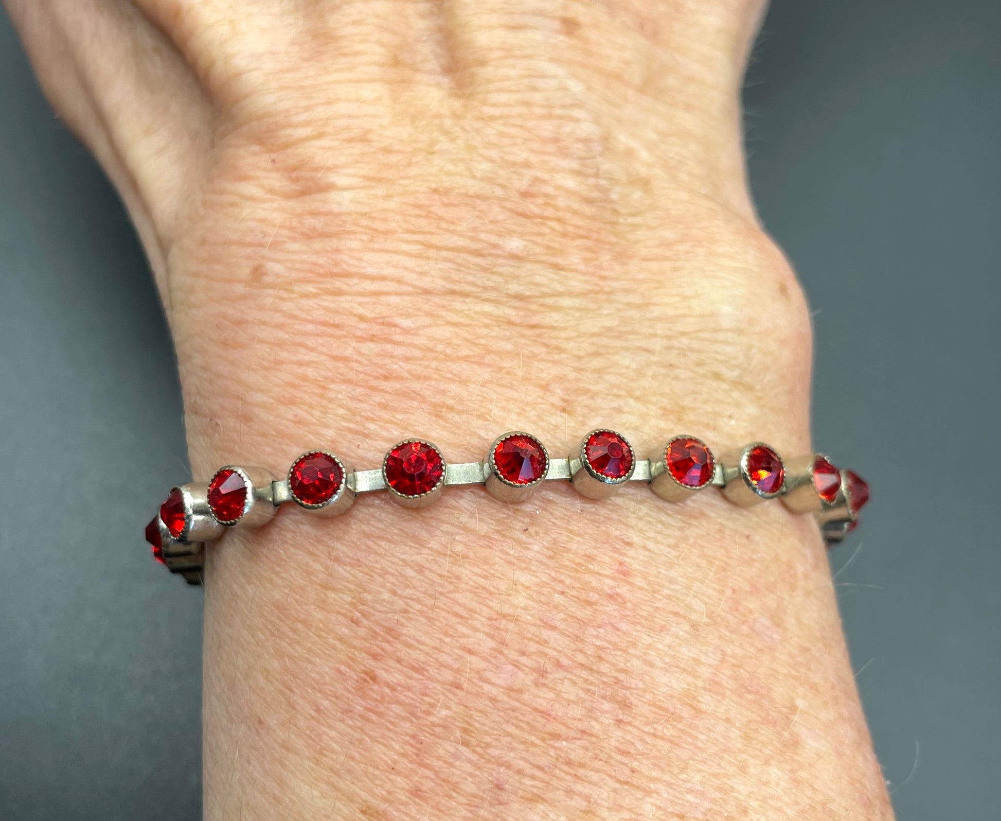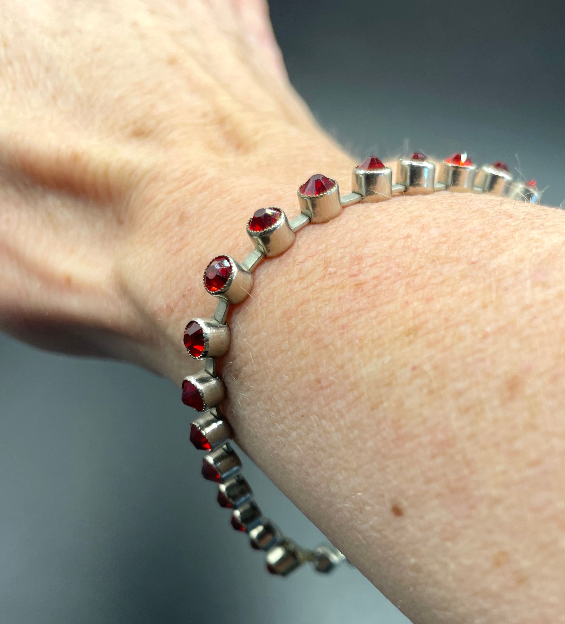 Vintage Art Deco bright red collet set rhinestone and silver tone cocktail 'tennis' bracelet from the 1920s or 1930s.