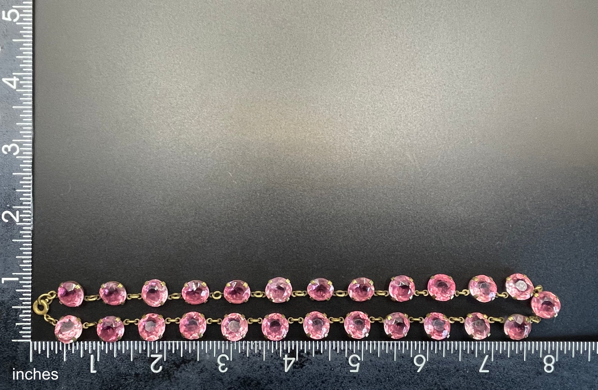 Delicate vintage Art Deco riviere necklace with stunning soft pink coloured crystal stones claw and bezel set in aged gold tone. The rhinestones are set in open-backed settings to allow the light to penetrate.