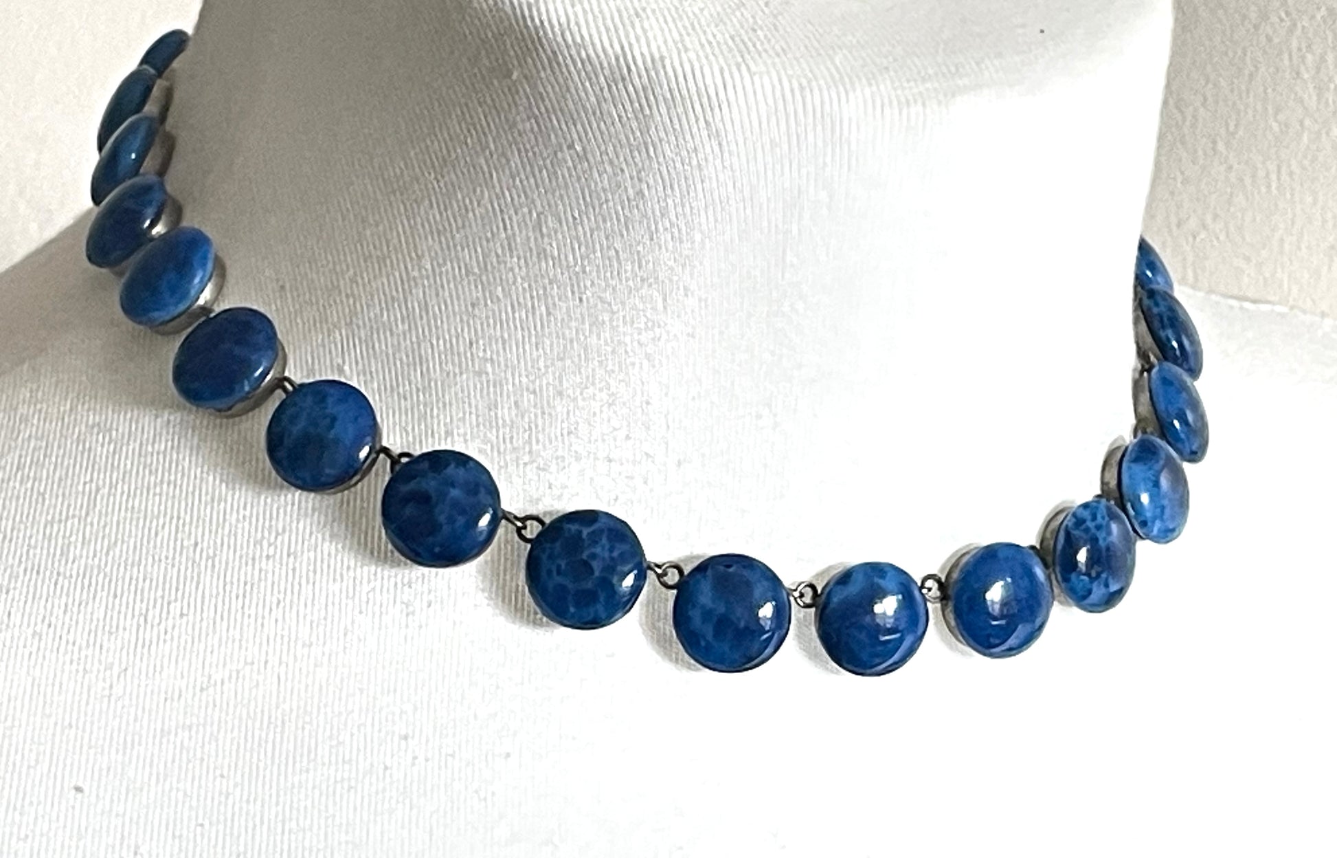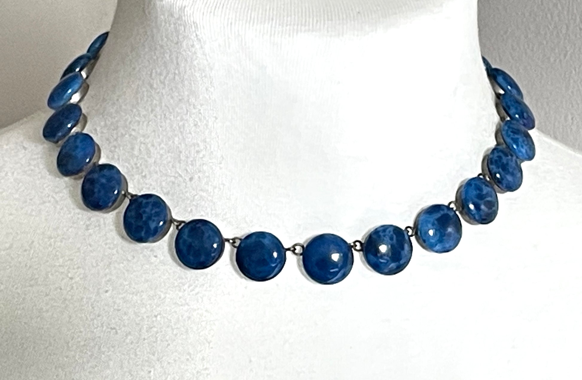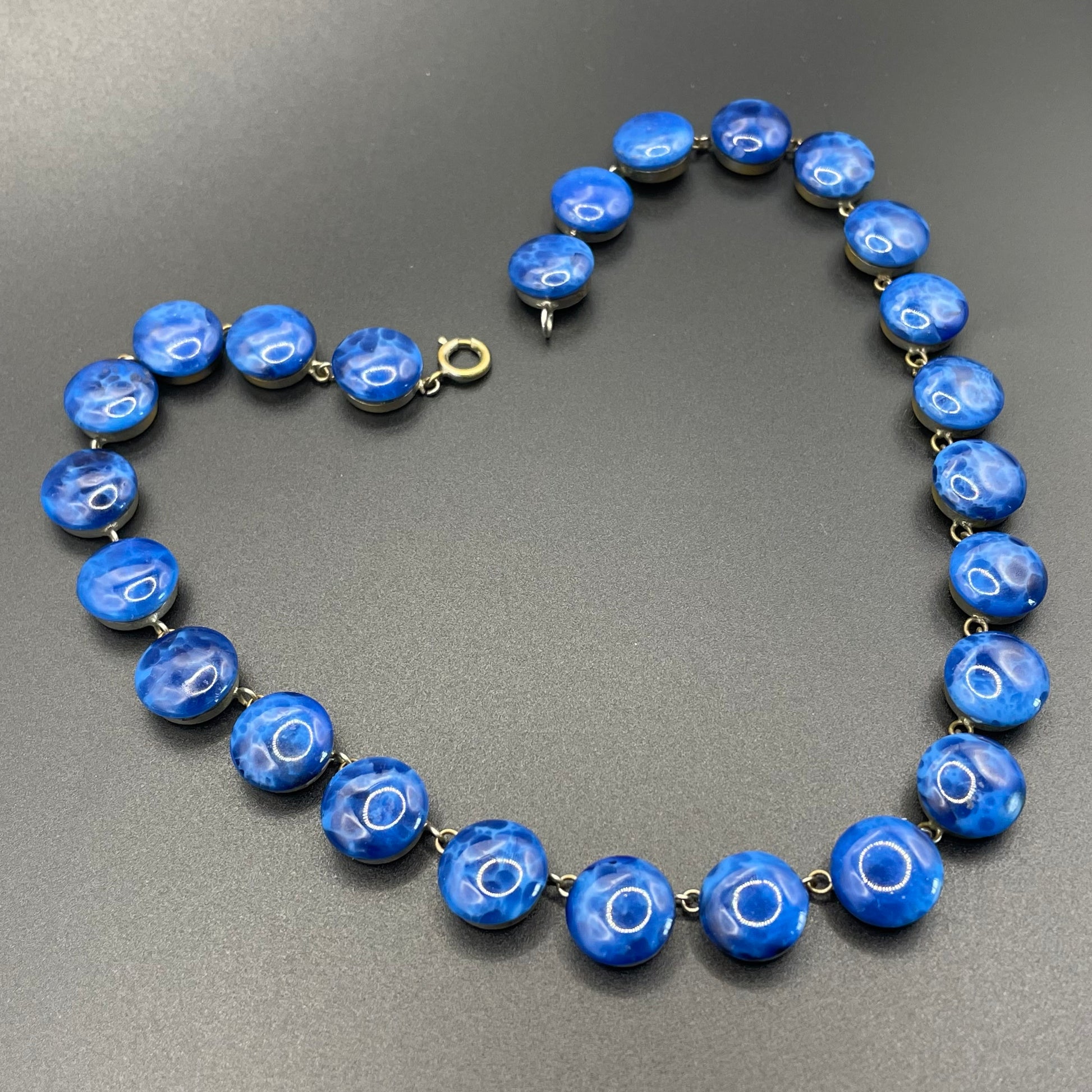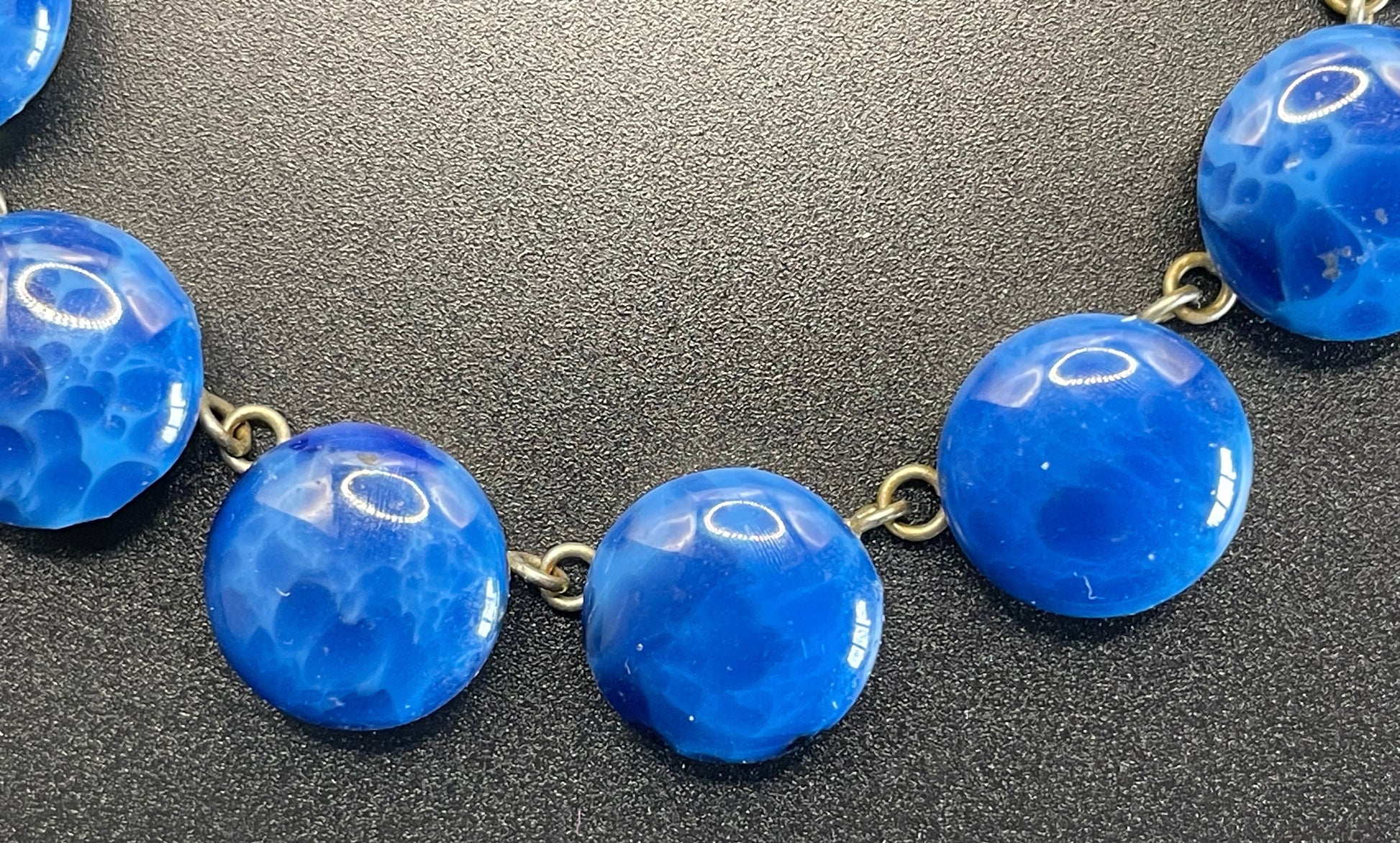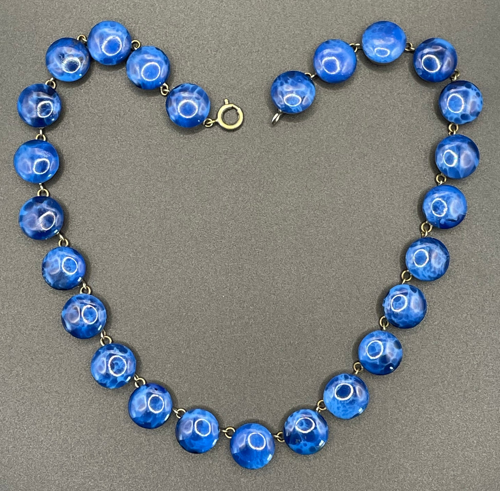 The blue cabochons are such a bright, arresting colour. They have a marbled 'Peking' glass type appearance that looks a little like lapis lazuli. The necklace has a choker length of 16 inches and fastens with a secure gold tone spring ring clasp.