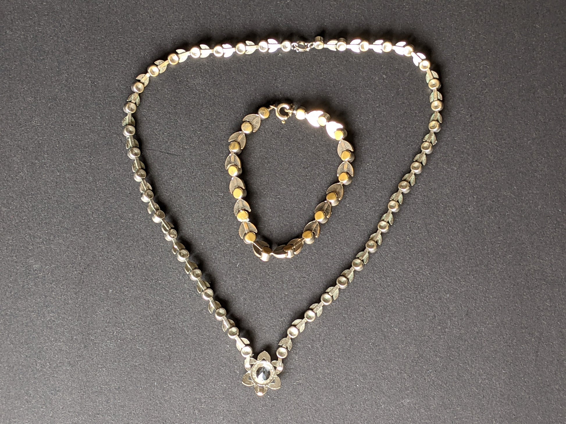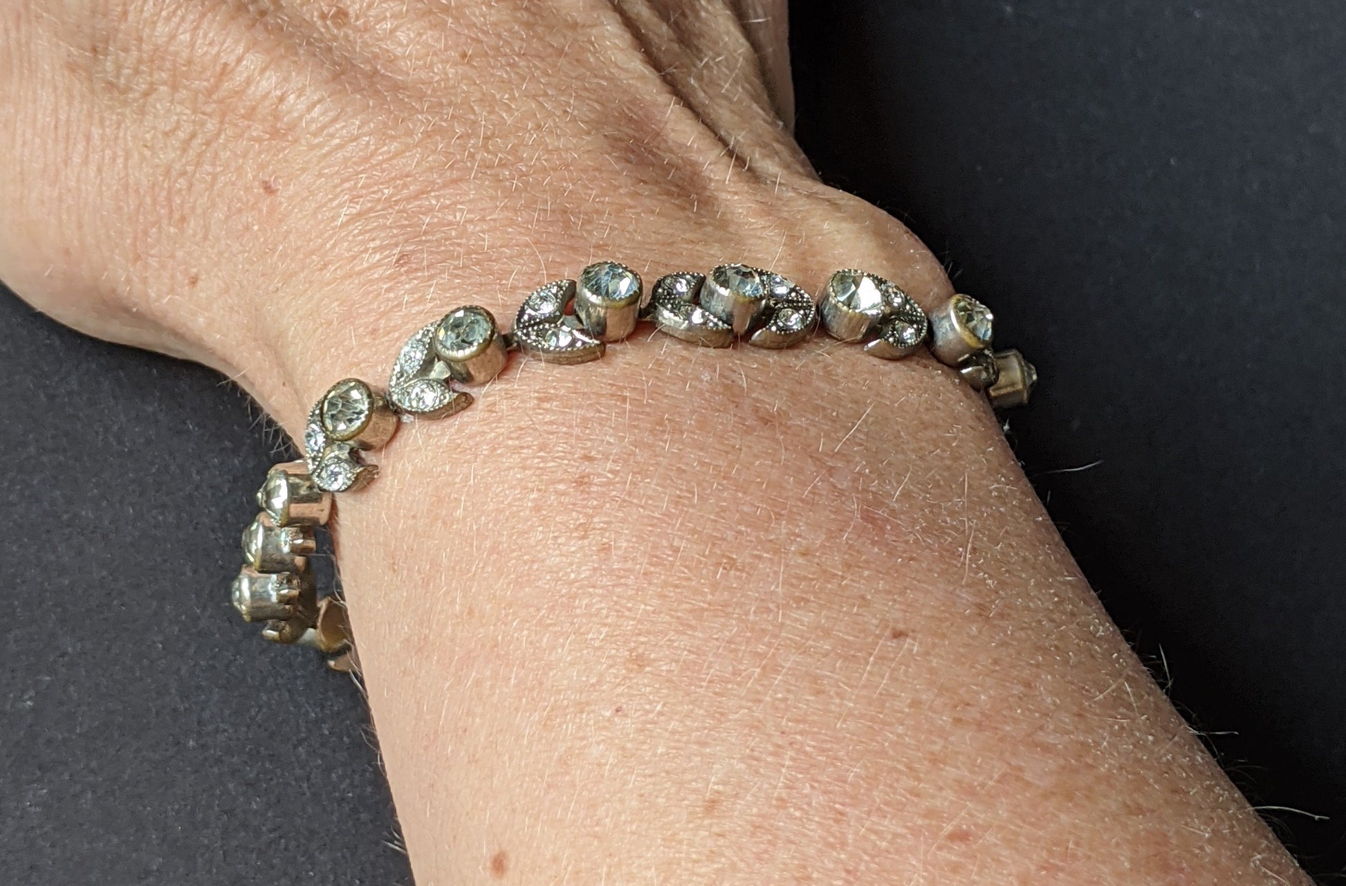 Vintage Art Deco collet set paste and silver tone, bud & leaf design necklace with sunflower centre and bracelet demi-parure, 1920s - 1930s