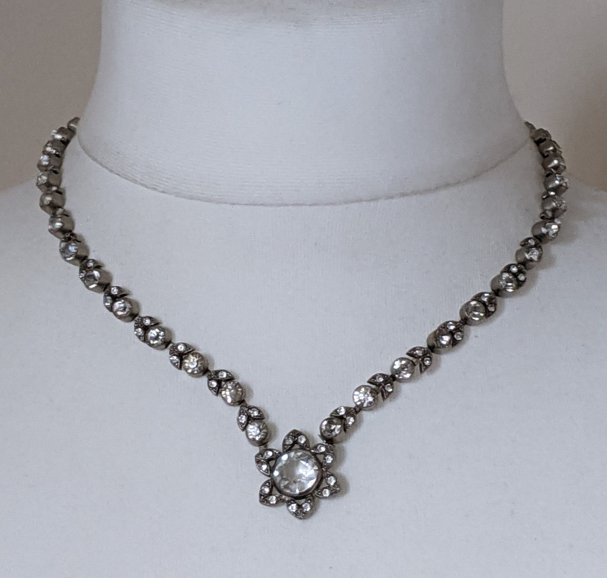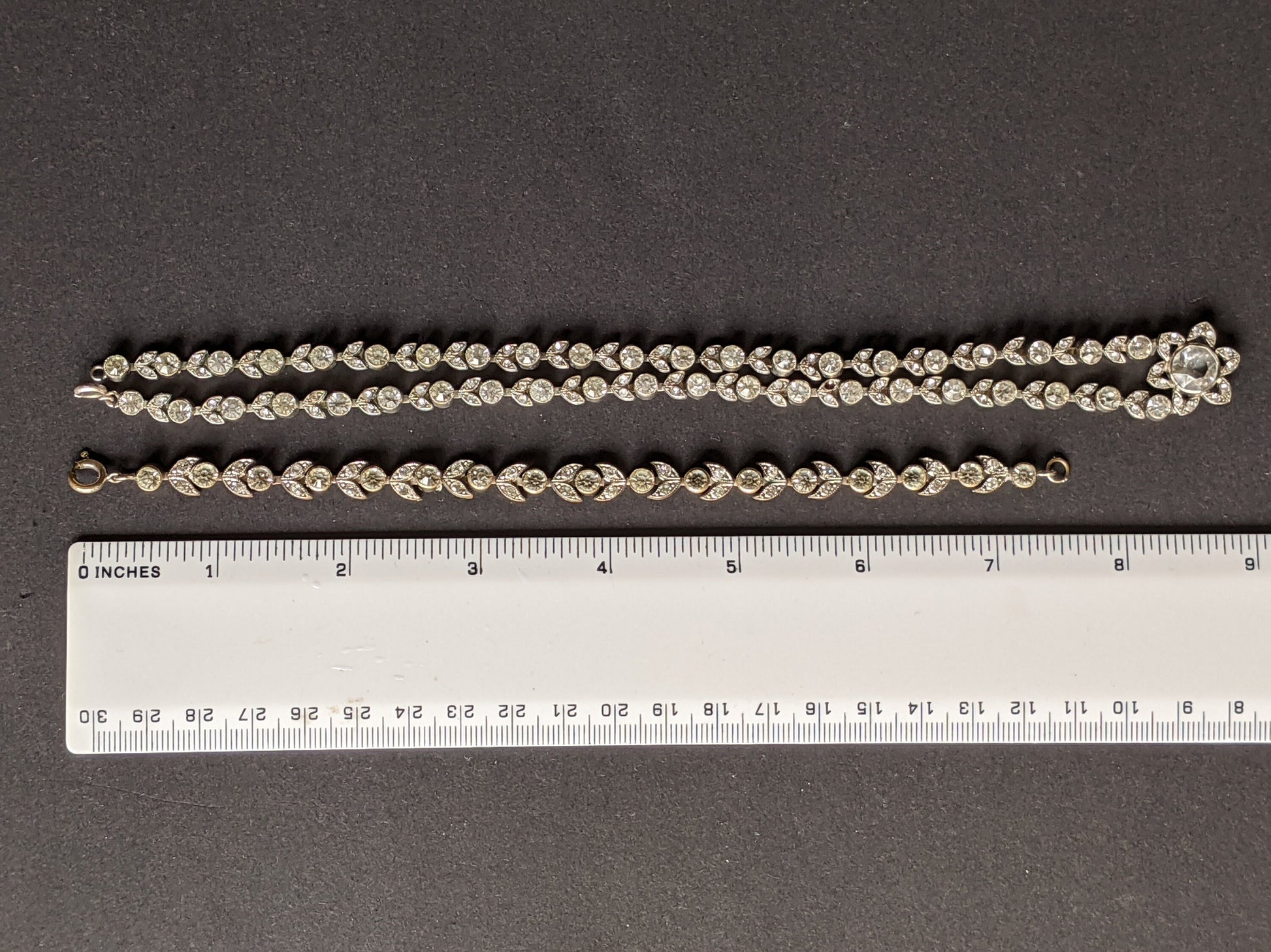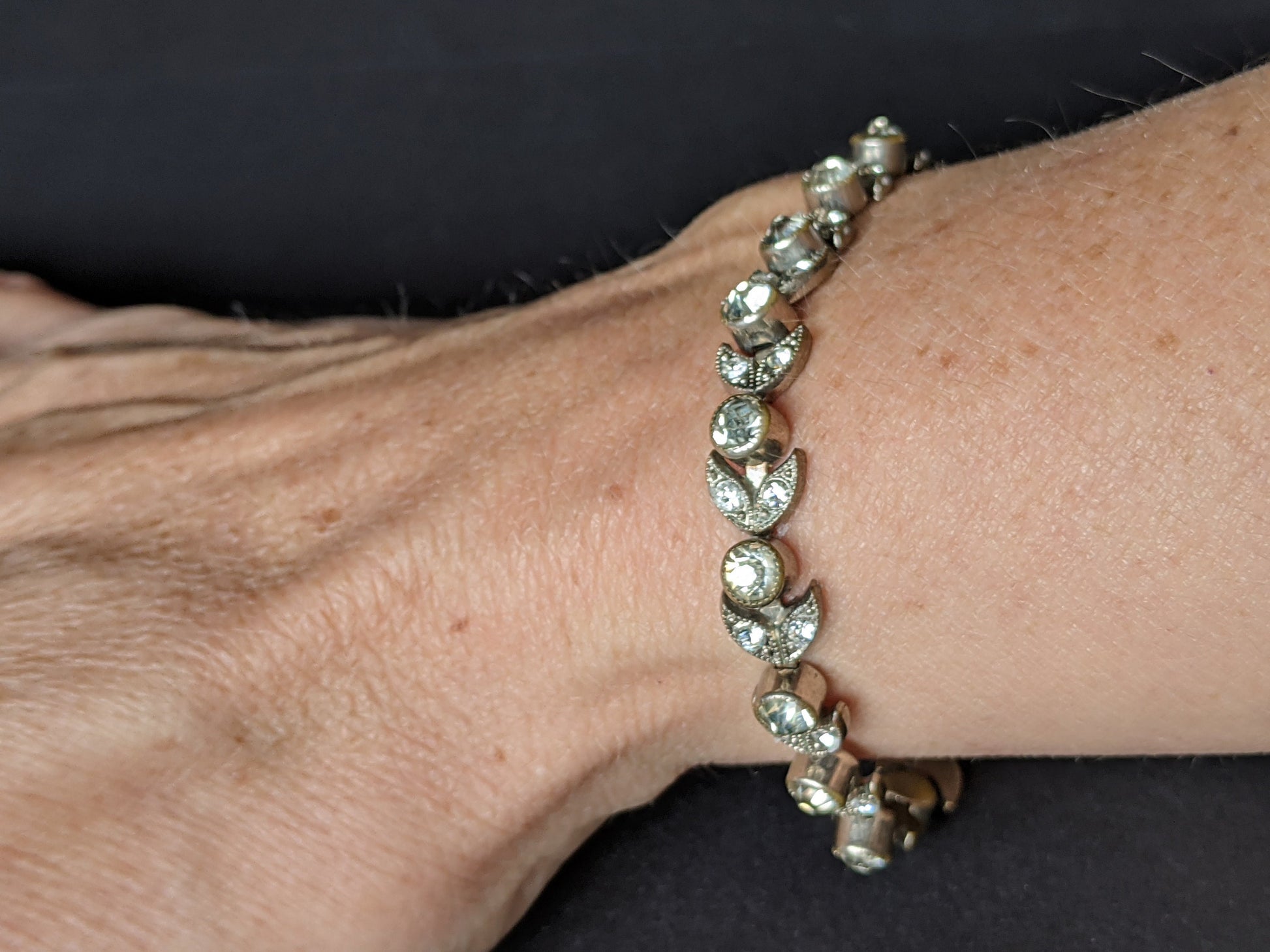 The necklace is a particularly beautiful example with a central floral pendant section with a large and beautiful crystal in the middle and then more rhinestones in the petals. To me, it feels like a sunflower. Both pieces have the same pretty design of silver tone circle settings alternating with pairs of leaf shaped settings, each set with a clear rhinestone. In both pieces, the pairs of leaves reverse their orientation halfway along creating a nice symmetry.