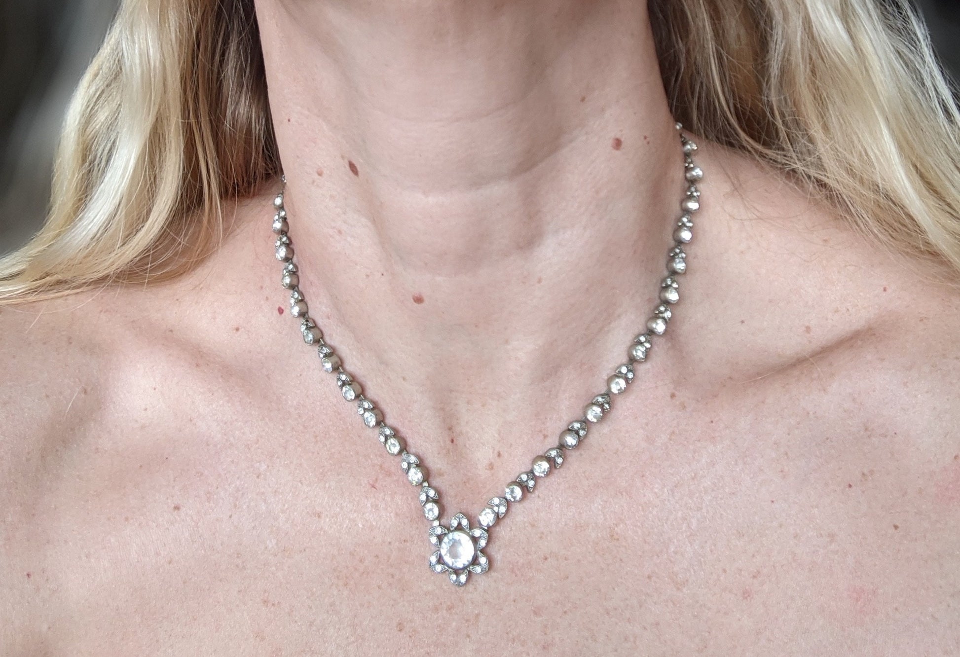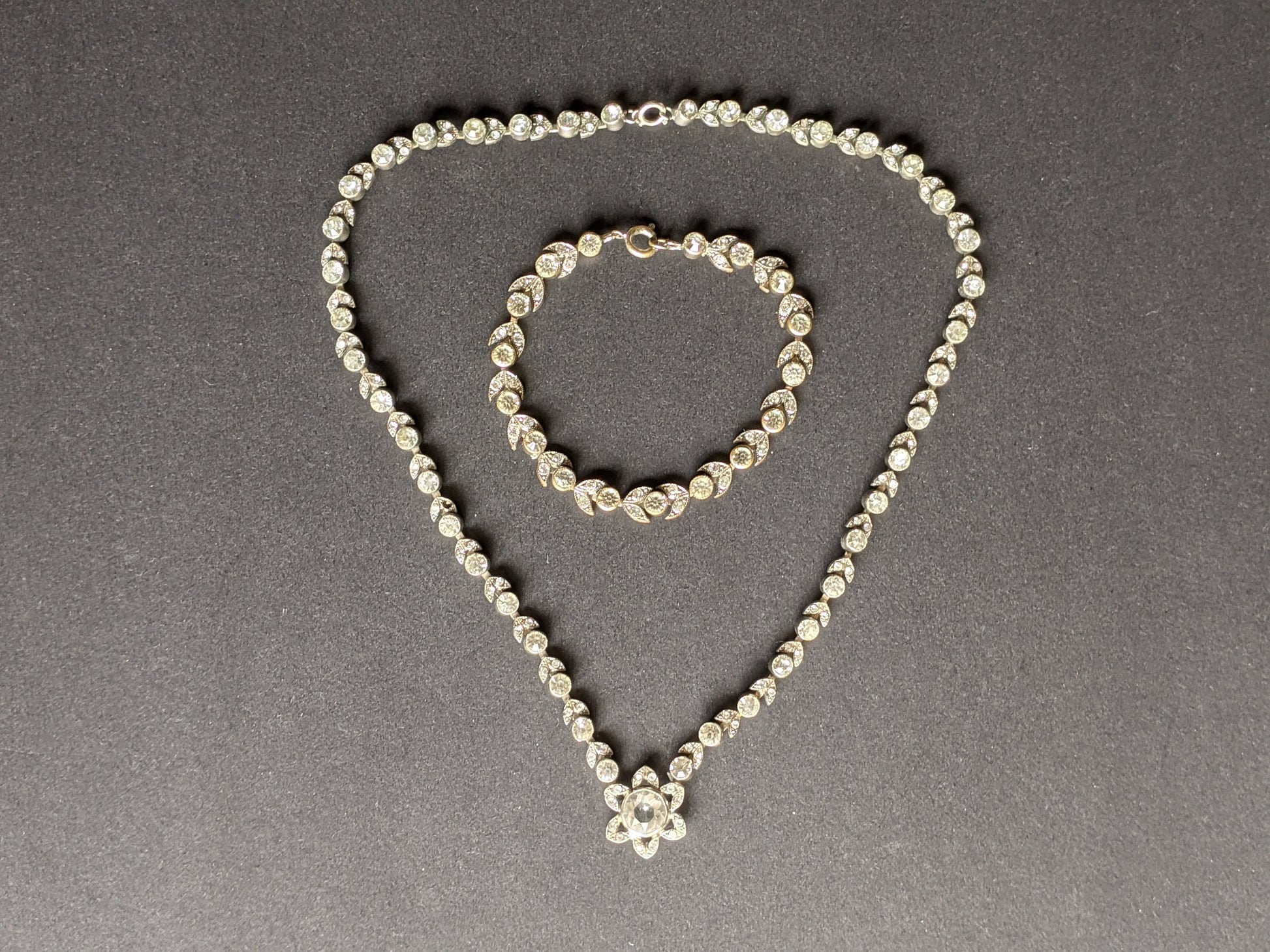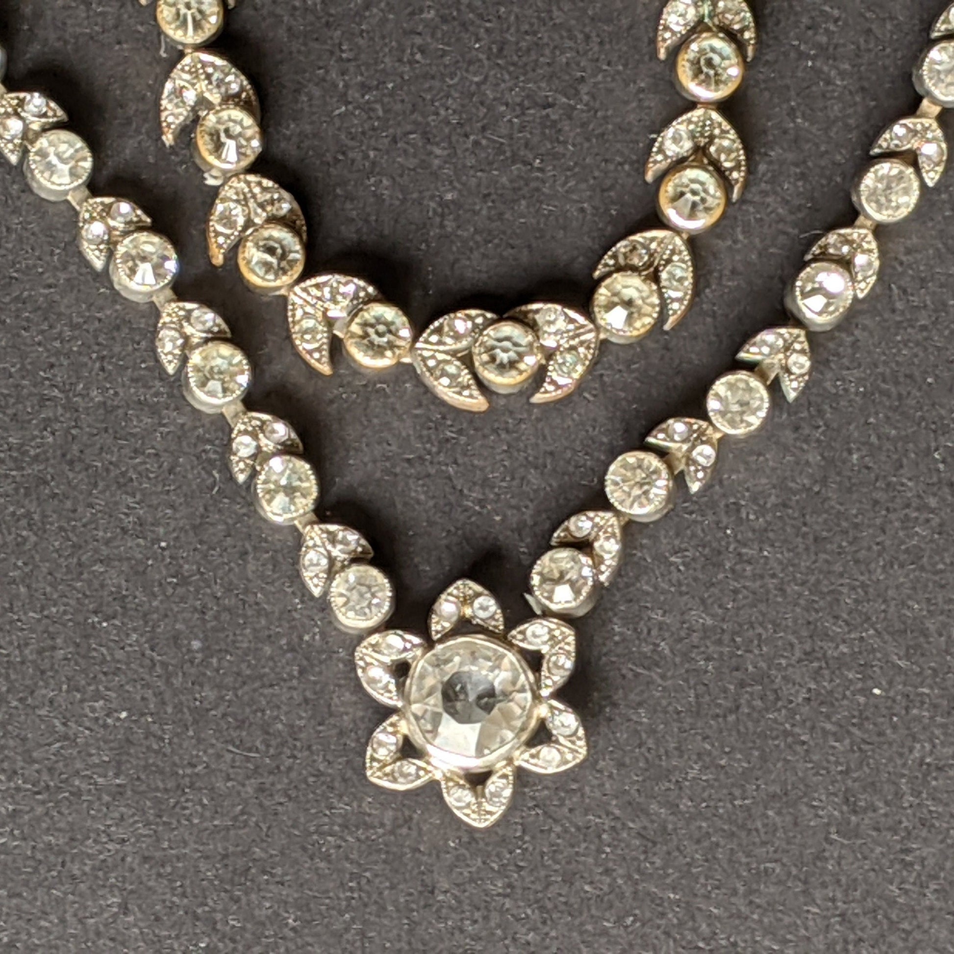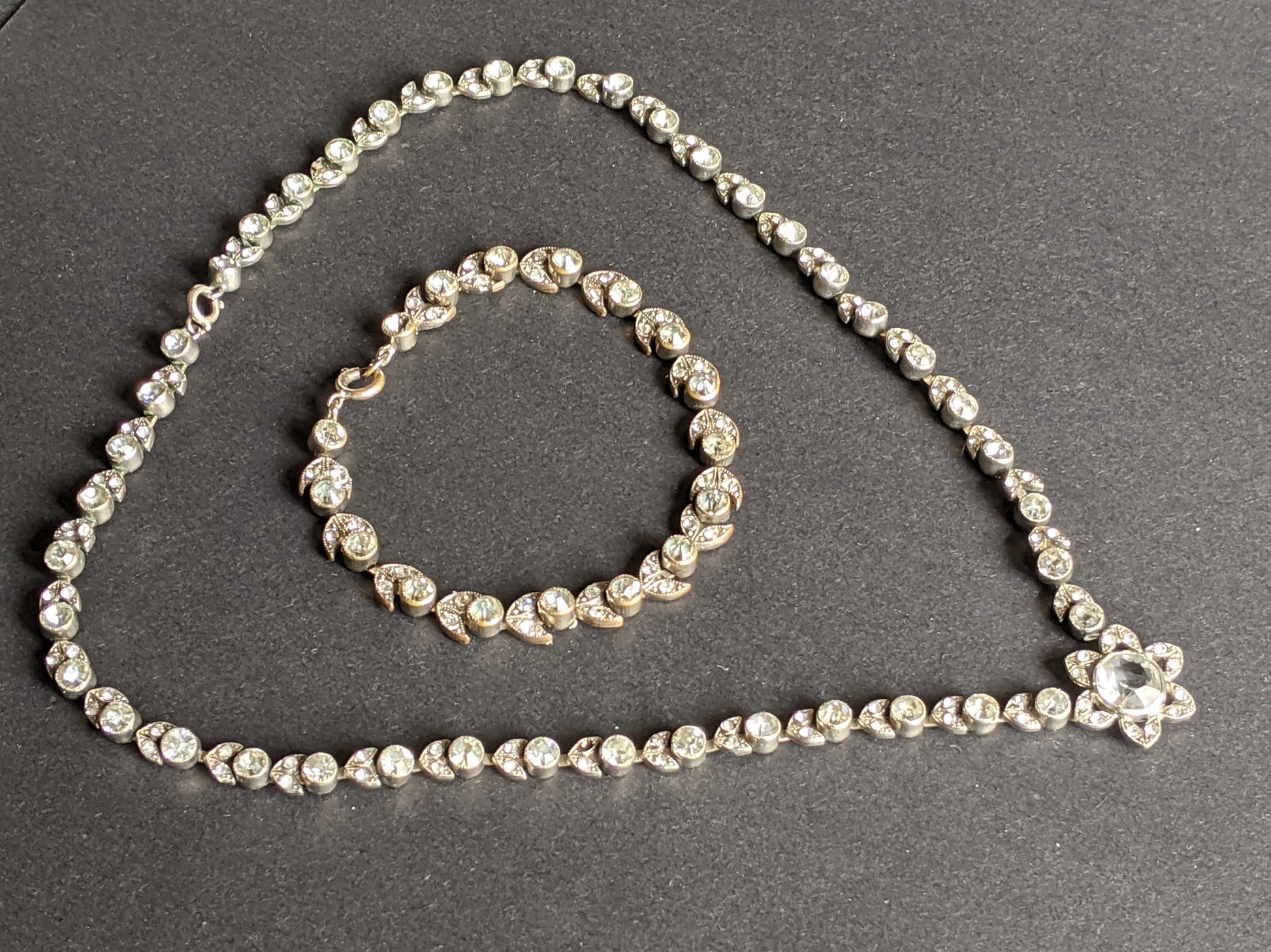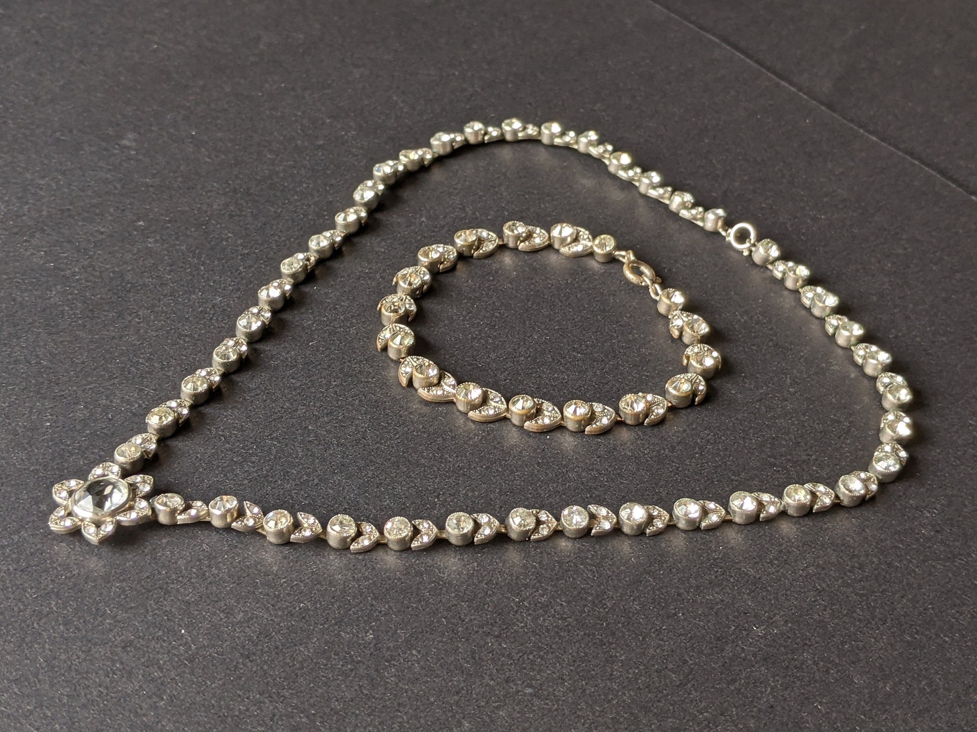 Vintage Art Deco 1920s to 1930s paste and silver tone riviere necklace and bracelet set. The set has a beautiful bud and leaf design that was common at the time - however paste sets like this are not so common as the beautiful cut crystal / lead glass stones often do not survive the decades. These pieces are in very good vintage condition, with all stones present.