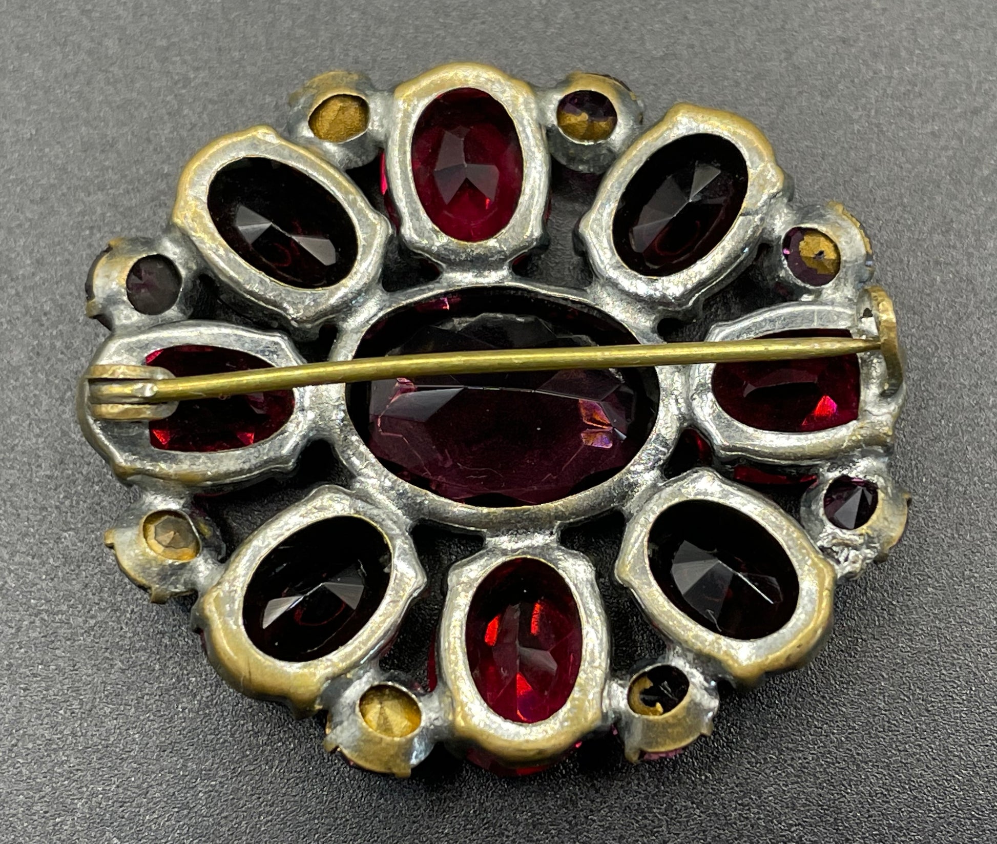 Vintage Art Deco Czech deep purple, violet and pink amethyst glass rhinestone and cabochon brooch pin, stones set open-backed