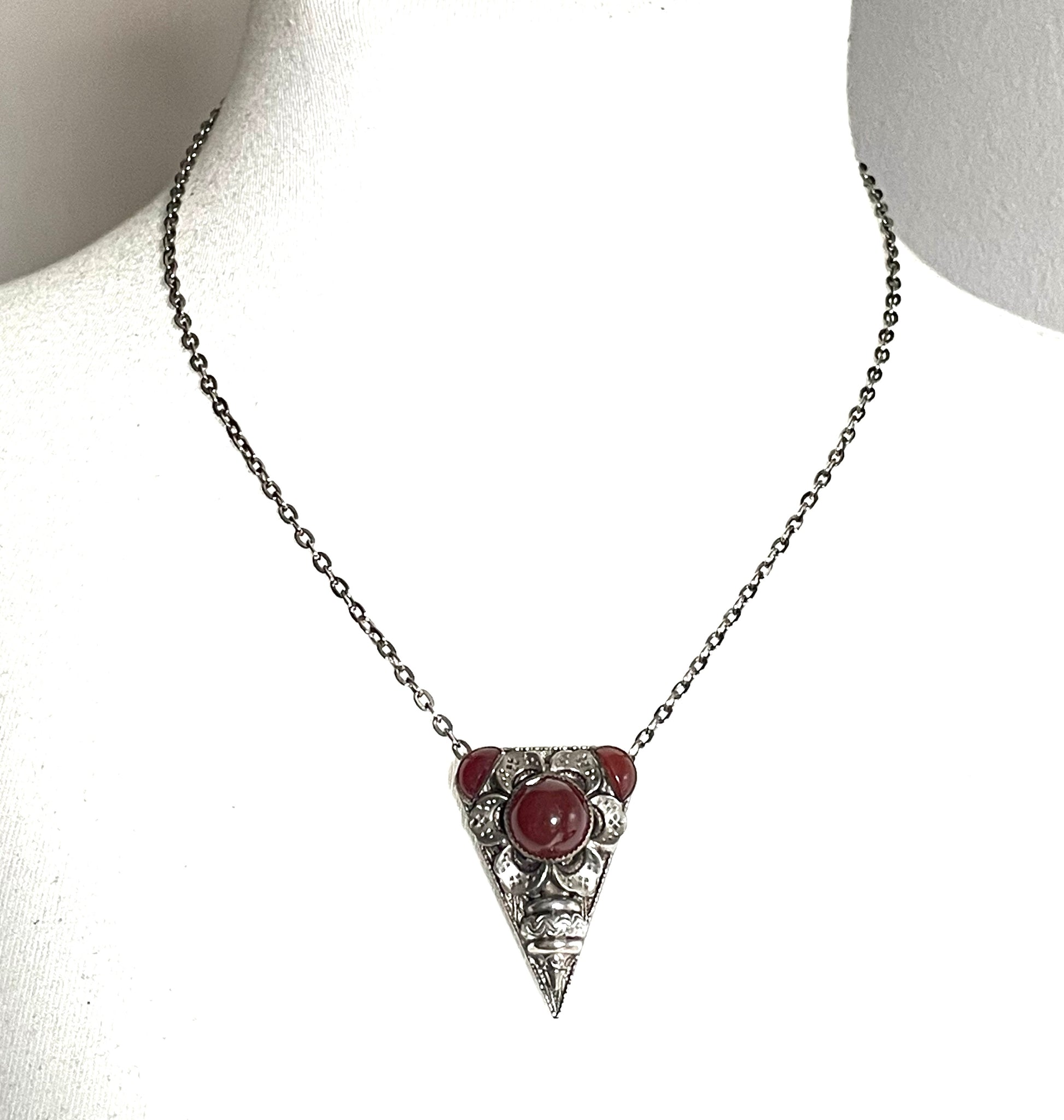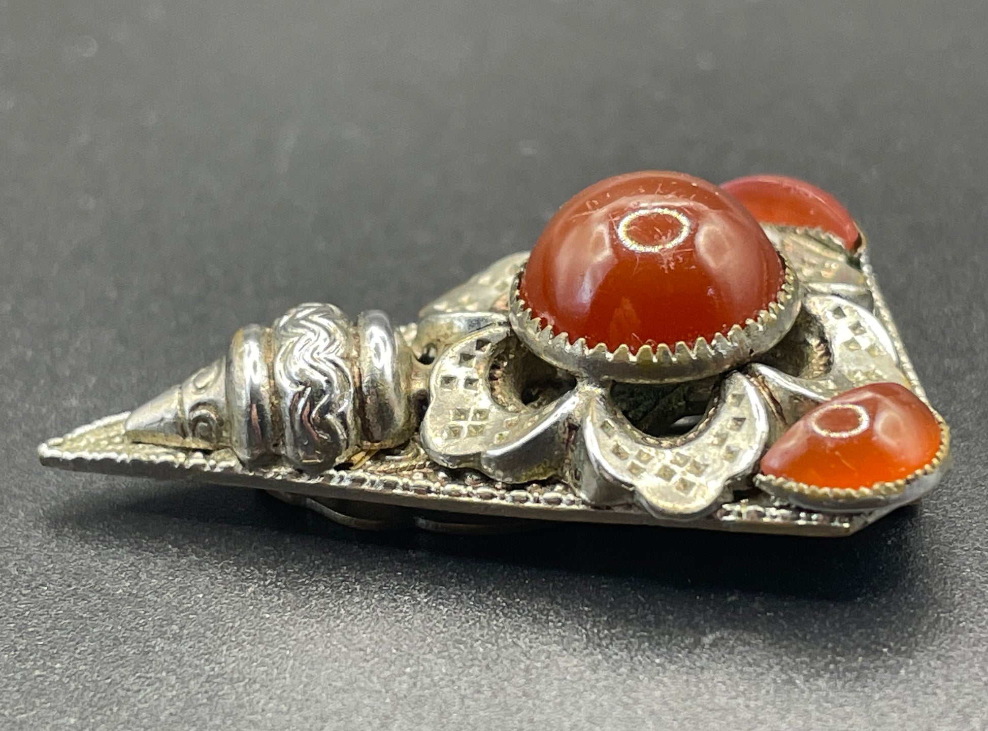 Fabulous vintage Art Deco silver tone and deep orange glass cabochon floral dress clip by Max Neiger. This is such a delicate and detailed piece with many features and techniques of manufacture that suggest it is a Neiger piece. This necklace shows another example of this line of designs: www.etsy.com/uk/listing/1832754485