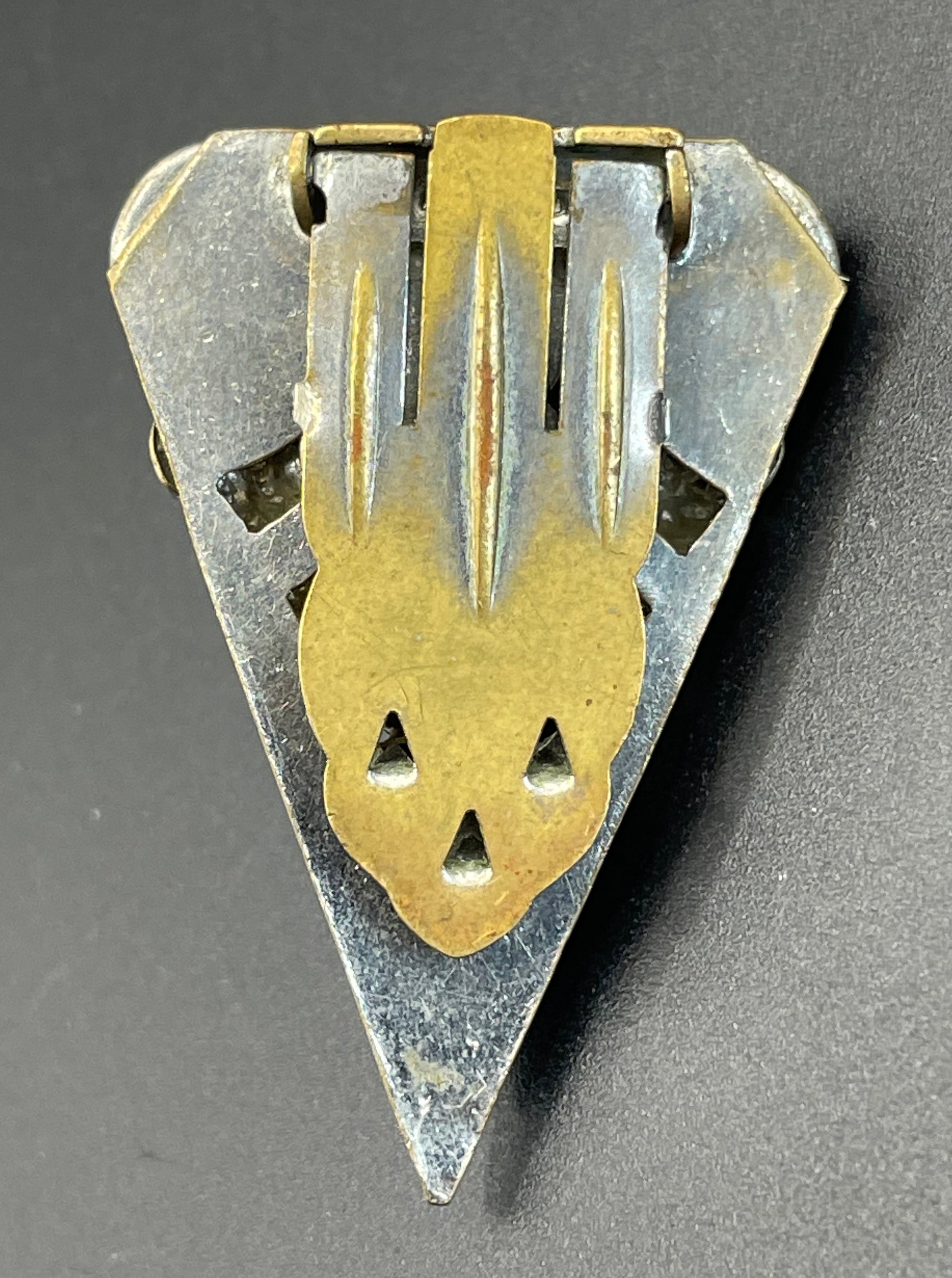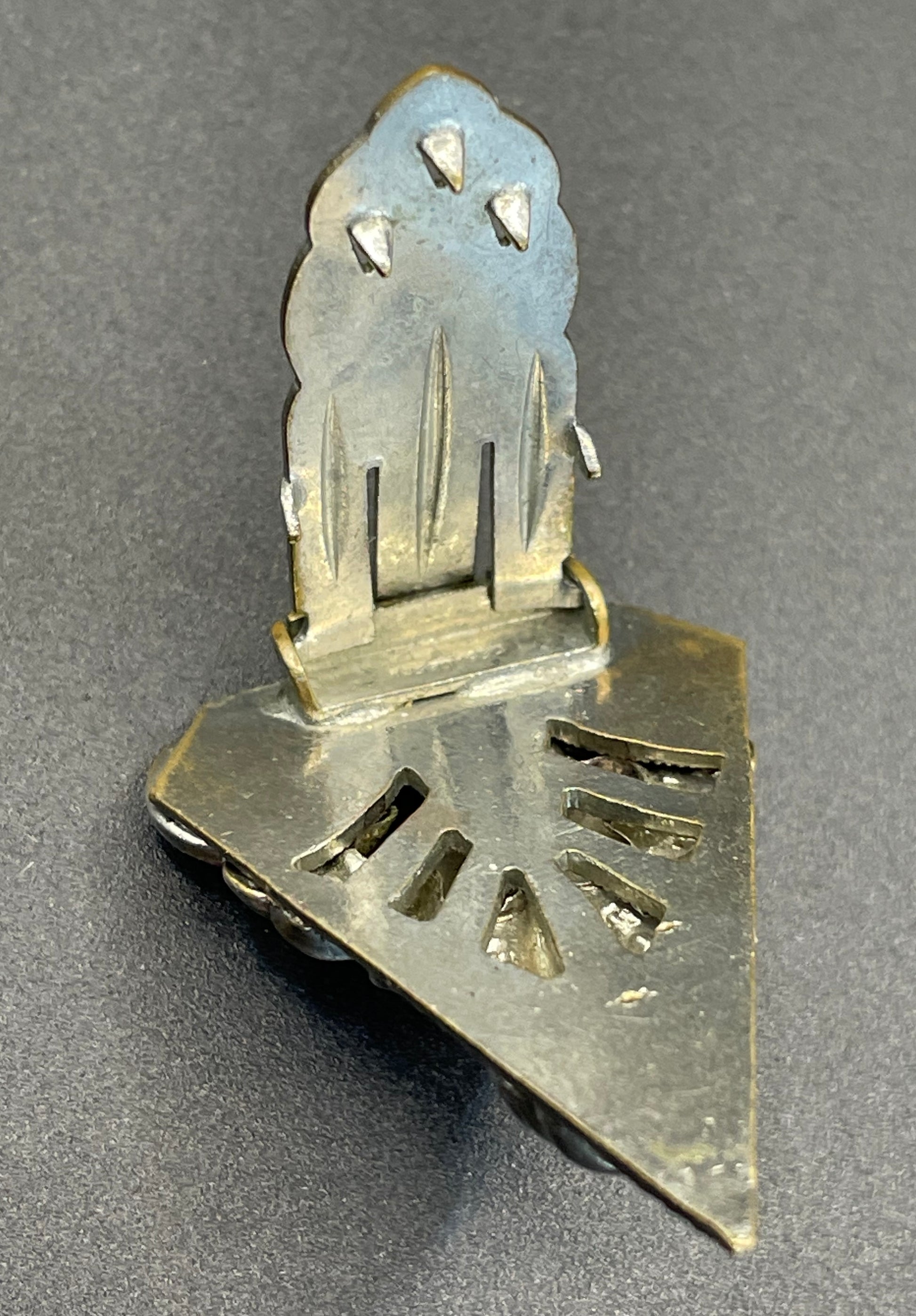 There is a word stamped into the metal on the reverse, just underneath the clip hinge. I can't make it out, but it would most likely say 'Czechoslovakia' or 'Czechoslovak' as with some other pieces like this. It is about 1.5 inches long and 1 inch wide.