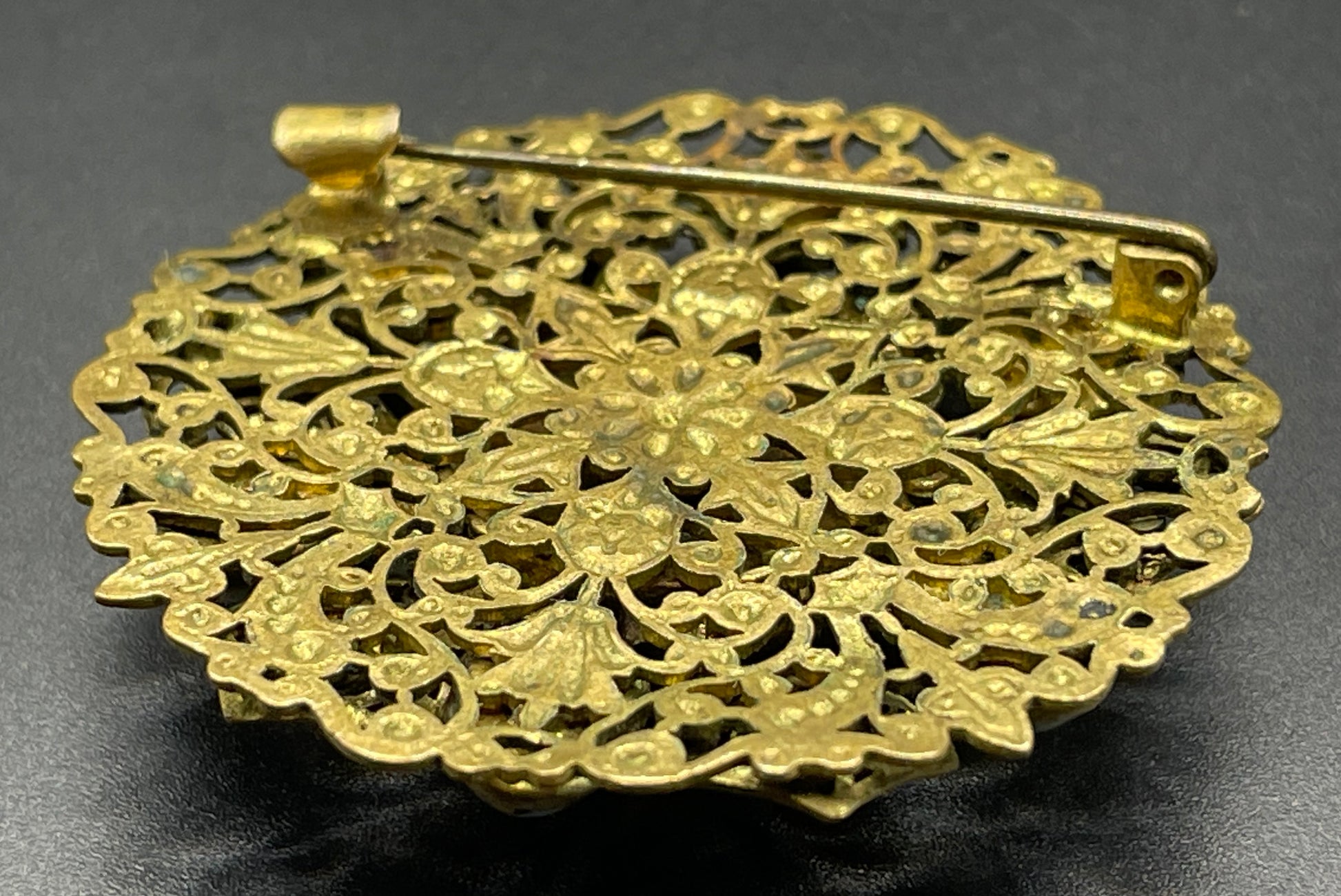 It is beautifully designed and produced. The circular filigree base is embellished with a large central turquoise glass round cabochon surrounded by smaller oval glass cabochons with pale blue enamel decoration for some of the floral filigree design around. It has a diameter of about 1 3/4 inches.