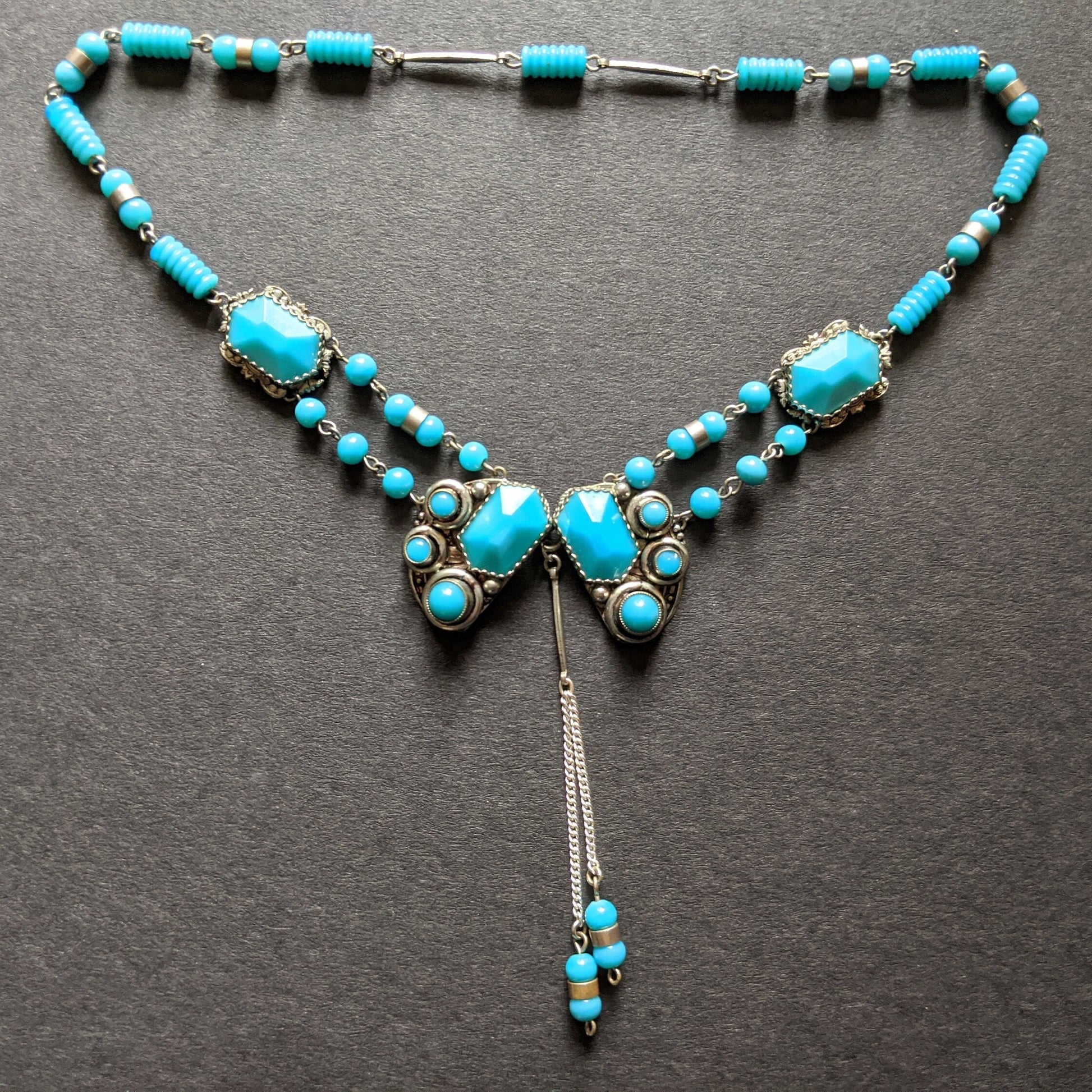 Vintage Art Deco Czech Neiger Brothers style turquoise glass and silver tone negligee necklace, front fastening (plus free gift earrings)