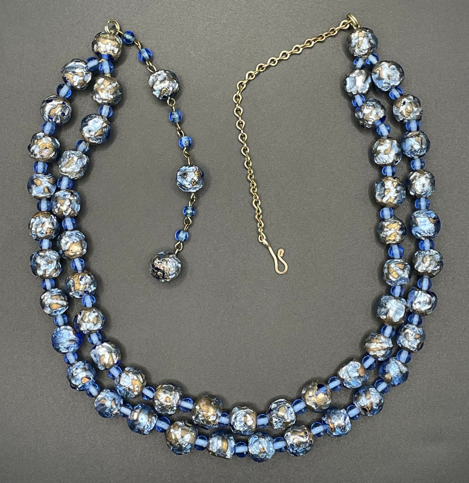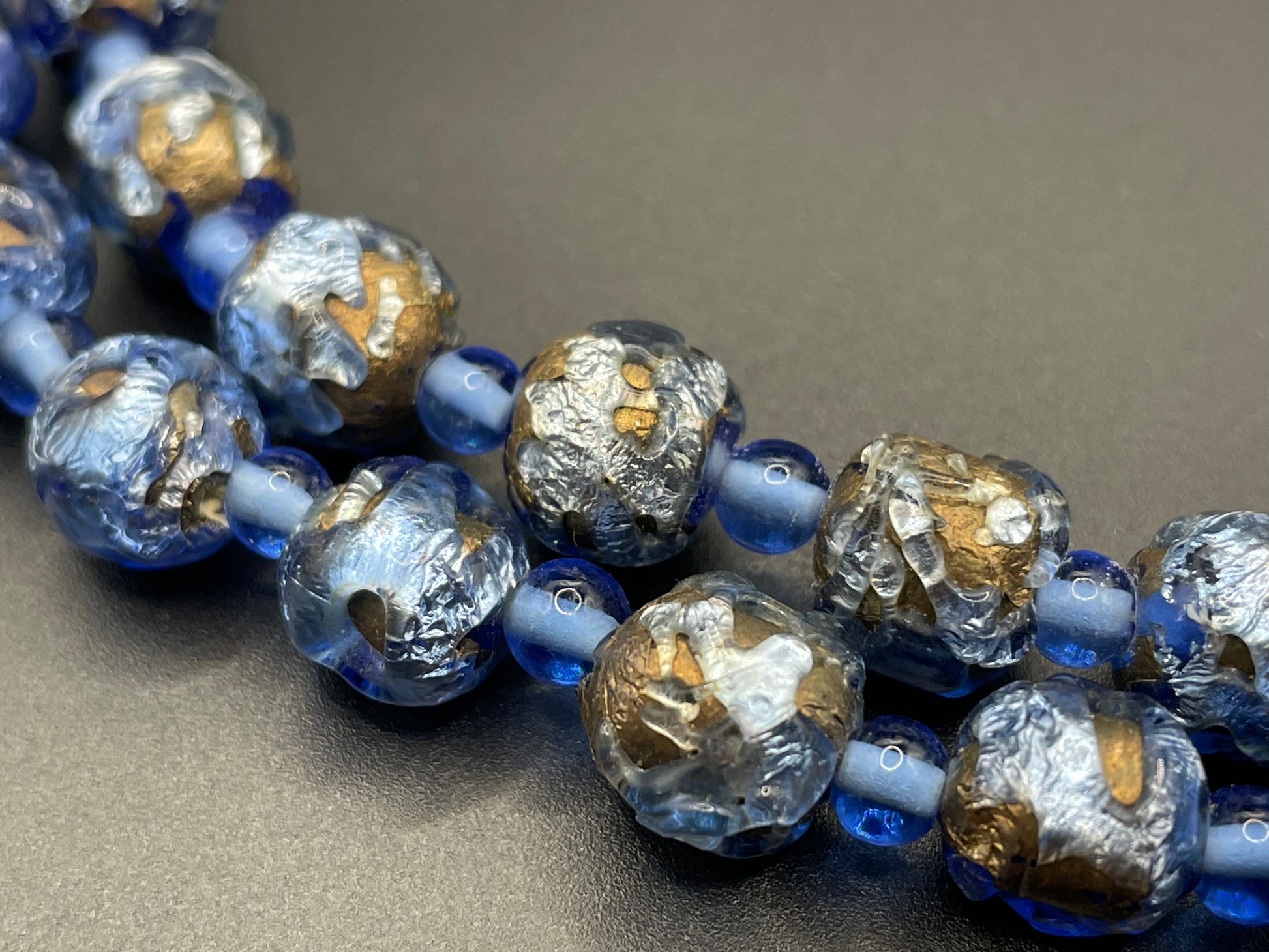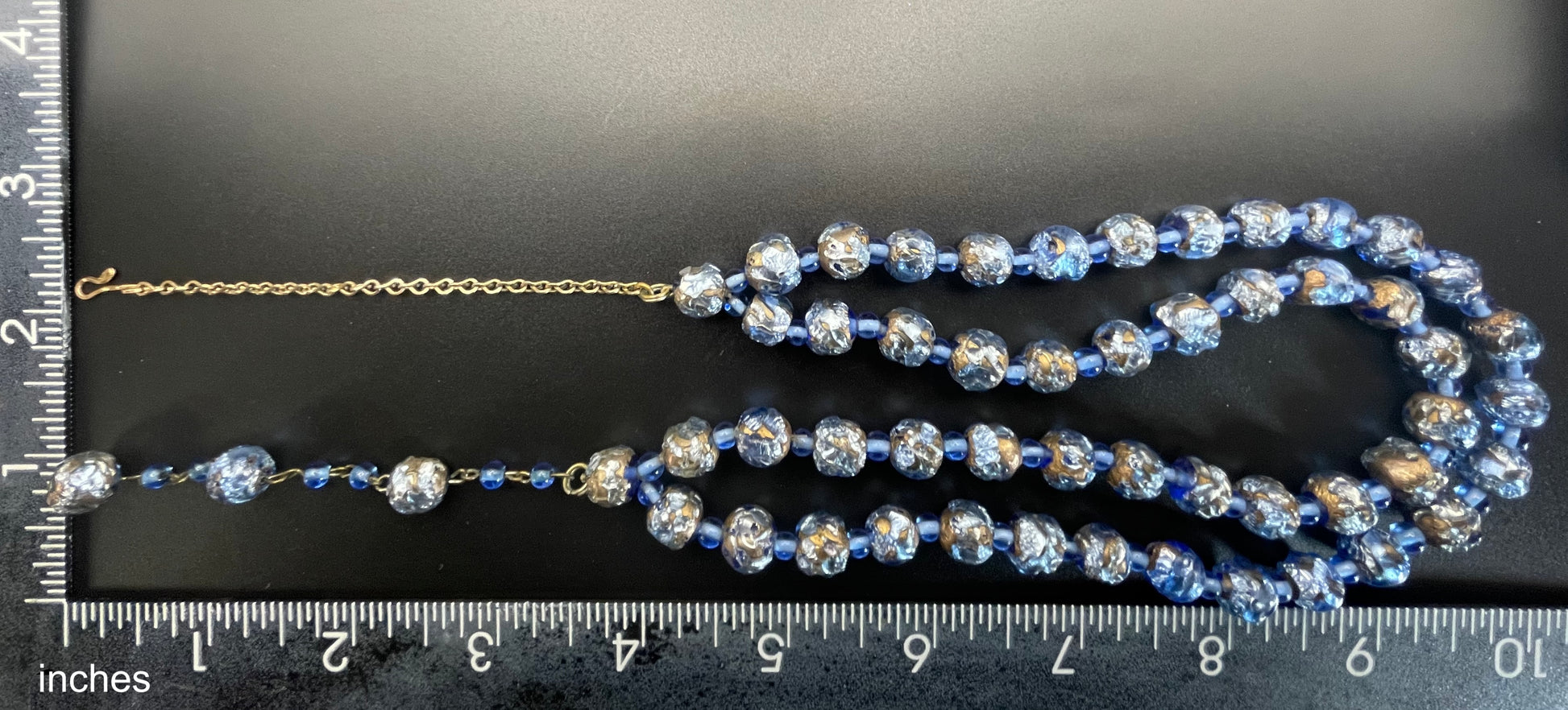 Vintage Art Deco double strand gold and shades of blue foiled glass beaded necklace, beautiful beads